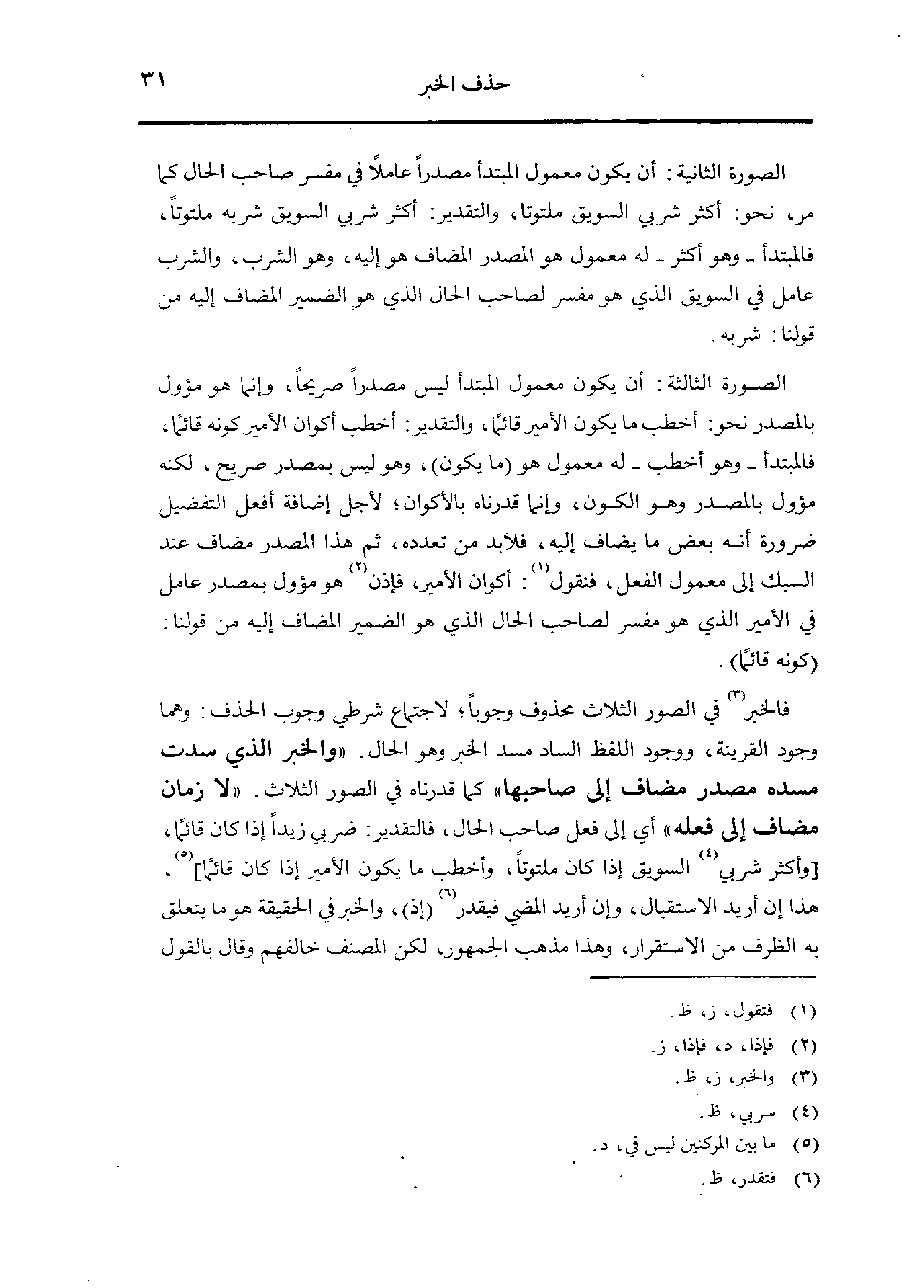 الصورة الثانية: أن يكون معمول المبتدأ مصدرًا عاملًا في مفسر صاحب الحال كما مر، نحو: أكثر شربي السويق ملتوتا، والتقدير: أكثر شربي السويق شربه ملتوتًا، فالمبتدأ - وهو أكثر - له معمول هو المصدر المضاف هو إليه، وهو الشرب، والشرب عامل في السويق الذي هو مفسر لصاحب الحال الذي هو الضمير المضاف إليه من قولنا: شربه.
