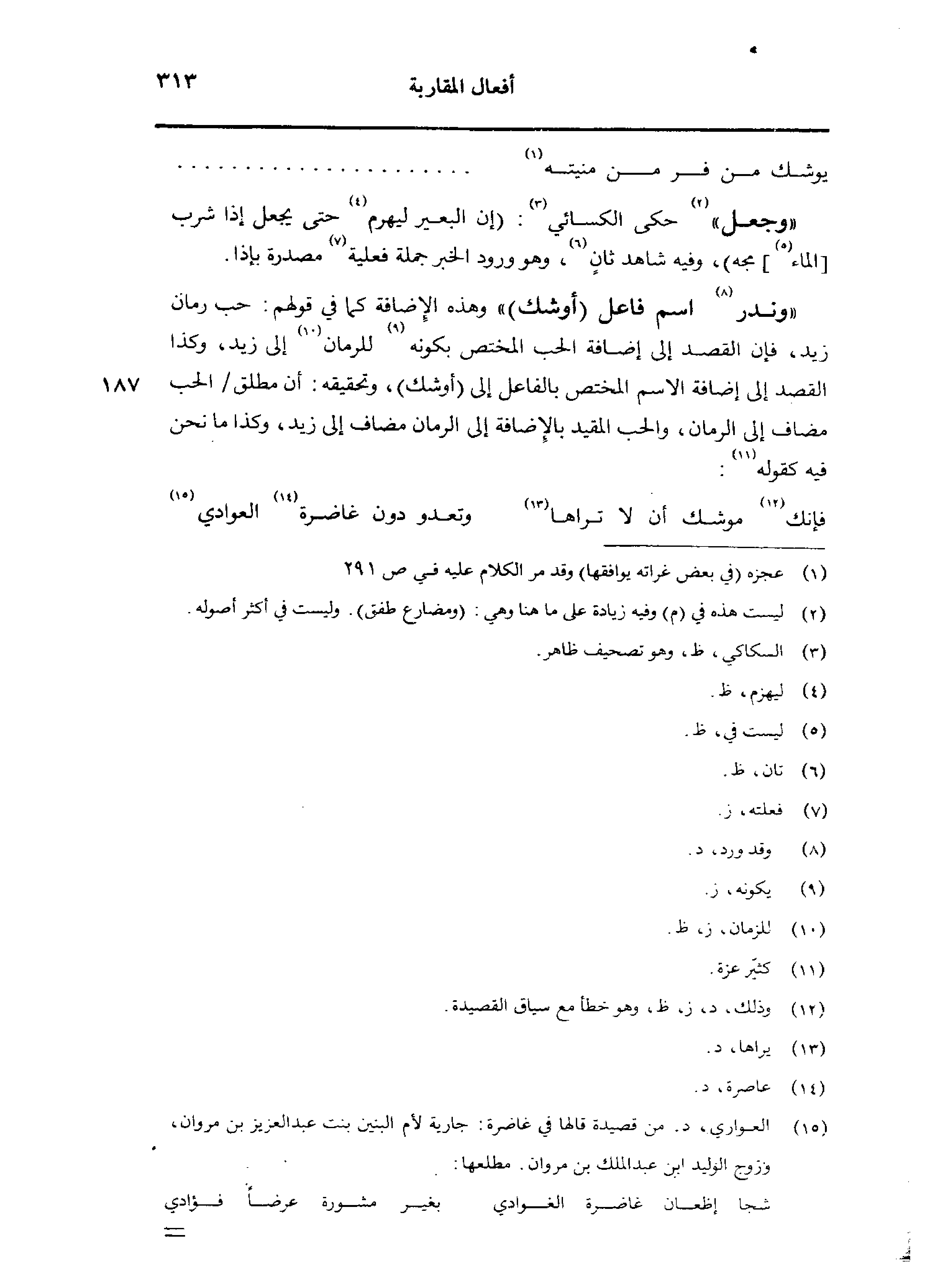 «وندر اسم فاعل (اوشك)» وهذه الإضافة كما في قولهم: حب زمان زيد، فإن القصد إلى إضافة الحب المختص بكونه للرمان إلى زيد، وكذا القصد إلى إضافة الاسم المختص بالفاعل إلى (أوشك)، وتحقيقه: أن مطلق / الحب مضاف إلى الرمان، والحب المقيد بالإضافة إلى الرمان مضاف إلى زيد، وكذا ما نحن فيه كقوله: