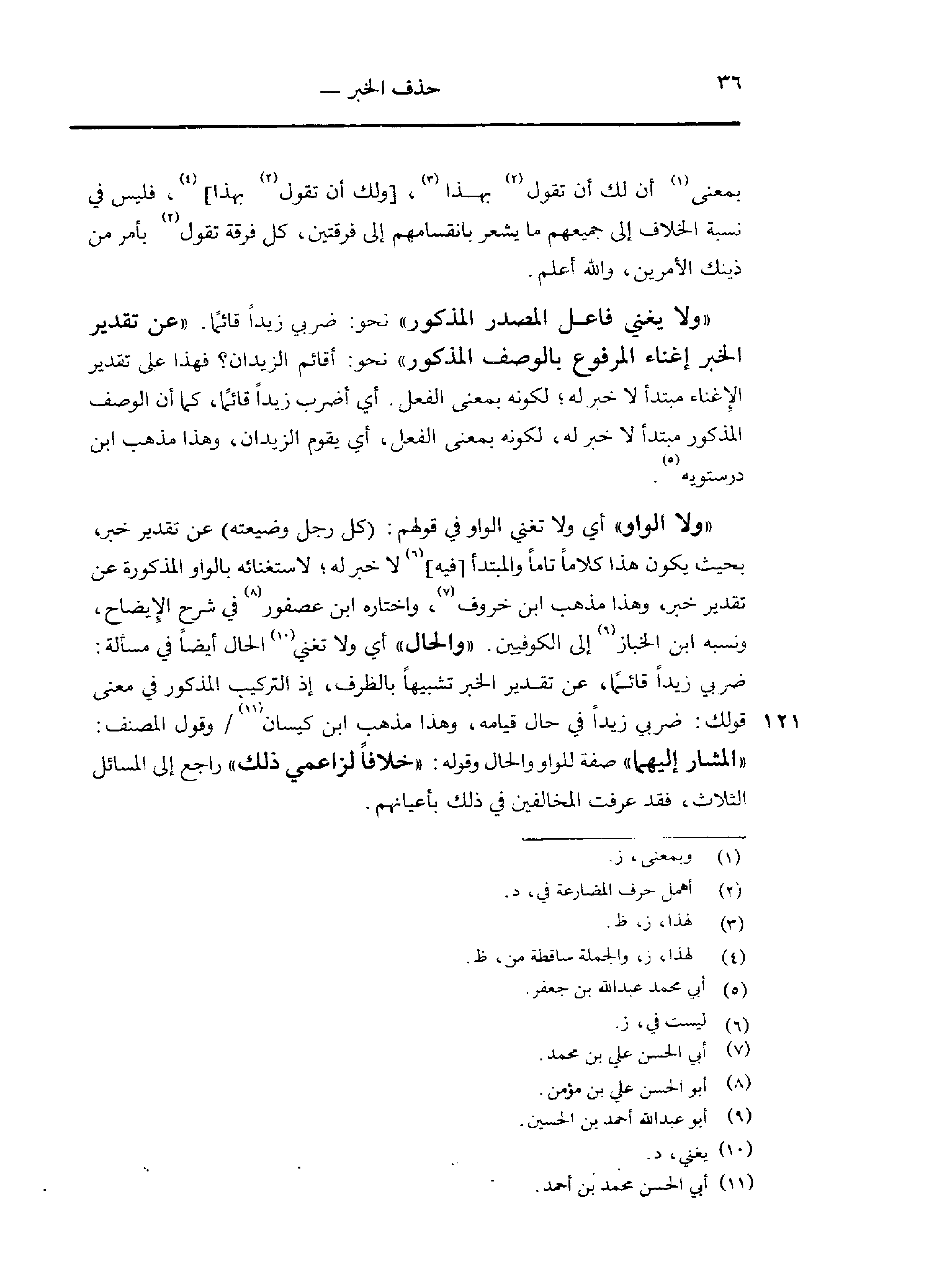 «ولا الواو» أي ولا تغني الواو في قولهم: (كل رجل وضيعته) عن تقدير خبر، بحيث يكون هذا كلامًا والمبتدأ [فيه] لا خبر له؛ لاستغنائه بالواو المذكورة عن تقدير خبر، وهذا مذهب ابن خروف، واختاره ابن عصفور في شرح الإيضاح، ونسبه ابن الخباز إلى الكوفيين. «والحال» أي ولا تغني الحال أيضًا في مسألة: ضربي زيدًا قائمًا، عن تقدير الخبر تشبيهًا بالظرف، إذ التركيب المذكور في معنى 121 قولك: ضربي زيدًا في حال قيامه، وهذا مذهب ابن كيسان/ وقل المصنف: «المشار إليهما» صفة للواو والحال وقوله: «خلافًا لزاعمي ذلك» راجع إلى المسائل الثلاث، فقد عرفت المخالفين في ذلك بأعيانهم.