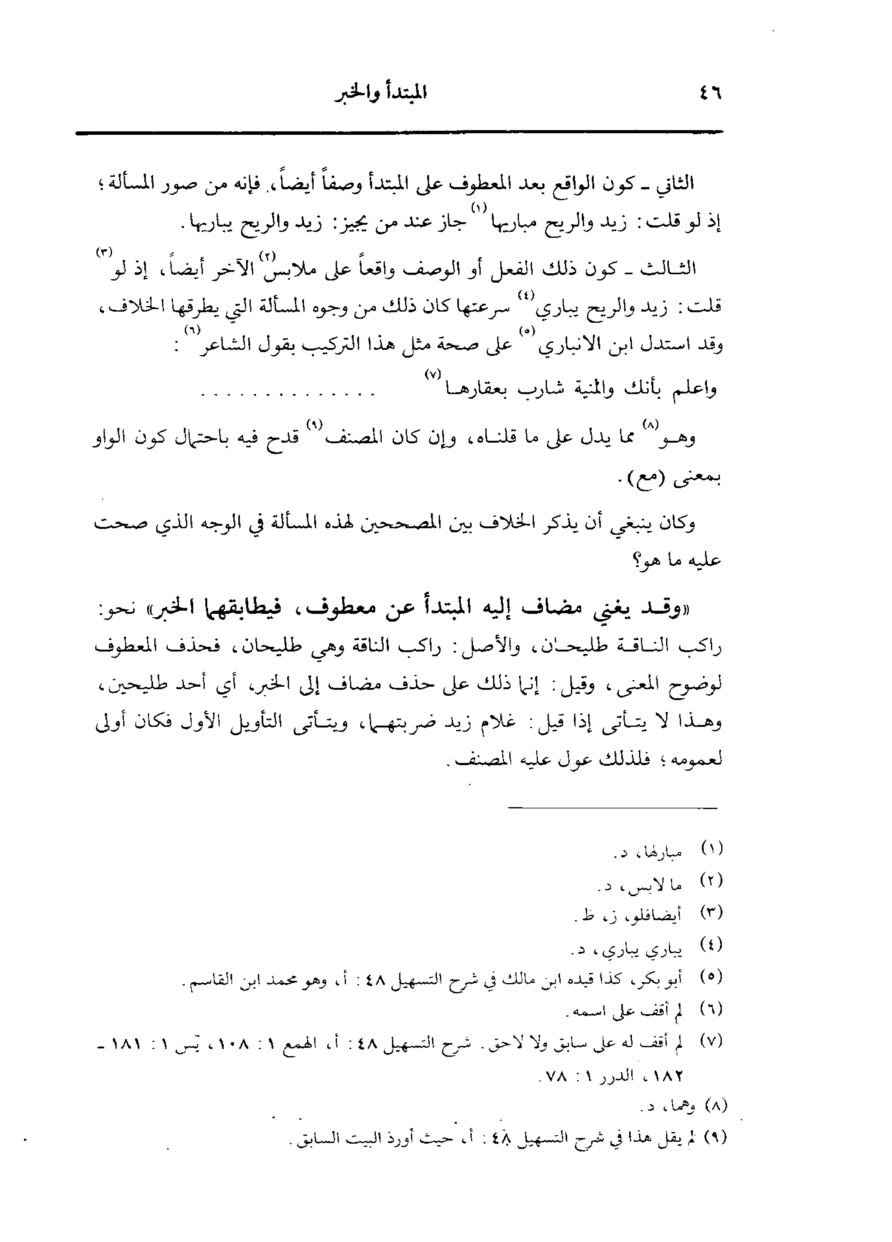 الثاني - كون الواقع بعد المعطوف على المبتدأ وصفًا أيضًا، فإنه من صور المسألة؛ إذ لو قلت: زيد والريح مباريها جاز عند من يجيز: زيد والريح يباريها.