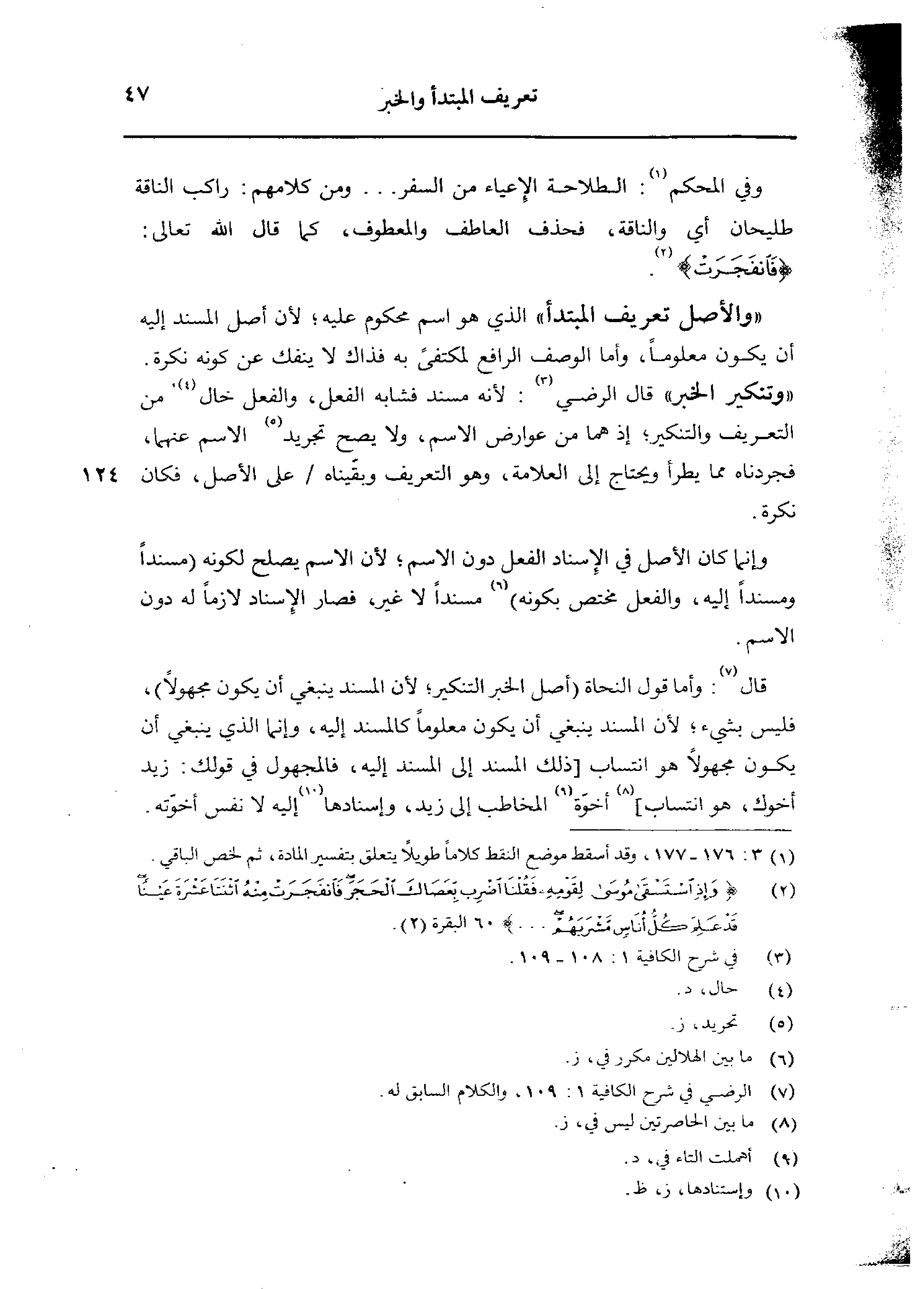«والأصل تعريف المبتدأ» الذي هو اسم محكوم عليه؛ لأن أصل المسند إليه أن يكون معلومًا، وأما الوصف الرافع لمكتفئ به فذاك لا ينفك عن كونه نكرة.