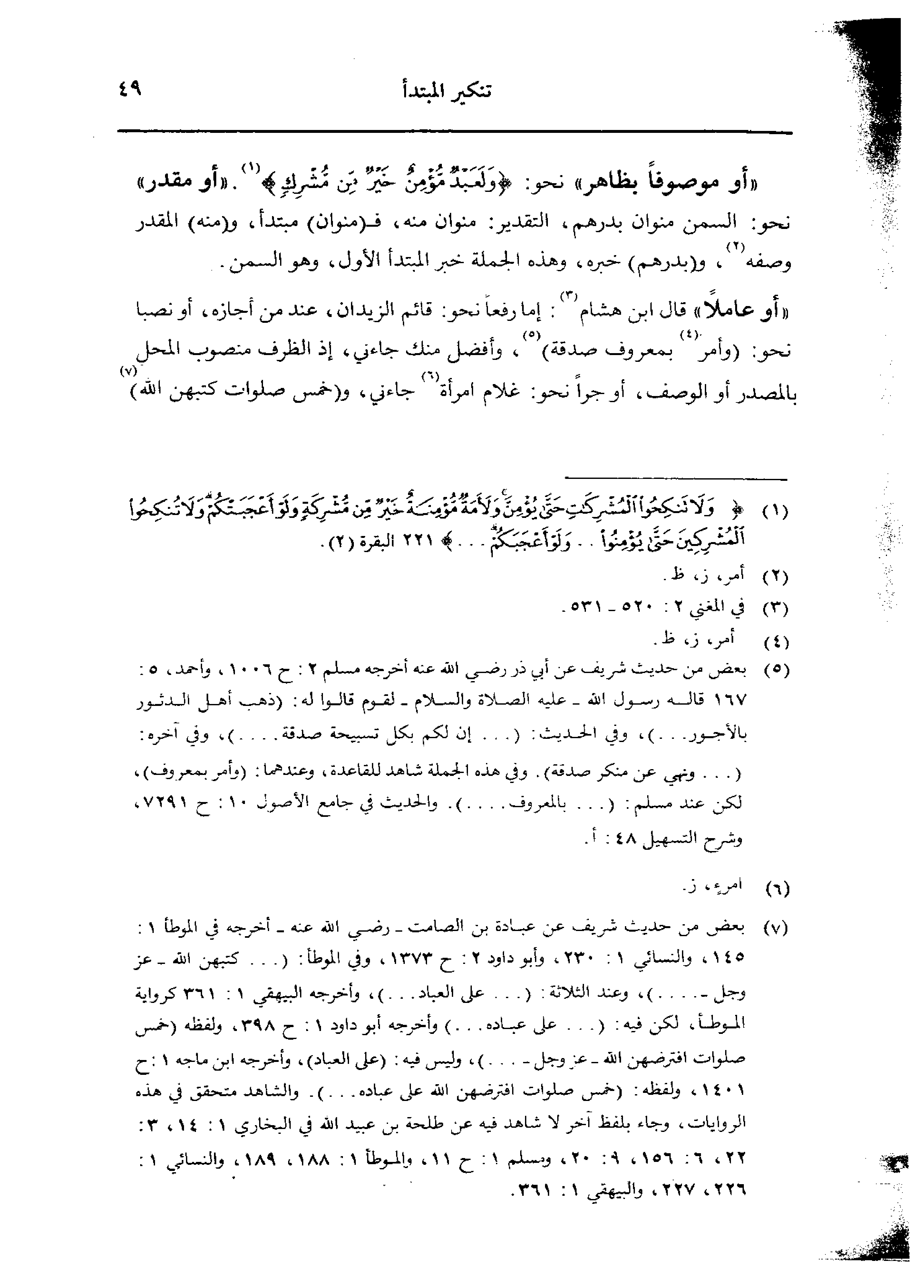 «أو موصوفًا بظاهر» نحو: {ولعبد مؤمن خير من مشرك}. «أو مقدر» نحو: السمن منوان بدرهم، التقدير: منوان منه، ف (منوان) مبتدأ، و (منه) المقدر وصفه، و (بدرهم) خبره، وهذه الجملة خبر المبتدأ الأول، وهو السمن.