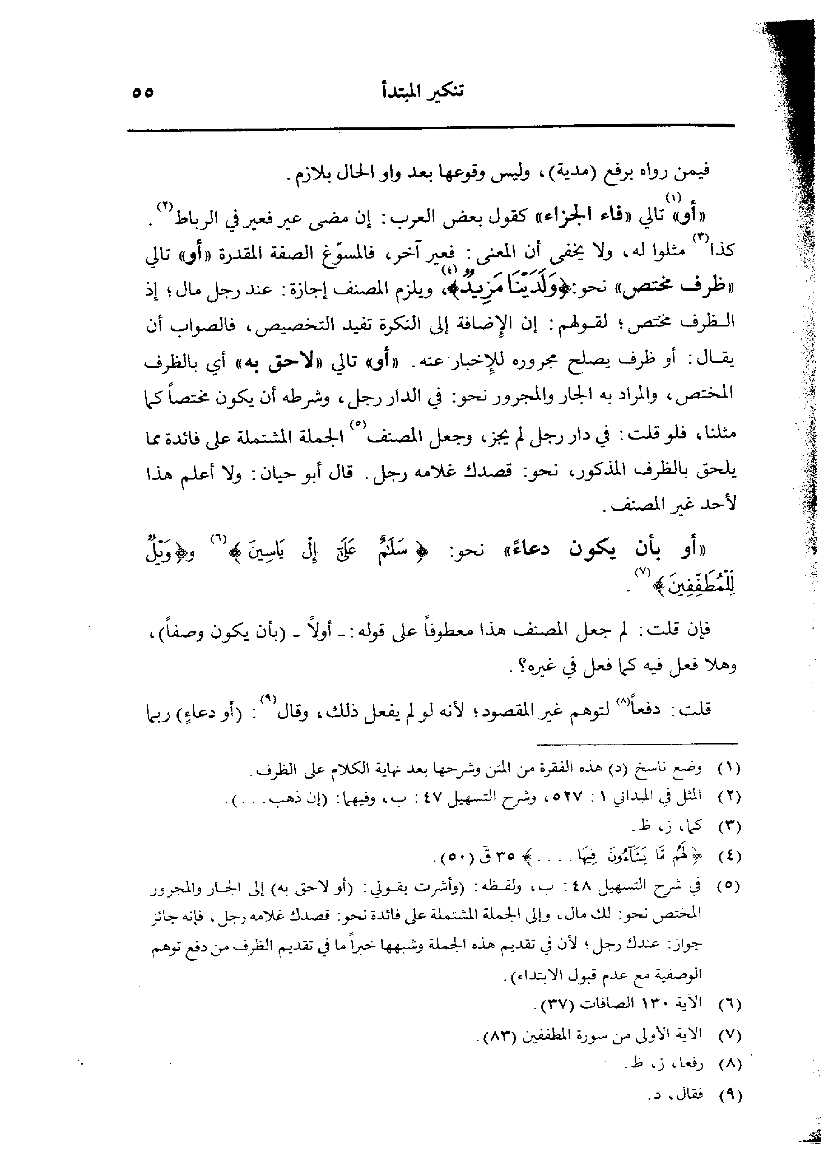 «أو» تالي «فاء الجزاء» كقول بعض العرب: إن مضى عير فعير في الرباط كذا مثلوا له، ولا يخفي أن المعنى: فعير آخر، فالمسوغ الصفة المقدرة «أو» تالي «ظرف مختص» نحو: {ولدينا مزيد}، ويلزم المصنف إجازة: عند رجل مال؛ إذ الظرف مختص؛ لقولهم: إن الإضافة إلى النكرة تفيد التخصيص، فالصواب أن يقال: أو ظرف يصلح مجرور للإخبار عنه. «أو» تالي «لاحق به» أي بالظرف المختص، والمراد به الجار والمجرور نحو: في الدار رجل، وشرطه أن يكون مختصًا كما مثلنا، فلو قلت: في دار رجل لم يجز، وجعل المصنف الجملة المشتملة على فائدة مما يلحق بالظرف المذكور، نحو: قصدك غلامه رجل. قال أبو حبان: ولا أعلم هذا لأحد غير المصنف.