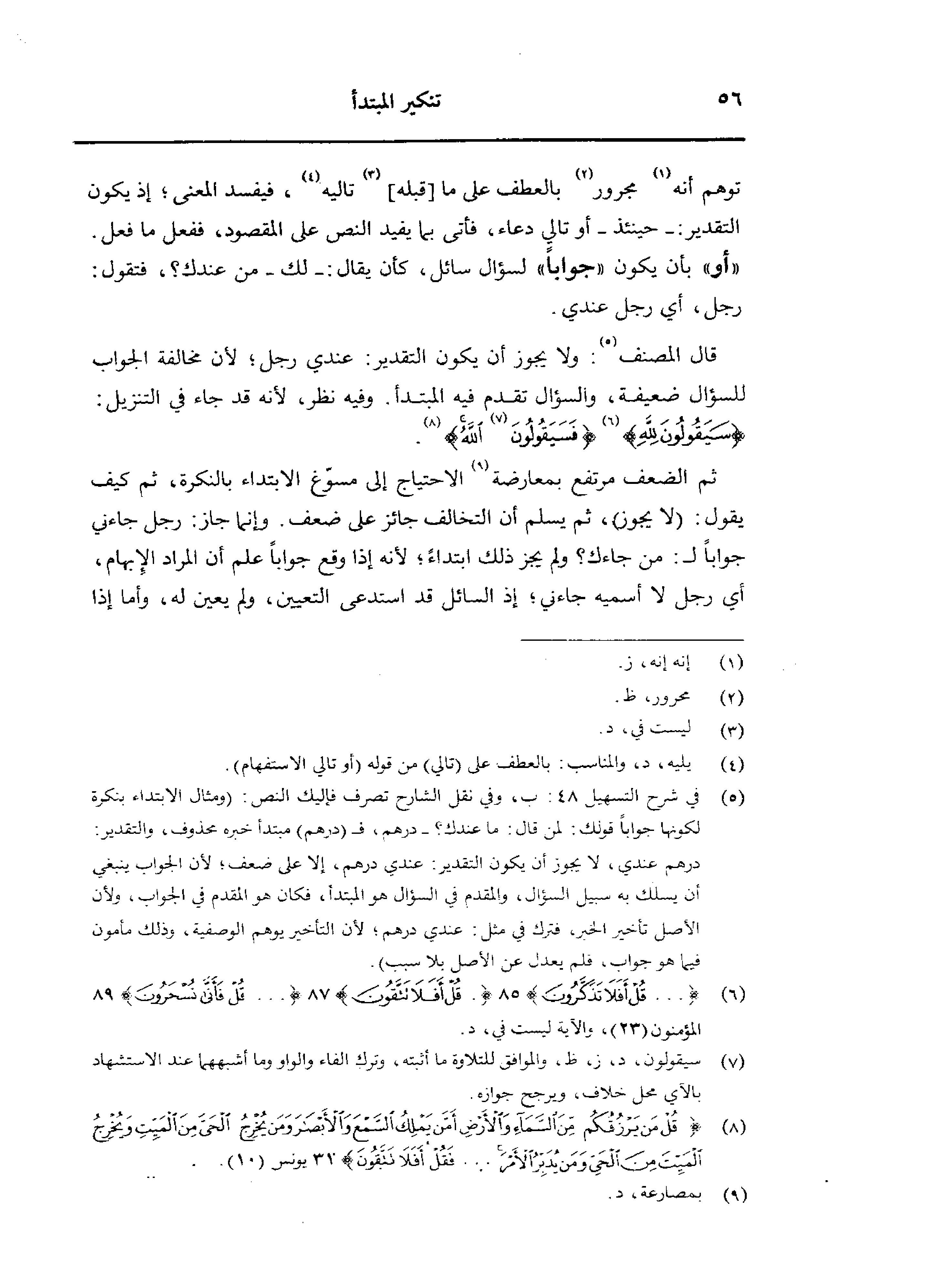 توهم أنه مجرور بالعطف على ما [قبله] تاليه، فيفسد المعنى؛ إذ يكون التقدير: - حينئذ - أو تالي دعاء، فأتى بما يفيد النص على المقصود، ففعل ما فعل. «أو» بأن يكون «جوابًا» لسؤال سائل، كأن يقال: - لك - من عندك؟ ، فتقول: رجل، أي رجل عندي.