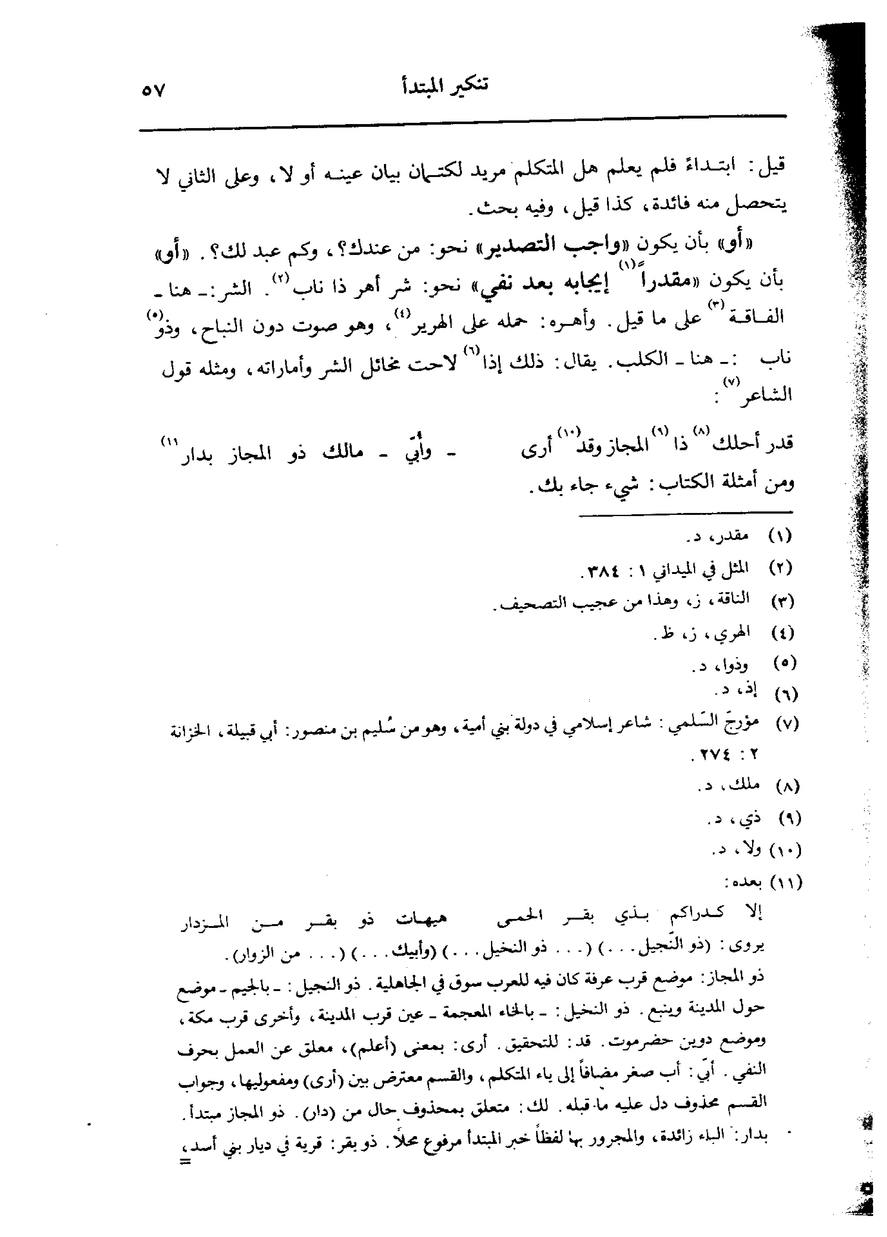 «أو» بأن يكون «واجب التصدير» نحو: من عندك؟ ، وكم عبد لك؟ . «أو» بأن يكون «مقدرًا إيجابه بعد نفي» نحو: شر أهر ذا ناب. الشر: - هنا - الفاقة على ما قيل وأهره: حمله على الهرير، وهو صوت دون النباح، وذو ناب: - هنا - الكلب. يقال: ذلك إذا لاحت مخائل الشر وأمارته، ومثله قول الشاعر: