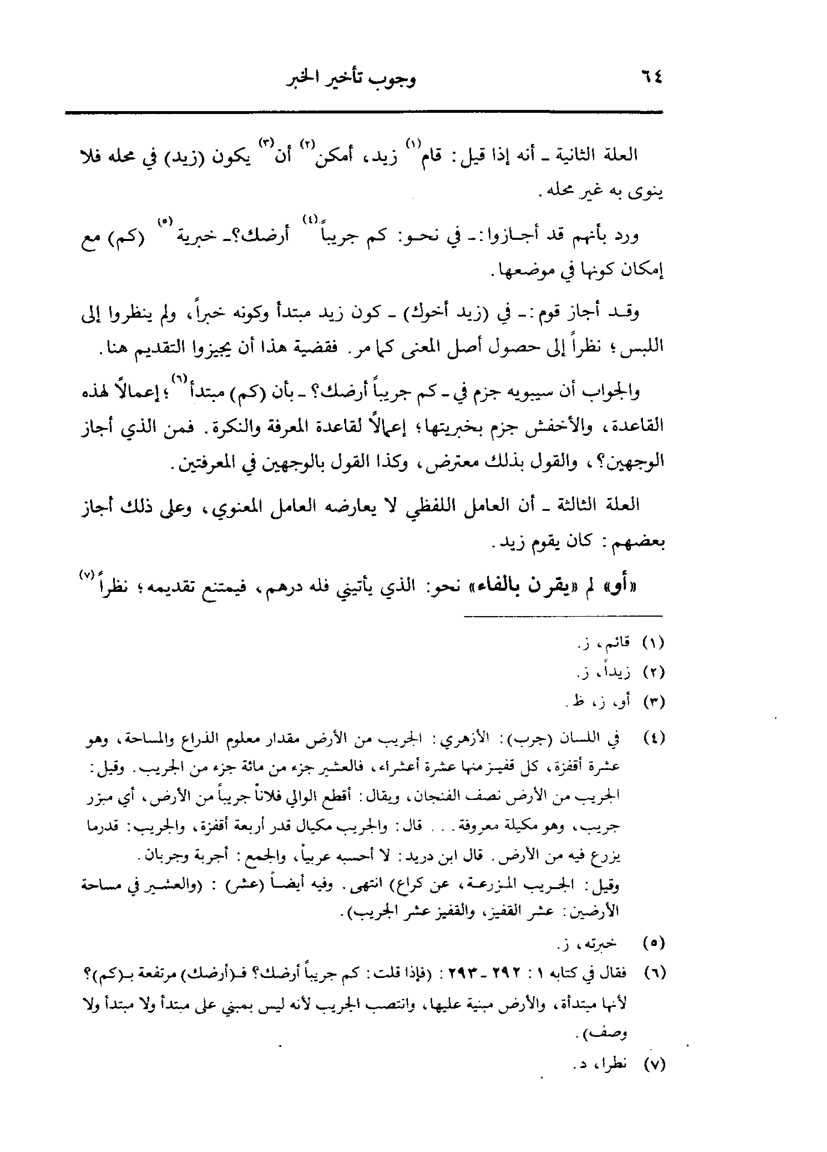 والجواب أن سيبوبه جزم في - كم جريبًا أرضك؟ - بأن (كم) مبتدأ؛ إعمالًا لهذه القاعدة، والأخفش جزم بخبرتها؛ إعمالًا لقاعدة المعرفة والنكرة. فمن الذي أجاز الوجهين؟ ، والقول بذلك معترض، وكذا القول بالوجهين في المعرفتين.