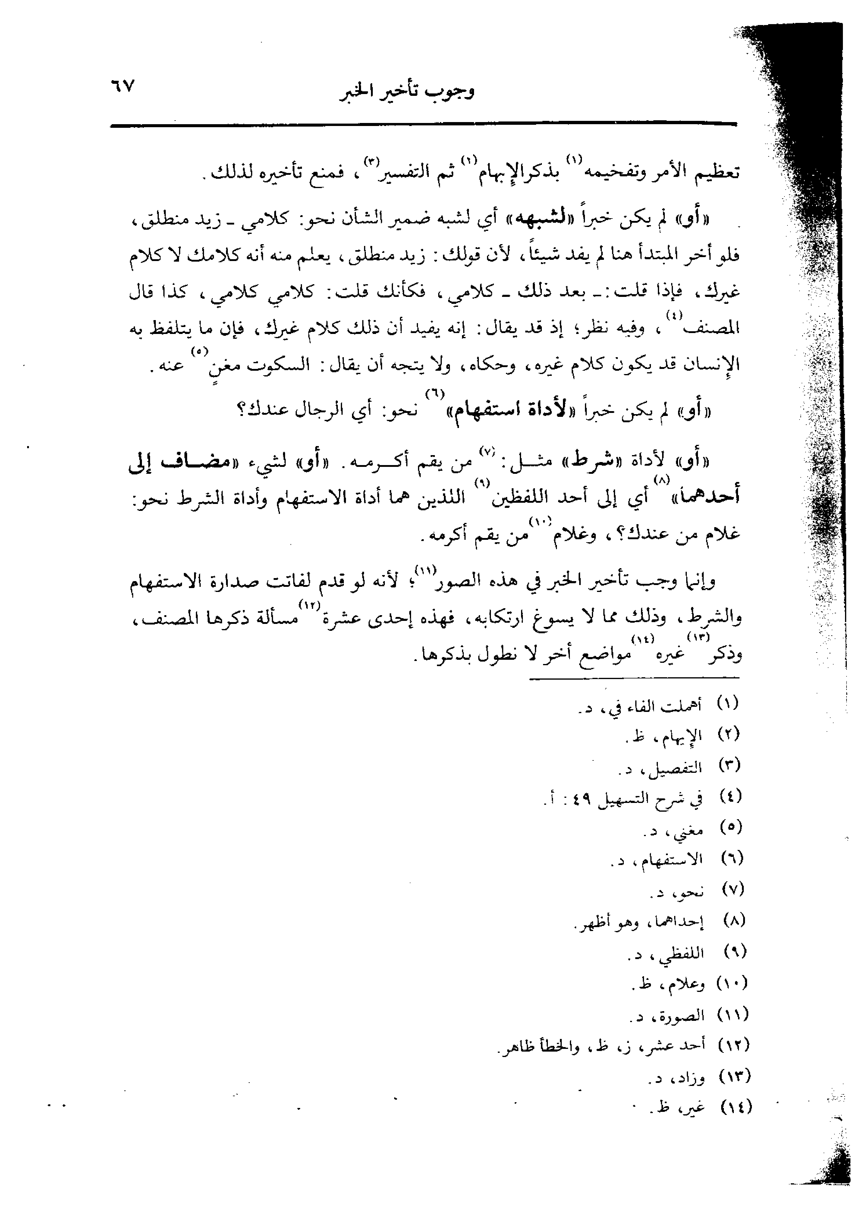 تعظيم الأمر وتفخيمه بذكر الإبهام ثم التفسير، فمنع تأخيره لذلك «أو» لم يكن خبرًا «لشبهه» أي لشبه ضمير الشأن نحو: كلامي - زيد منطلق، فلو أخر المبتدأ هنا لم يفد شيئًا، لأن قولك: زيد منطلق، يعلم منه أنه كلامك لا كلام غيرك، فإذا قلت: - بعد ذلك - كلامي، فكأنك قلت: كلامي كلامي، كذا قال المصنف، وفيه نظر؛ إذ قد يقال: إنه يفيد أن ذلك كلام غيرك، فإن ما يتلفظ به الإنسان قد يكون كلام غيره، وحكاه، ولا يتجه أن يقال: السكوت مغن عنه.