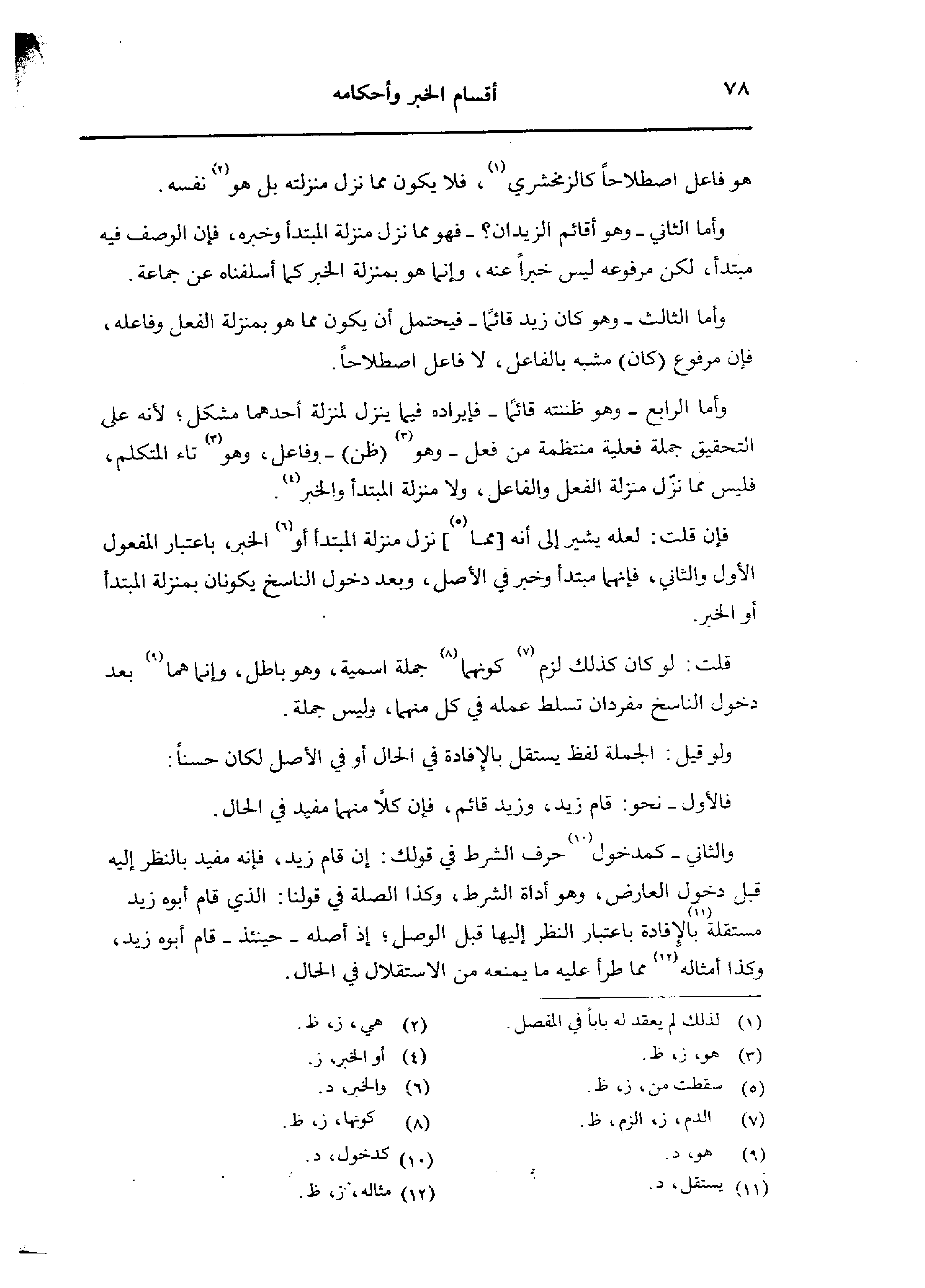 وأما الرابع - وهو ظنته قائمًا - فإيراده فيما ينزل لمنزلة أحدهما مشكل؛ لأنه على التحقيق جملة فعلية منتظمة من فعل - وهو (ظن) - وفاعل، وهو تاء المتكلم، فليس مما نزل منزلة الفعل والفاعل، ولا منزلة المبتدأ والخبر.