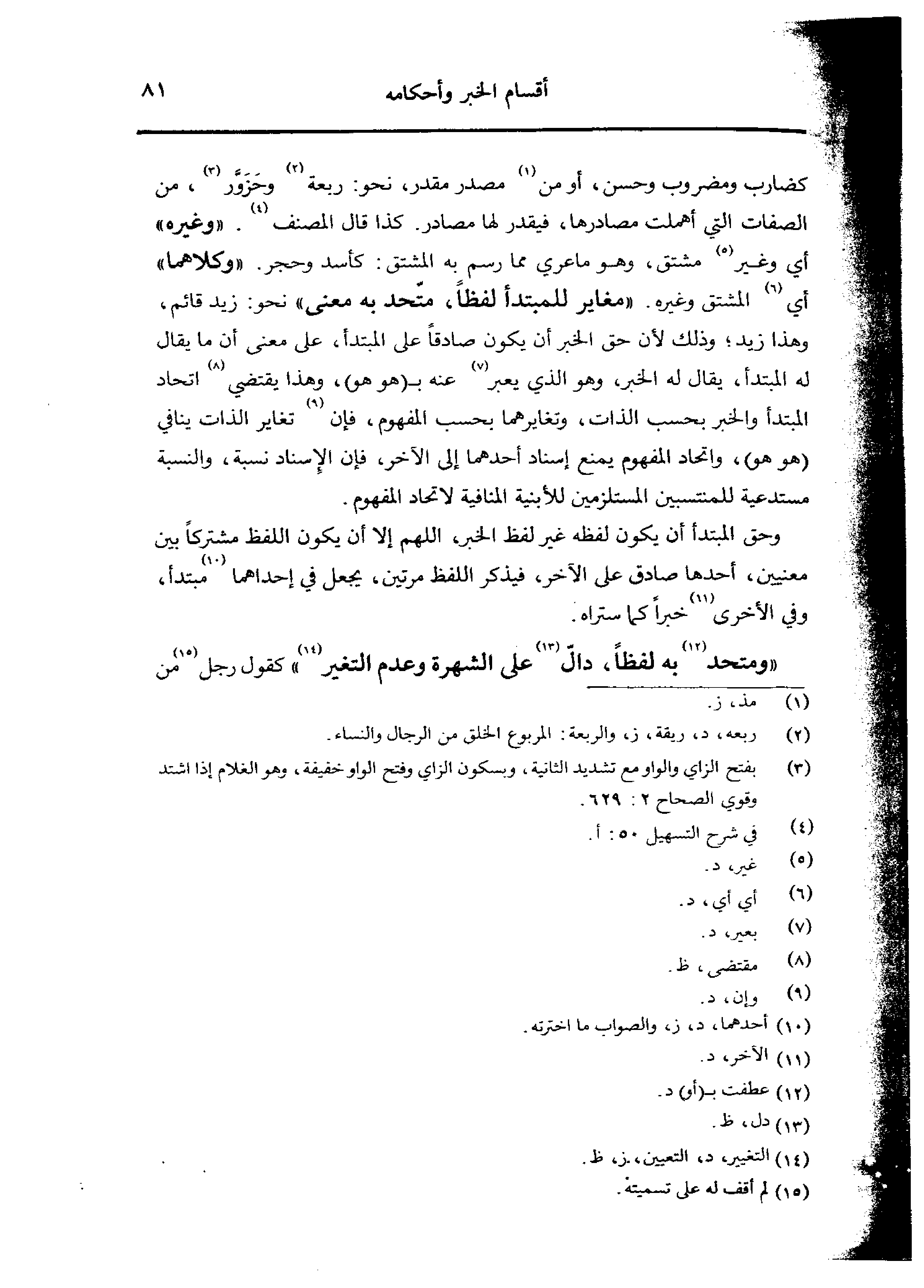 كضارب ومضروب وحسن، أو من مصدر مقدر، نحو: ربعة وحزور، من الصفات التي أهملت مصادرها، فيقدر لها مصادر. كذا قال المصنف. «وغيره» أي وغير مشتق، وهو ما عري مما رسم به المشتق: كأسد وحجر: «وكلاهما» أي المشتق وغيره. «مغاير للمبتدأ لفظًا، متحد به معنى» نحو: زيد قائم، وهذا زيد؛ وذلك لأنه حق الخبر أن يكون صادقًا على المبتدأ، على معنى أن ما يقال له المبتدأ، يقال له الخبر، وهو الذي يعبر عنه ب (هو هو)، وهذا يقتضي اتحاد المبتدأ والخبر بحسب الذات، وتغايرهما بحسب المفهوم، فإن تغاير الذات ينافي (هو هو)، واتحاد المفهوم يمنع إسناد أحدهما إلى الآخر، فإن الإسناد نسبة، والنسبة مستدعية للمنتسبين المستلزمين للأبنية المنافية لاتحاد المفهوم.