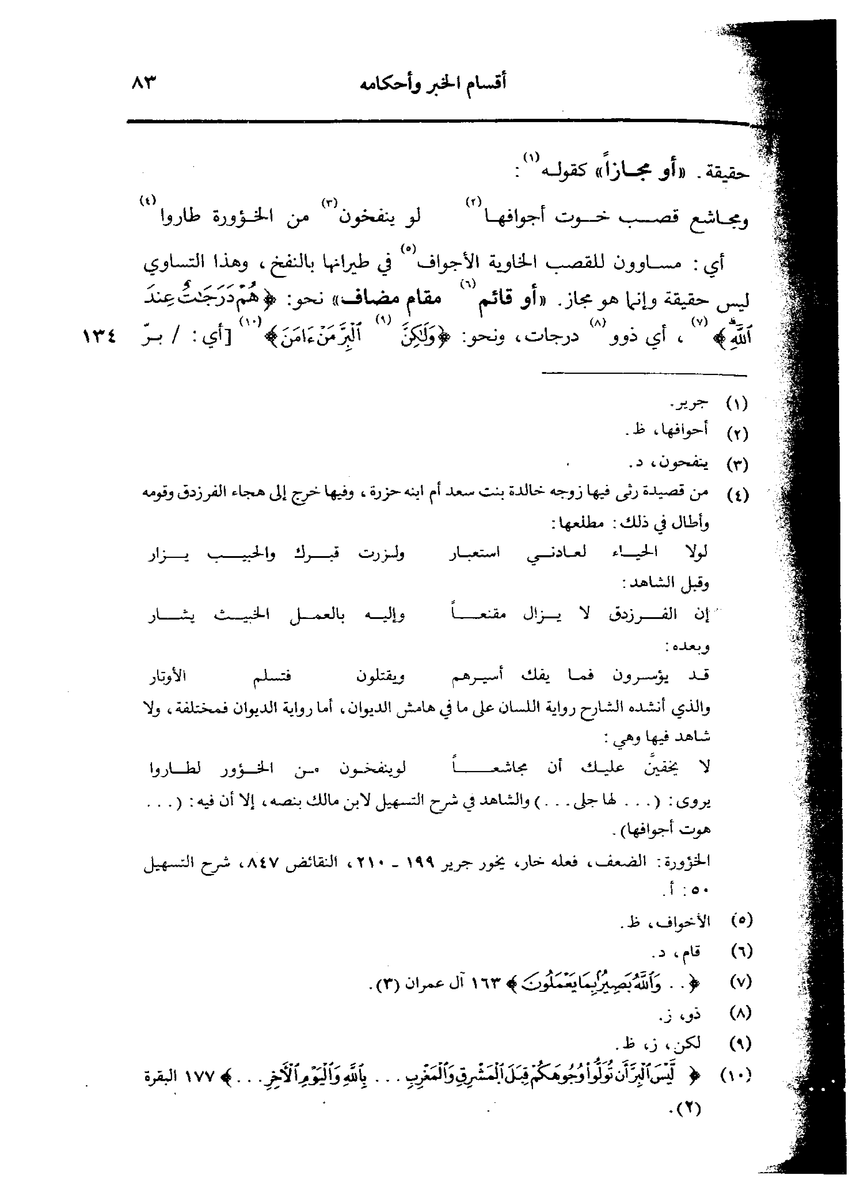 أي: مساوون للقصب الخاوية الأجواف في طيرانها بالنفخ، وهذا التساوي ليس حقيقة وإنما هو مجاز. «أو قائم مقام مضاف» نحو: {هم درجات عند الله}، أي ذوو درجات، ونحو: {ولكن البر من أمن} [أي: / بر 134