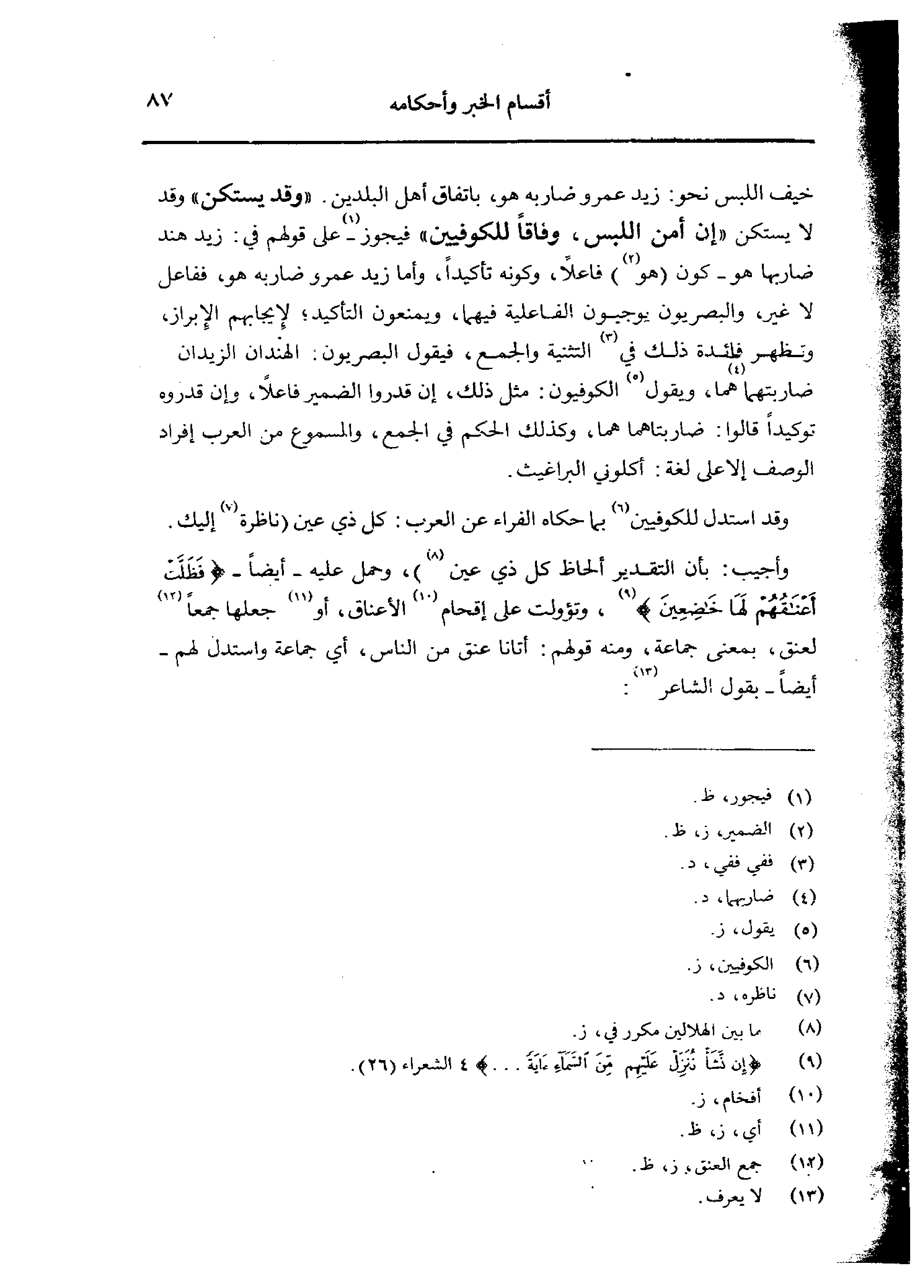 وقد استدل للكوفيين بما حكاه الفراء عن العرب: كل ذي عين (ناظرة إليك وأجيب: بأن التقدير ألحاظ كل ذي عين)، وحمل عليه - أيضًا - {فظلت أعناقهم لها خاضعين}، وتوالت على إقحام الأعناق، أو جعلها جمعًا لعنق، بمعنى جماعة، ومنه قولهم: أتانا عنق من الناس، أي جماعة واستدل لهم - أيضًا - بقول الشاعر: