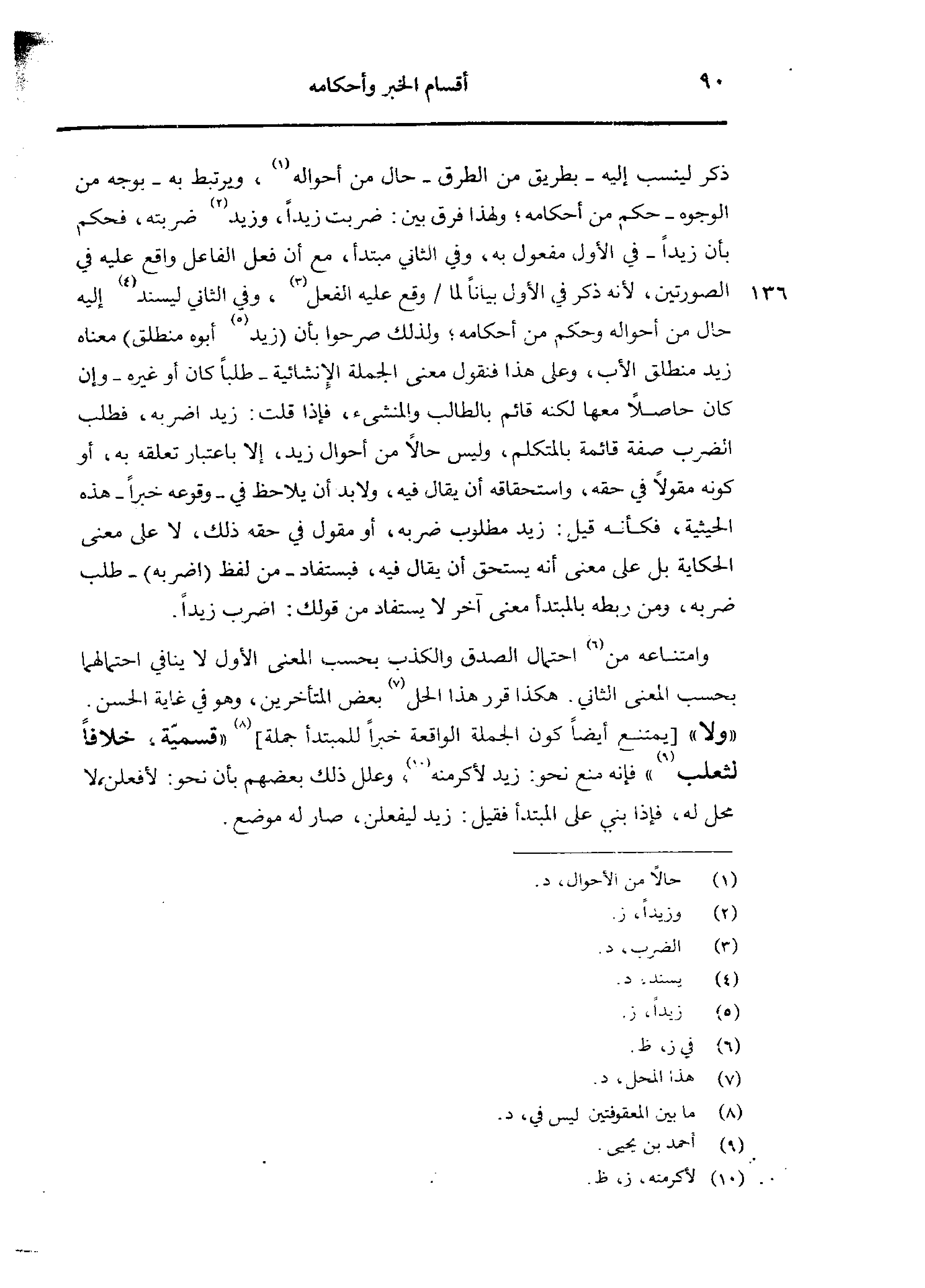 ذكر لينسب إليه - بطريق من الطرق - حال من أحواله، ويرتبط به - بوجه من الوجوه - حكم من أحكامه؛ ولهذا فرق بين: ضربت زيدًا، وزيد ضربته، فحكم بأن زيدًا - في الأول مفعول به، وفي الثاني مبتدأ، مع أن فعل الفاعل واقع عليه في 136 الصورتين، لأنه ذكر في الأول بيانًا لما/ وقع عليه الفعل، وفي الثاني ليسند إليه حال من أحواله وحكم من أحكامه؛ ولذلك صرحوا بأن (زيد أبوه منطلق) معناه زيد منطلق الأب، وعلى هذا فنقول معنى الجملة الإنشائية - طلًا كان أو غيره - وإن كان حاصلًا معها لكنه قائم بالطالب والمنشئ، فإذا قلت: زيد اضربه، فطلب الضرب صفة قائمة بالمتكلم، وليس حالًا من أحوال زيد، إلا باعتبار تعلقه به، أو كونه مقولًا في حقه، واستحقاقه أن يقال فيه، ولابد أن يلاحظ في وقوعه خبرًا - هذه الحيثية، فكأنه قيل: زيد مطلوب ضربه، أو مقول في حقه ذلك، لا على معنى الحكاية بل على معنى أنه يستحق أن يقال فيه، فيستفاد - من لفظ (اضربه) - طلب ضربه، ومن ربطه بالمبتدأ معنى آخر لا يستفاد من قولك: اضرب زيدًا.