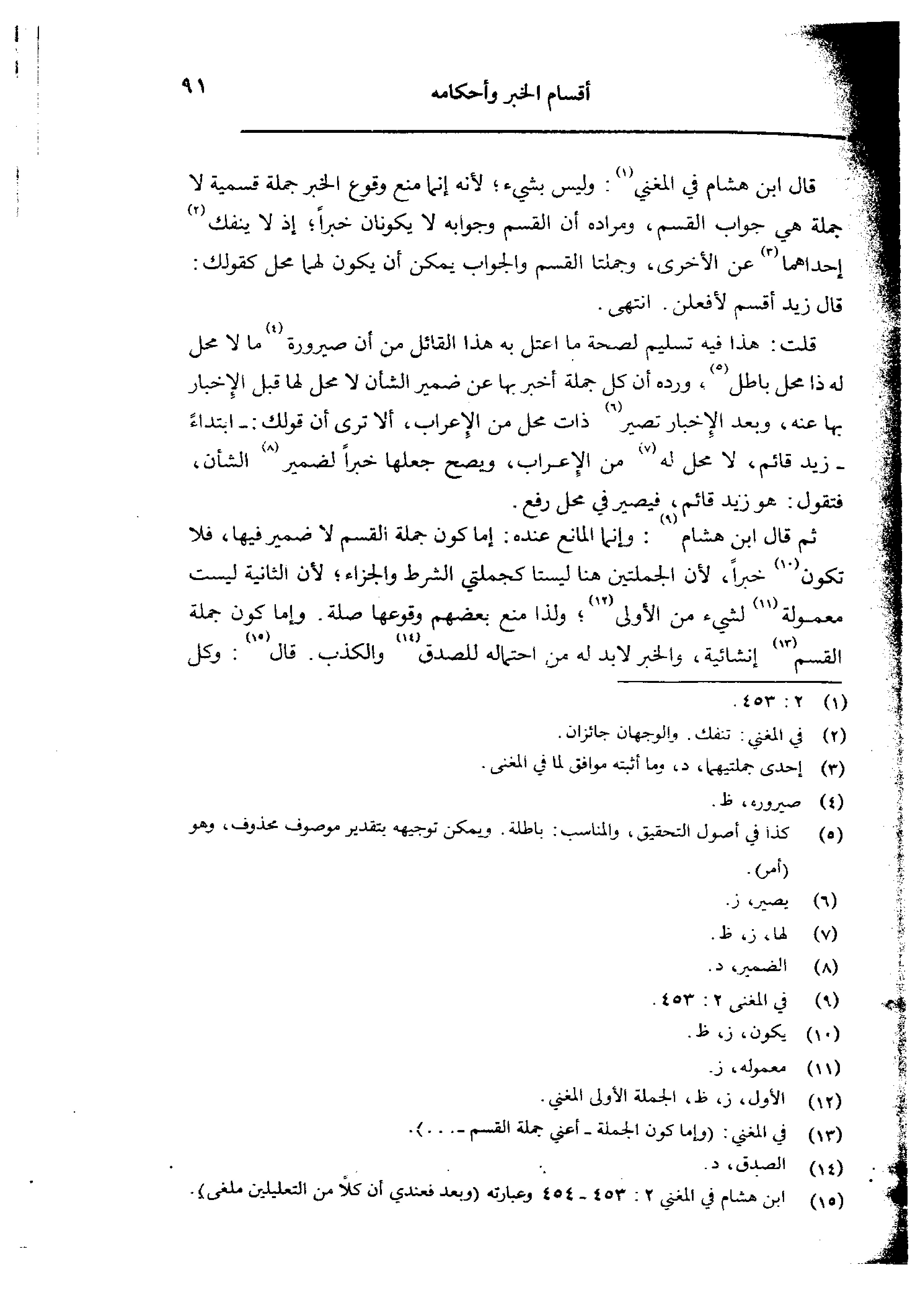 قال ابن هشام في المغني: وليس بشيء؛ لأنه إنما منع وقوع الخبر جملة قسمية لا جملة هي جواب القسم، ومراده أن القسم وجوابه لا يكونان خبرًا، إذ لا ينفك إحداهما عن الأخرى، وجملتا القسم والجواب يمكن أن يكون لهما محل كقولك: قال زيد أقسم لأفعلن. انتهى.