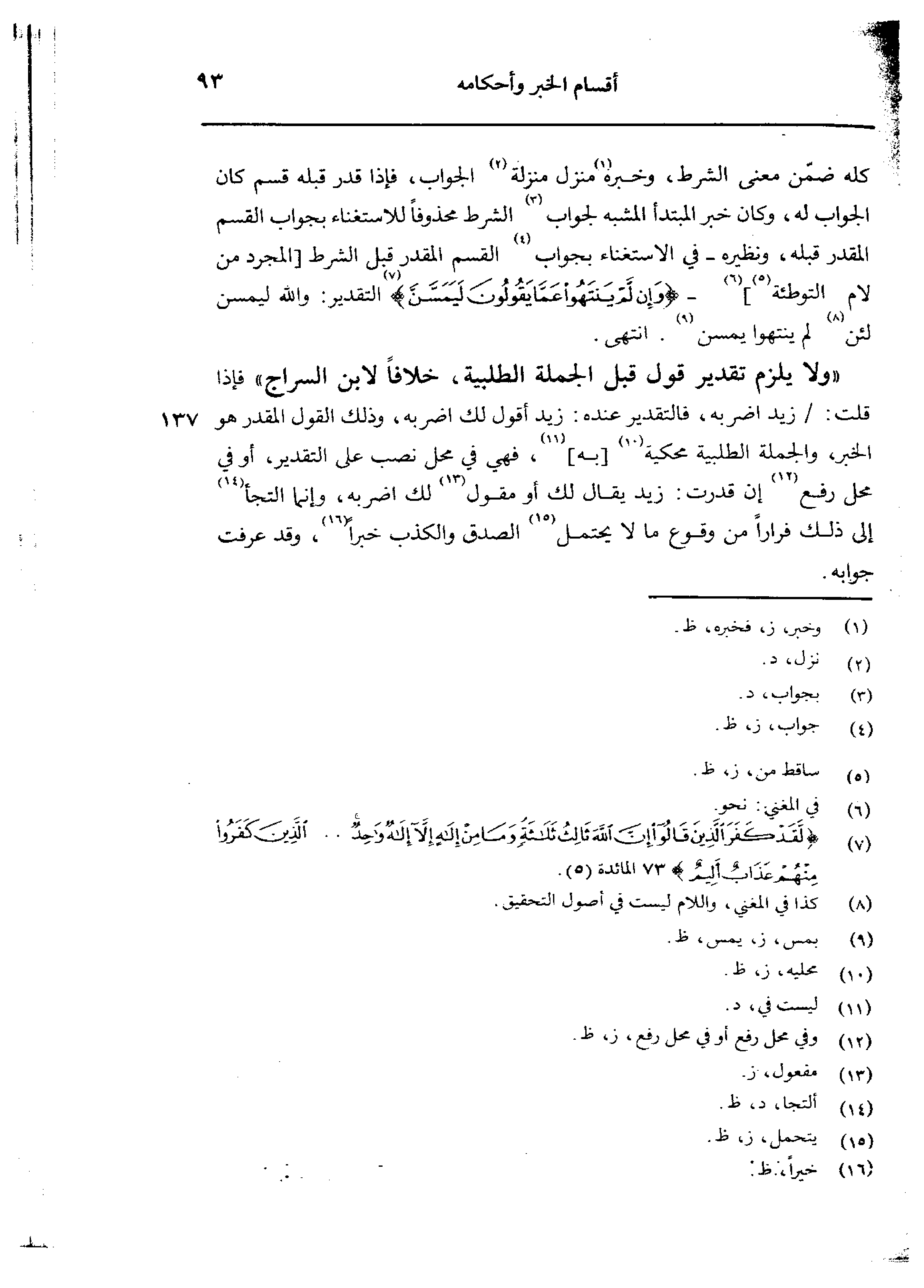 «ولا يلزم تقدير قول قبل الجملة الطلبية، خلافًا لابن السراج» فإذا قلت: / زيد اضربه، فالتقدير عنده: زيد أقول لك اضربه، وذلك القول المقدر هو 137 الخبر، والجملة الطلبية محكية [به]، فهي في محل نصل على التقدير، أو في محل رفع إن قدرت: زيد يقال لك أو مقول لك اضربه، وإنما التجأ إلى ذلك فرارًا من وقوع ما لا يحتمل الصدق والكذب خبرًا، وقد عرفت جوابه.