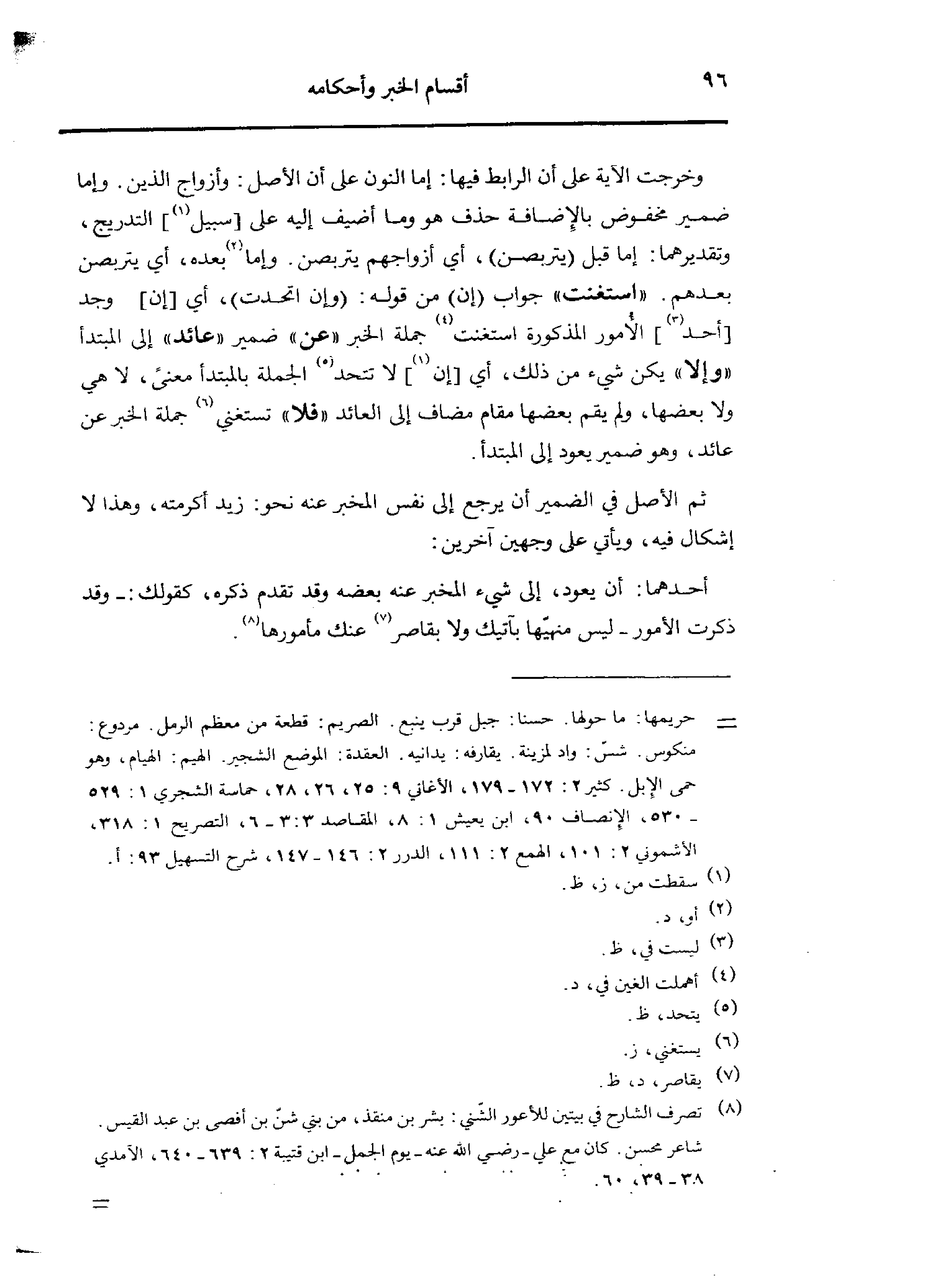 وخرجت الآية على أن الرابط فيها: إما النون على أن الأصل: وأزواج الذين. وإما ضمير مخفوض بالإضافة حذف هو وما أضيف إليه على [سبيل] التدريج، وتقديرهما: إما قبل (يتربصن)، أي أزواجهم يتربصن. وإما بعده، أي يتربصن بعدهم. «استغنت» جواب (إن) من قوله: (وإن اتحدت)، أي [إن] وجد [أحد] الأمور المذكورة استغنت جملة الخبر «عن» ضمير «عائد» إلى المبتدأ «وإلا» يكن شيء من ذلك، أي [إن] لا تتحد الجملة بالمبتدأ معنى، لا هي ولا بعضها، ولم يقم بعضها مقام مضاف إلى العائد «فلا» تستغني جملة الخبر عن عائد، وهو ضمير يعود إلى المبتدأ.
