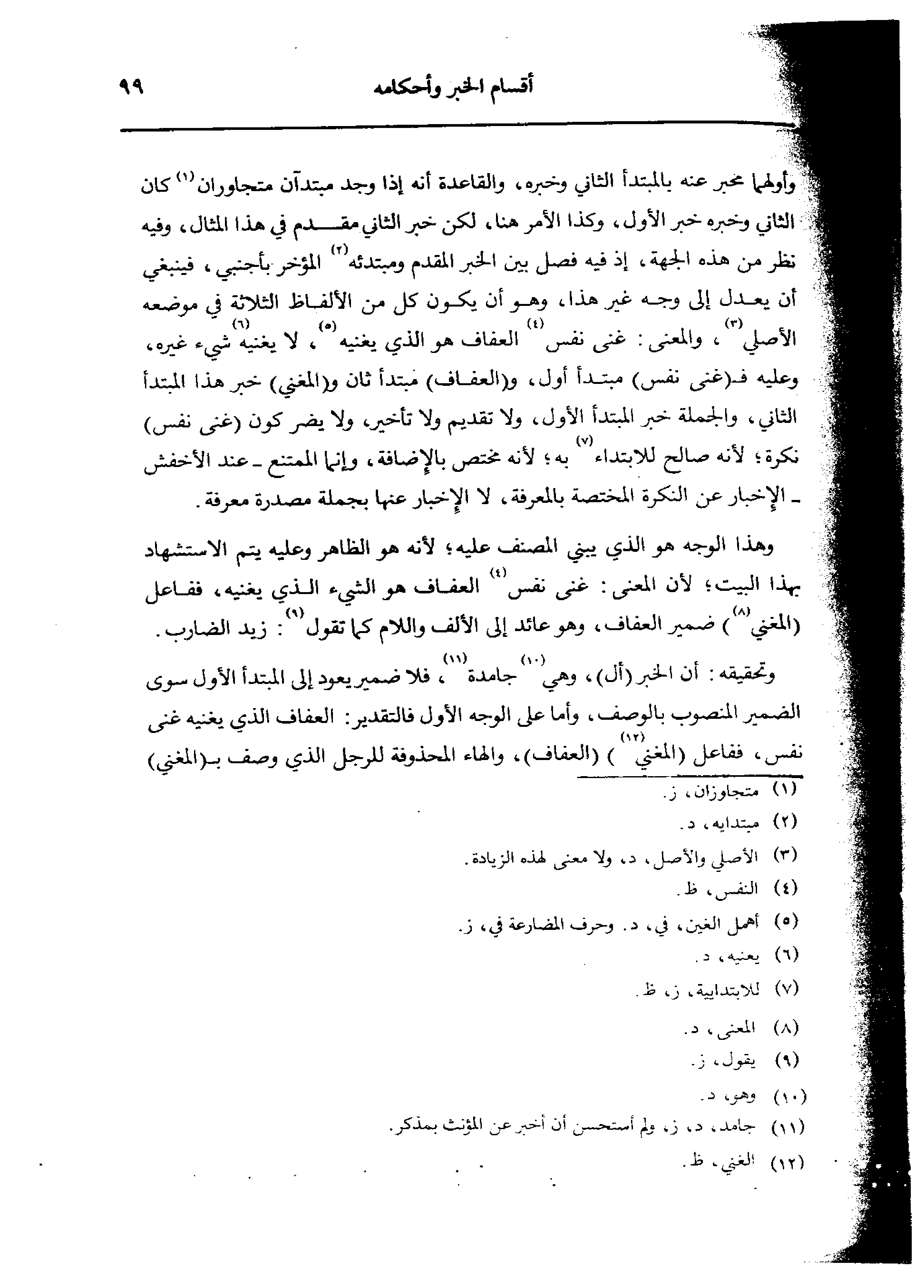 وأولهما مخبر عنه بالمبتدأ الثاني وخبره، والقاعدة أنه إذا وجد مبتدآن متجاوران كان الثاني وخبره خبر الأول، وكذا الأمر هنا، لكن خبر الثاني مقدم في هذا المثال، وفيه نظر من هذه الجهة، إذا فيه فصل بين الخبر المقدم ومبتدئه المؤخر بأجنبي، فينبغي أن يعدل إلى وجه غير هذا، وهو أن يكون كل من الألفاظ الثلاثة في موضعه الأصلي، والمعنى: غنى نفس العفاف هو الذي يغنيه، لا يغنيه شيء غيره، وعليه ف (غنى نفس) مبتدأ أول، و (العفاف) مبتدأ ثان و (المغني) خبر هذا المبتدأ الثاني، والجملة خبر المبتدأ الأول، ولا تقديم ولا تأخير، ولا يضر كون (غنى نفس) نكرة؛ لأنه صالح للابتداء به؛ لأنه مختص بالإضافة، وإنما الممتنع - عند الأخفش - الإخبار عن النكرة المختصة بالمعرفة، لا الإخبار عنها بجملة مصدرة معرفة.