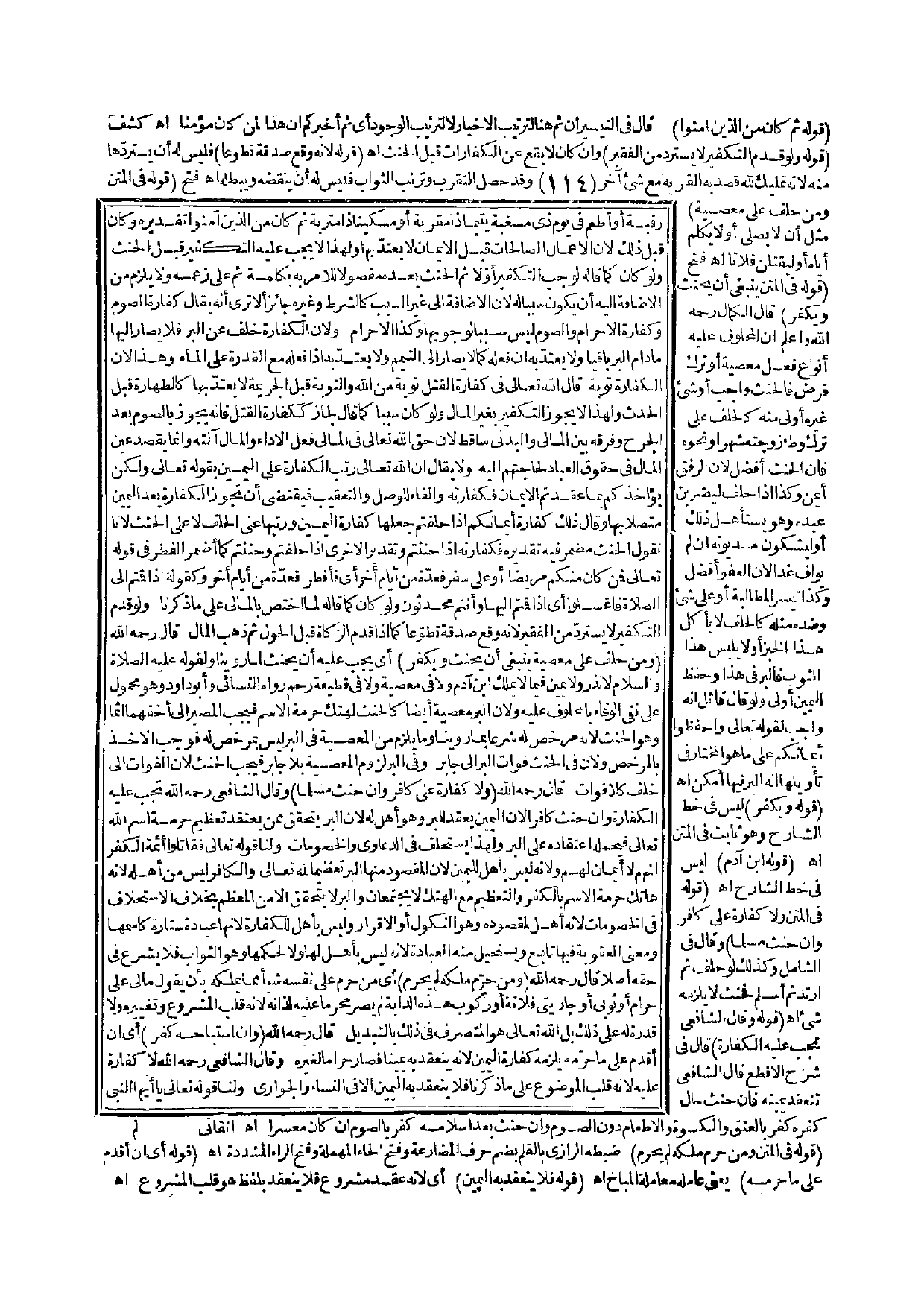 {فَكُّ رَقَبَةٍ} [البلد: 13] {أَوْ إِطْعَامٌ فِي يَوْمٍ ذِي مَسْغَبَةٍ} [البلد: 14] {يَتِيمًا ذَا مَقْرَبَةٍ} [البلد: 15] {أَوْ مِسْكِينًا ذَا مَتْرَبَةٍ} [البلد: 16] {ثُمَّ كَانَ مِنَ الَّذِينَ آمَنُوا} [البلد: 17] تَقْدِيرُهُ وَكَانَ قَبْلَ ذَلِكَ لِأَنَّ الْأَعْمَالَ الصَّالِحَاتِ قَبْلَ الْإِيمَانِ لَا يُعْتَدُّ بِهَا وَلِهَذَا لَا يَجِبُ عَلَيْهِ التَّكْفِيرُ قَبْلَ الْحِنْثِ