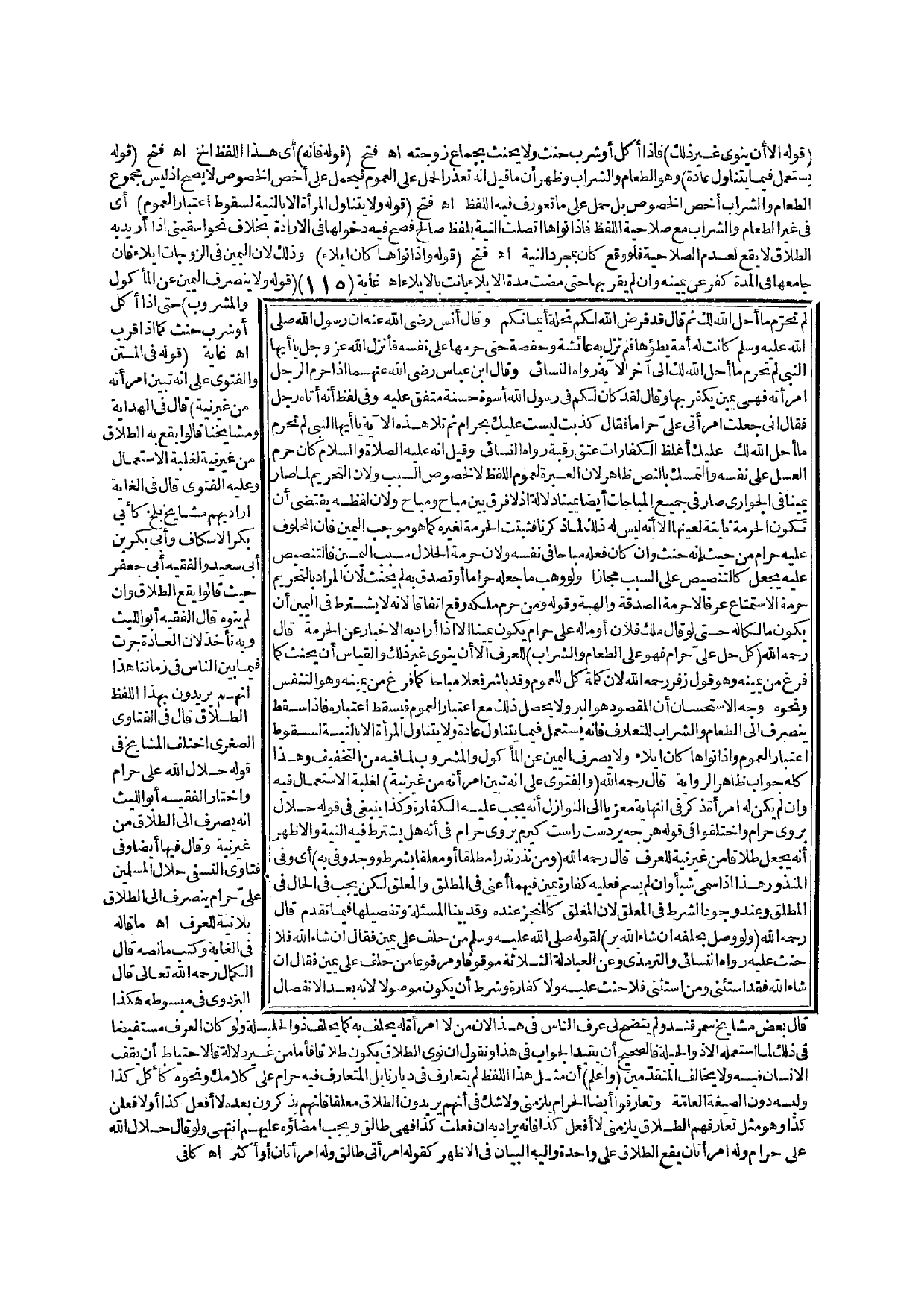 (قَوْلُهُ وَلَا يَنْصَرِفُ الْيَمِينُ عَنْ الْمَأْكُولِ وَالْمَشْرُوبِ) حَتَّى إذَا أَكَلَ أَوْ شَرِبَ حَنِثَ كَمَا إذَا قَرَّبَ. اهـ. غَايَةٌ (قَوْلُهُ فِي الْمَتْنِ وَالْفَتْوَى عَلَى أَنَّهُ تَبِينُ امْرَأَتُهُ مِنْ غَيْرِ نِيَّةٍ) قَالَ فِي الْهِدَايَةِ وَمَشَايِخُنَا قَالُوا يَقَعُ بِهِ الطَّلَاقُ مِنْ غَيْرِ نِيَّةٍ لِغَلَبَةِ الِاسْتِعْمَالِ وَعَلَيْهِ الْفَتْوَى قَالَ فِي الْغَايَةِ أَرَادَ بِهِمْ مَشَايِخَ بَلْخٍ كَأَبِي بَكْرٍ الْإِسْكَافِ وَأَبِي بَكْرِ بْنِ أَبِي سَعِيدٍ وَالْفَقِيهِ أَبِي جَعْفَرٍ حَيْثُ قَالُوا يَقَعُ الطَّلَاقُ وَإِنْ لَمْ يَنْوِهِ قَالَ الْفَقِيهُ أَبُو اللَّيْثِ وَبِهِ نَأْخُذُ لِأَنَّ الْعَادَةَ جَرَتْ فِيمَا بَيْنَ النَّاسِ فِي زَمَانِنَا هَذَا أَنَّهُمْ يُرِيدُونَ بِهَذَا اللَّفْظِ الطَّلَاقَ قَالَ فِي الْفَتَاوَى الصُّغْرَى اخْتَلَفَ الْمَشَايِخُ فِي قَوْلِهِ حَلَالُ اللَّهِ عَلَيَّ حَرَامٌ وَاخْتَارَ الْفَقِيهُ أَبُو اللَّيْثِ أَنَّهُ يُصْرَفُ إلَى الطَّلَاقِ مِنْ غَيْرِ نِيَّةٍ وَقَالَ فِيهَا أَيْضًا وَفِي فَتَاوَى النَّسَفِيِّ حَلَالُ الْمُسْلِمِينَ عَلَيَّ حَرَامٌ يَنْصَرِفُ إلَى الطَّلَاقِ بِلَا نِيَّةٍ لِلْعُرْفِ اهـ مَا قَالَهُ فِي الْغَايَةِ وَكَتَبَ مَا نَصُّهُ قَالَ الْكَمَالُ - رَحِمَهُ اللَّهُ تَعَالَى - قَالَ الْبَزْدَوِيُّ فِي مَبْسُوطِهِ هَكَذَا قَالَ بَعْضُ مَشَايِخِ سَمَرْقَنْدَ وَلَمْ يَتَّضِحْ لِي عُرْفُ النَّاسِ فِي هَذَا لِأَنَّ مَنْ لَا امْرَأَةَ لَهُ يَحْلِفُ بِهِ كَمَا يَحْلِفُ ذُو الْحَلِيلَةِ وَلَوْ كَانَ الْعُرْفُ مُسْتَفِيضًا فِي ذَلِكَ لِمَا اسْتَعْمَلَهُ إلَّا ذُو الْحَلِيلَةِ فَالصَّحِيحُ أَنْ يُقَيَّدَ الْجَوَابُ فِي هَذَا وَنَقُولُ إنْ نَوَى الطَّلَاقَ يَكُونُ طَلَاقًا فَأَمَّا مِنْ غَيْرِ دَلَالَةٍ فَالِاحْتِيَاطُ أَنْ يَقِفَ الْإِنْسَانُ فِيهِ وَلَا يُخَالِفُ الْمُتَقَدِّمِينَ