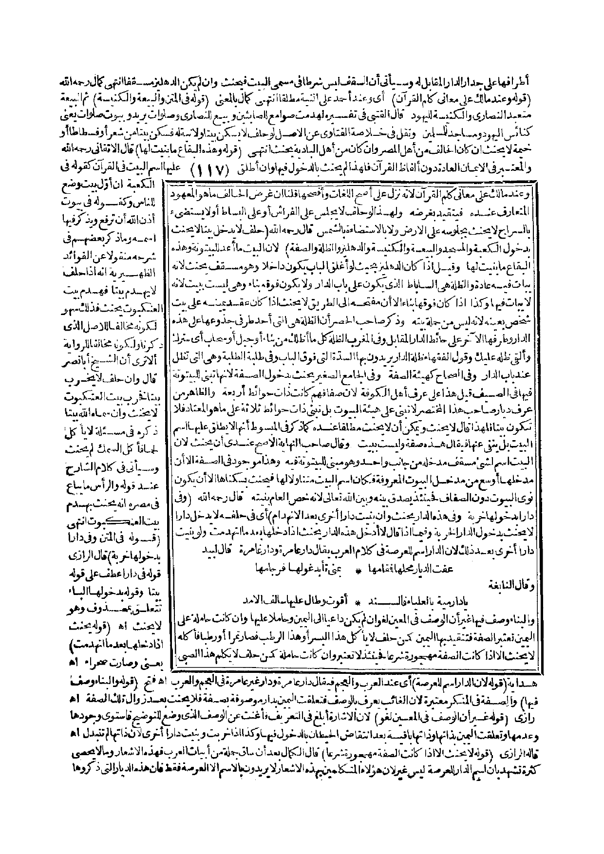 وَعِنْدَ مَالِكٍ عَلَى مَعَانِي كَلِمِ الْقُرْآنِ لِأَنَّهُ نَزَلَ عَلَى أَصَحِّ اللُّغَاتِ وَأَفْصَحِهَا قُلْنَا إنَّ غَرَضَ الْحَالِفِ مَا هُوَ الْمَعْهُودُ الْمُتَعَارَفُ عِنْدَهُ فَتَقَيَّدَ بِغَرَضِهِ وَلِهَذَا لَوْ حَلَفَ لَا يَجْلِسُ عَلَى الْفِرَاشِ أَوْ عَلَى الْبِسَاطِ أَوْ لَا يَسْتَضِيءُ بِالسِّرَاجِ لَا يَحْنَثُ بِجُلُوسِهِ عَلَى الْأَرْضِ وَلَا بِالِاسْتِضَاءَةِ بِالشَّمْسِ قَالَ - رَحِمَهُ اللَّهُ - (حَلَفَ لَا يَدْخُلُ بَيْتًا لَا يَحْنَثُ بِدُخُولِ الْكَعْبَةِ وَالْمَسْجِدِ وَالْبَيْعَةِ وَالْكَنِيسَةِ وَالدِّهْلِيزِ وَالظُّلَّةِ وَالصُّفَّةِ) لِأَنَّ الْبَيْتَ مَا أُعِدَّ لِلْبَيْتُوتَةِ وَهَذِهِ الْبِقَاعُ مَا بُنِيَتْ لَهَا وَقِيلَ إذَا كَانَ الدِّهْلِيزُ بِحَيْثُ لَوْ أَغْلَقَ الْبَابَ يَكُونُ دَاخِلًا وَهُوَ مُسَقَّفٌ يَحْنَثُ لِأَنَّهُ يُبَاتُ فِيهِ عَادَةً وَالظُّلَّةُ هِيَ السَّابَاطُ الَّذِي يَكُونُ عَلَى بَابِ الدَّارِ وَلَا يَكُونُ فَوْقَهُ بِنَاءٌ وَهِيَ لَيْسَتْ بِبَيْتٍ لِأَنَّهُ لَا يُبَاتُ فِيهَا وَكَذَا إذَا كَانَ فَوْقَهَا بِنَاءٌ إلَّا أَنَّ مِفْتَحَهُ إلَى الطَّرِيقِ لَا يَحْنَثُ إذَا كَانَ عَقَدَ يَمِينَهُ عَلَى بَيْتِ شَخْصٍ بِعَيْنِهِ لِأَنَّهُ لَيْسَ مِنْ جُمْلَةِ بَيْتِهِ وَذَكَرَ صَاحِبُ الْحَصْرِ أَنَّ الظُّلَّةَ هِيَ الَّتِي أَحَدُ طَرَفَيْ جُذُوعِهَا عَلَى هَذِهِ الدَّارِ وَطَرَفُهَا الْآخَرُ عَلَى حَائِطِ الدَّارِ الْمُقَابِلِ