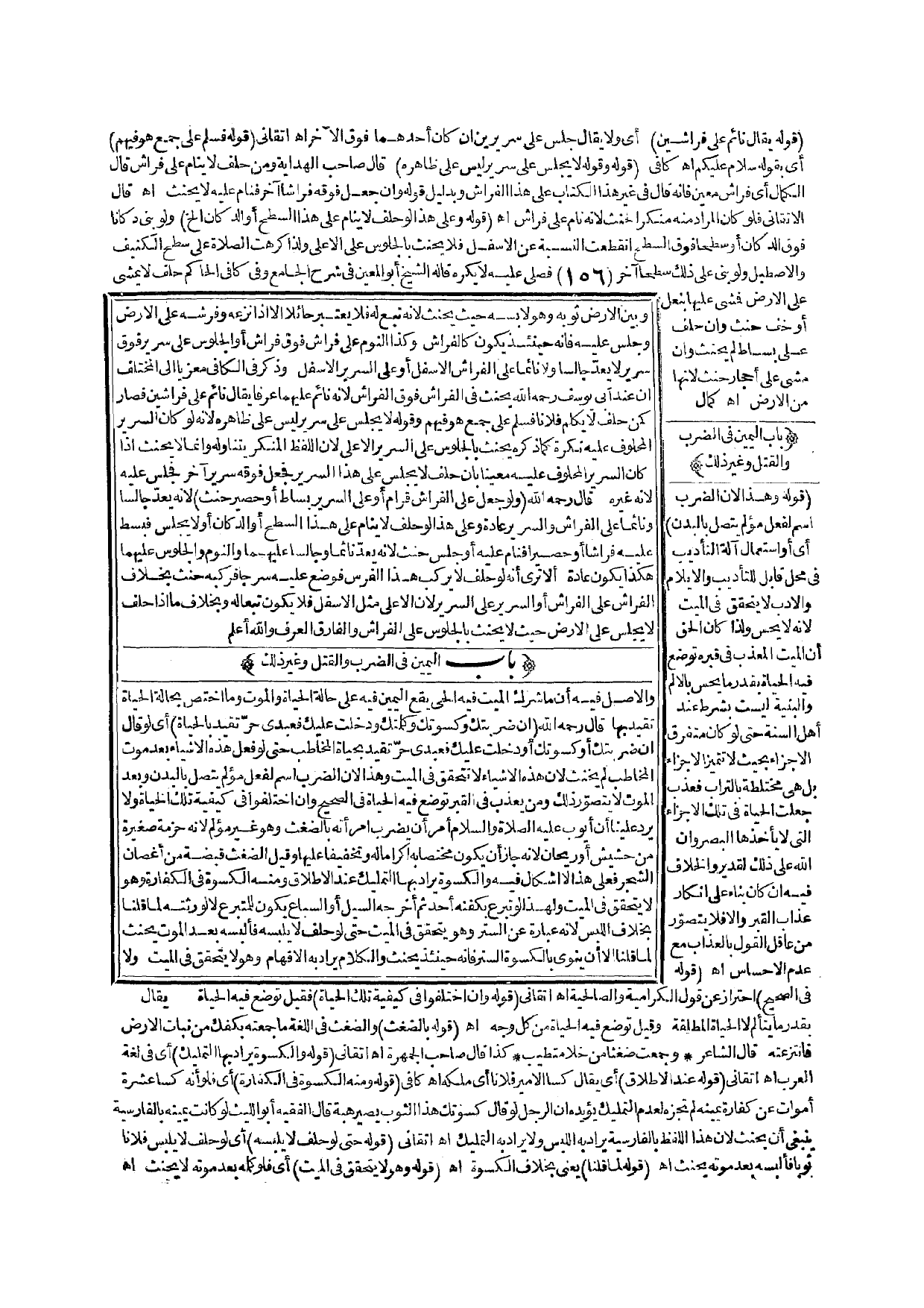 (بَابُ الْيَمِينِ فِي الضَّرْبِ وَالْقَتْلِ وَغَيْرِ ذَلِكَ) (قَوْلُهُ وَهَذَا لِأَنَّ الضَّرْبَ اسْمٌ لِفِعْلٍ مُؤْلِمٍ يَتَّصِلُ بِالْبَدَنِ) أَيْ أَوْ اسْتِعْمَالُ آلَةِ التَّأْدِيبِ فِي مَحَلٍّ قَابِلٍ لِلتَّأْدِيبِ وَالْإِيلَامِ وَالْأَدَبُ لَا يَتَحَقَّقُ فِي الْمَيِّتِ لِأَنَّهُ لَا يُحِسُّ وَلِذَا كَانَ الْحَقُّ أَنَّ الْمَيِّتَ الْمُعَذَّبَ فِي قَبْرِهِ تُوضَعُ فِيهِ الْحَيَاةُ بِقَدْرِ مَا يُحِسُّ بِالْأَلَمِ وَالْبِنْيَةُ لَيْسَتْ بِشَرْطٍ عِنْدَ أَهْلِ السُّنَّةِ حَتَّى لَوْ كَانَ مُتَفَرِّقَ الْأَجْزَاءِ بِحَيْثُ لَا تَتَمَيَّزُ الْأَجْزَاءُ بَلْ هِيَ مُخْتَلِطَةٌ بِالتُّرَابِ فَعُذِّبَ جُعِلَتْ الْحَيَاةُ فِي تِلْكَ الْأَجْزَاءِ الَّتِي لَا يَأْخُذُهَا الْبَصَرُ وَإِنَّ اللَّهَ عَلَى ذَلِكَ لَقَدِيرٌ وَالْخِلَافُ فِيهِ إنْ كَانَ بِنَاءً عَلَى إنْكَارِ عَذَابِ الْقَبْرِ وَإِلَّا فَلَا يُتَصَوَّرُ مِنْ عَاقِلٍ الْقَوْلُ بِالْعَذَابِ مَعَ عَدَمِ الْإِحْسَاسِ. اهـ. (قَوْلُهُ فِي الصَّحِيحِ) احْتِرَازٌ عَنْ قَوْلِ الْكَرَّامِيَّةِ وَالصَّالِحِيَّةِ اهـ أَتْقَانِيٌّ