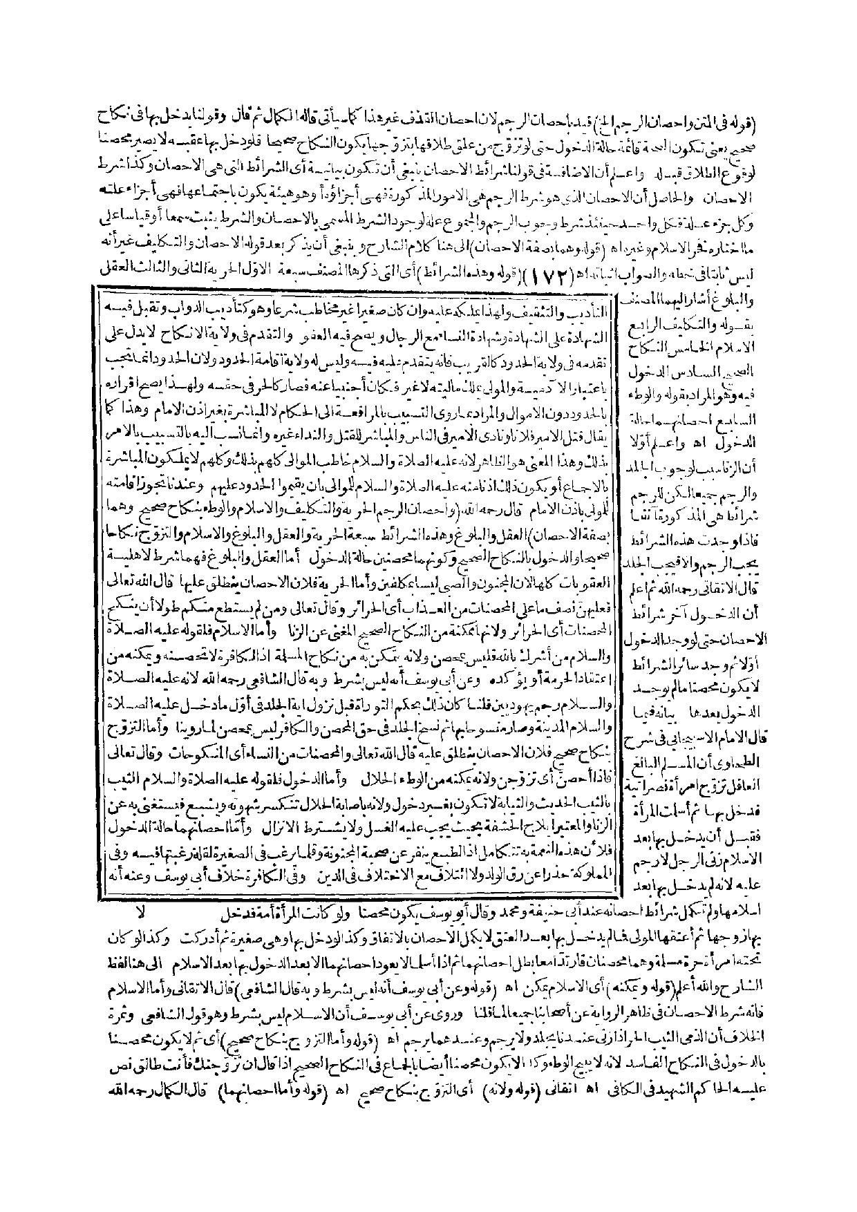 قَالَ - رَحِمَهُ اللَّهُ - (وَإِحْصَانُ الرَّجْمِ الْحُرِّيَّةُ وَالتَّكْلِيفُ وَالْإِسْلَامُ وَالْوَطْءُ بِنِكَاحٍ صَحِيحٍ وَهُمَا بِصِفَةِ الْإِحْصَانِ) الْعَقْلُ وَالْبُلُوغُ وَهَذِهِ الشَّرَائِطُ سَبْعَةٌ الْحُرِّيَّةُ وَالْعَقْلُ وَالْبُلُوغُ وَالْإِسْلَامُ وَالتَّزَوُّجُ نِكَاحًا صَحِيحًا وَالدُّخُولُ بِالنِّكَاحِ الصَّحِيحِ وَكَوْنُهُمَا مُحْصَنَيْنِ حَالَةَ الدُّخُولِ أَمَّا الْعَقْلُ وَالْبُلُوغُ فَهُمَا شَرْطٌ لِأَهْلِيَّةِ الْعُقُوبَاتِ كُلِّهَا لِأَنَّ الْمَجْنُونَ وَالصَّبِيَّ لَيْسَا بِمُكَلَّفَيْنِ وَأَمَّا الْحُرِّيَّةُ فَلِأَنَّ الْإِحْصَانَ يَنْطَلِقُ عَلَيْهَا قَالَ اللَّهُ تَعَالَى {فَعَلَيْهِنَّ نِصْفُ مَا عَلَى الْمُحْصَنَاتِ مِنَ الْعَذَابِ} [النساء: 25] أَيْ الْحَرَائِرِ وَقَالَ تَعَالَى {وَمَنْ لَمْ يَسْتَطِعْ مِنْكُمْ طَوْلا أَنْ يَنْكِحَ الْمُحْصَنَاتِ} [النساء: 25] أَيْ الْحَرَائِرَ وَلِأَنَّهَا مُمَكَّنَةٌ مِنْ النِّكَاحِ الصَّحِيحِ الْمُغْنِي عَنْ الزِّنَا، وَأَمَّا الْإِسْلَامُ فَلِقَوْلِهِ - عَلَيْهِ الصَّلَاةُ وَالسَّلَامُ - «مَنْ أَشْرَكَ بِاَللَّهِ فَلَيْسَ بِمُحْصَنٍ» وَلِأَنَّهُ يُتَمَكَّنُ بِهِ مِنْ نِكَاحِ الْمُسْلِمَةِ إذْ الْكَافِرَةُ لَا تُحْصِنُهُ وَيُمْكِنُهُ مِنْ اعْتِقَادِ الْحُرْمَةِ أَوْ يُؤَكِّدُهُ وَعَنْ أَبِي يُوسُفَ أَنَّهُ لَيْسَ بِشَرْطٍ وَبِهِ قَالَ الشَّافِعِيُّ - رَحِمَهُ اللَّهُ - لِأَنَّهُ - عَلَيْهِ الصَّلَاةُ وَالسَّلَامُ - «رَجَمَ يَهُودِيَّيْنِ» قُلْنَا كَانَ ذَلِكَ بِحُكْمِ التَّوْرَاةِ قَبْلَ نُزُولِ آيَةِ الْجَلْدِ فِي أَوَّلِ مَا دَخَلَ - عَلَيْهِ الصَّلَاةُ وَالسَّلَامُ - الْمَدِينَةَ وَصَارَ مَنْسُوخًا بِهَا ثُمَّ نُسِخَ الْجَلْدُ فِي حَقِّ الْمُحْصَنِ وَالْكَافِرُ لَيْسَ بِمُحْصَنٍ لِمَا رَوَيْنَا وَأَمَّا التَّزَوُّجُ بِنِكَاحٍ صَحِيحٍ فَلِأَنَّ الْإِحْصَانَ يَنْطَلِقُ عَلَيْهِ قَالَ اللَّهُ تَعَالَى {وَالْمُحْصَنَاتُ مِنَ النِّسَاءِ} [النساء: 24] أَيْ الْمَنْكُوحَاتِ وَقَالَ تَعَالَى {فَإِذَا أُحْصِنَّ} [النساء: 25] أَيْ تَزَوَّجْنَ وَلِأَنَّهُ يُمَكِّنُهُ مِنْ الْوَطْءِ الْحَلَالِ وَأَمَّا الدُّخُولُ فَلِقَوْلِهِ - عَلَيْهِ الصَّلَاةُ وَالسَّلَامُ - «الثَّيِّبُ بِالثَّيِّبِ» الْحَدِيثَ وَالثِّيَابَةُ لَا تَكُونُ بِغَيْرِ دُخُولٍ وَلِأَنَّهُ بِإِصَابَةِ الْحَلَالِ تَنْكَسِرُ شَهْوَتُهُ وَيَشْبَعُ فَيَسْتَغْنِي بِهِ عَنْ الزِّنَا وَالْمُعْتَبَرُ إيلَاجُ الْحَشَفَةِ بِحَيْثُ يَجِبُ عَلَيْهِ الْغُسْلُ وَلَا يُشْتَرَطُ الْإِنْزَالُ وَأَمَّا إحْصَانُهُمَا حَالَةَ الدُّخُولِ فَلِأَنَّ هَذِهِ النِّعْمَةَ بِهِ تَتَكَامَلُ إذْ الطَّبْعُ يَنْفِرُ عَنْ صُحْبَةِ الْمَجْنُونَةِ وَقَلَّمَا يُرْغَبُ فِي الصَّغِيرَةِ لِقِلَّةِ رَغْبَتِهَا فِيهِ وَفِي الْمَمْلُوكَةِ حَذَرًا عَنْ رِقِّ الْوَلَدِ وَلَا ائْتِلَافَ مَعَ الِاخْتِلَافِ فِي الدِّينِ وَفِي الْكَافِرَةِ خِلَافُ أَبِي يُوسُفَ وَعَنْهُ أَنَّهُ