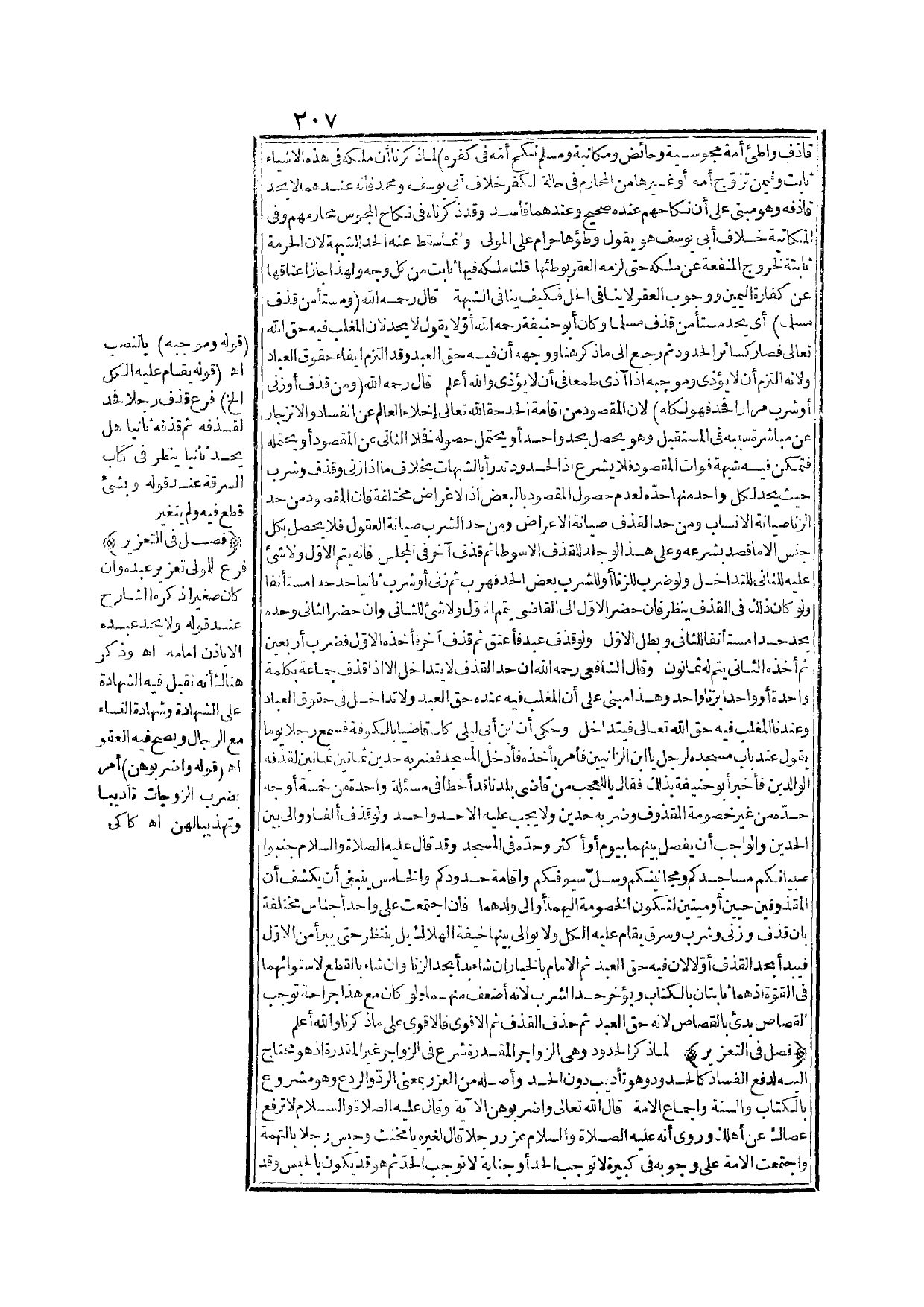 قَاذِفِ وَاطِئِ أَمَةٍ مَجُوسِيَّةٍ وَحَائِضٍ وَمُكَاتَبَةٍ، وَمُسْلِمٍ نَكَحَ أُمَّهُ فِي كُفْرِهِ) لِمَا ذَكَرْنَا أَنَّ مِلْكَهُ فِي هَذِهِ الْأَشْيَاءِ ثَابِتٌ وَفِيمَنْ تَزَوَّجَ أُمَّهُ أَوْ غَيْرَهَا مِنْ الْمَحَارِمِ فِي حَالَةِ الْكُفْرِ خِلَافُ أَبِي يُوسُفَ وَمُحَمَّدٍ فَإِنَّهُ عِنْدَهُمَا لَا يُحَدُّ قَاذِفُهُ وَهُوَ مَبْنِيٌّ عَلَى أَنَّ نِكَاحَهُمْ عِنْدَهُ صَحِيحٌ وَعِنْدَهُمَا فَاسِدٌ وَقَدْ ذَكَرْنَاهُ فِي نِكَاحِ الْمَجُوسِ مَحَارِمَهُمْ وَفِي الْمُكَاتَبَةِ خِلَافُ أَبِي يُوسُفَ هُوَ يَقُولُ وَطْؤُهَا حَرَامٌ عَلَى الْمَوْلَى وَإِنَّمَا سَقَطَ عَنْهُ الْحَدُّ لِلشُّبْهَةِ لِأَنَّ الْحُرْمَةَ ثَابِتَةٌ لِخُرُوجِ الْمَنْفَعَةِ عَنْ مِلْكِهِ حَتَّى لَزِمَهُ الْعُقْرُ بِوَطْئِهَا قُلْنَا مِلْكُهُ فِيهَا ثَابِتٌ مِنْ كُلِّ وَجْهٍ وَلِهَذَا جَازَ إعْتَاقُهَا عَنْ كَفَّارَةِ الْيَمِينِ وَوُجُوبُ الْعُقْرِ لَا يُنَافِي الْحِلَّ فَكَيْفَ يُنَافِي الشُّبْهَةَ.