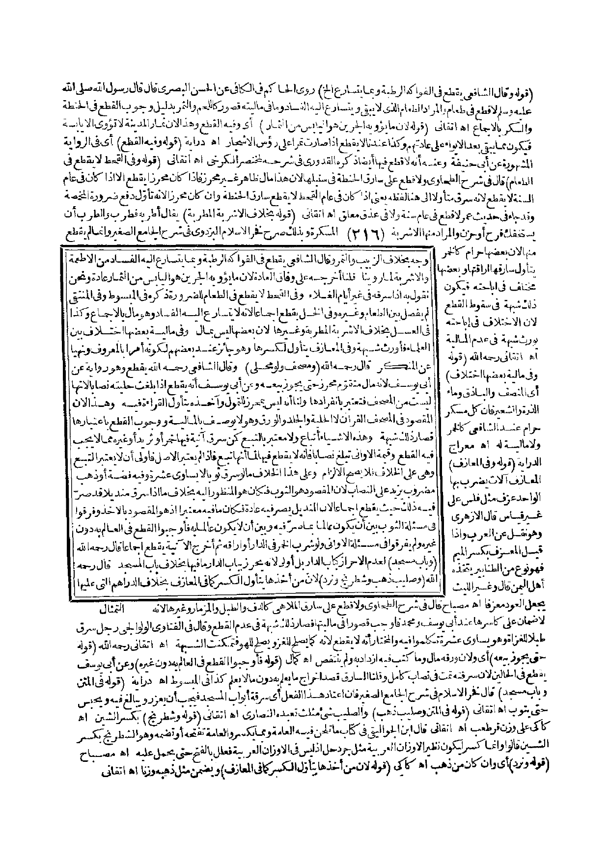 وَبِذَلِكَ صَرَّحَ فَخْرُ الْإِسْلَامِ الْبَزْدَوِيُّ فِي شَرْحِ الْجَامِعِ الصَّغِيرِ وَإِنَّمَا لَمْ يُقْطَعْ مِنْهَا لِأَنَّ بَعْضَهَا حَرَامٌ كَالْخَمْرِ يَتَأَوَّلُ سَارِقُهَا إرَاقَتَهَا وَبَعْضُهَا مُخْتَلَفٌ فِي إبَاحَتِهِ فَيَكُونُ ذَلِكَ شُبْهَةً فِي سُقُوطِ الْقَطْعِ لِأَنَّ الِاخْتِلَافَ فِي إبَاحَتِهِ يُورِثُ شُبْهَةً فِي عَدَمِ الْمَالِيَّةِ. اهـ. أَتْقَانِيٌّ - رَحِمَهُ اللَّهُ - (قَوْلُهُ وَفِي مَالِيَّةِ بَعْضِهَا اخْتِلَافٌ) أَيْ الْمُنْصَفِ وَالْبَاذِقِ وَمَاءِ الذُّرَةِ وَالشَّعِيرِ فَإِنَّ كُلَّ مُسْكِرٍ حَرَامٌ عِنْدَ الشَّافِعِيِّ كَالْخَمْرِ وَلَا مَالِيَّةَ لَهُ. اهـ. مِعْرَاجُ الدِّرَايَةِ (قَوْلُهُ وَفِي الْمَعَازِفِ) الْمَعَازِفُ آلَاتٌ يَضْرِبُ بِهَا الْوَاحِدُ عَزْفٌ مِثْلُ فَلْسٍ عَلَى غَيْرِ قِيَاسٍ قَالَ الْأَزْهَرِيُّ وَهُوَ نَقْلٌ عَنْ الْعَرَبِ وَإِذَا قِيلَ الْمِعْزَفُ بِكَسْرِ الْمِيمِ فَهُوَ نَوْعٌ مِنْ الطَّنَابِيرِ يَتَّخِذُهُ أَهْلُ الْيَمَنِ قَالَ وَغَيْرُ اللَّيْثِ يَجْعَلُ الْعُودَ مِعْزَفًا. اهـ. مِصْبَاحٌ قَالَ فِي شَرَحَ الطَّحَاوِيِّ وَلَا قَطْعَ عَلَى سَارِقِ الْمَلَاهِي كَالدُّفِّ وَالطَّبْلِ وَالْمِزْمَارِ وَغَيْرِهَا لِأَنَّهُ لَا ضَمَانَ عَلَى كَاسِرِهَا عِنْدَ أَبِي يُوسُفَ وَمُحَمَّدٍ فَأَوْجَبَ قُصُورًا فِي مَالِيَّتِهَا فَصَارَ ذَلِكَ شُبْهَةً فِي عَدَمِ الْقَطْعِ وَقَالَ فِي الْفَتَاوَى الْوَلْوَالِجِيُّ رَجُلٌ سَرَقَ طَبْلًا لِلْغُزَاةِ وَهُوَ يُسَاوِي عَشَرَةً تَكَلَّمُوا فِيهِ
