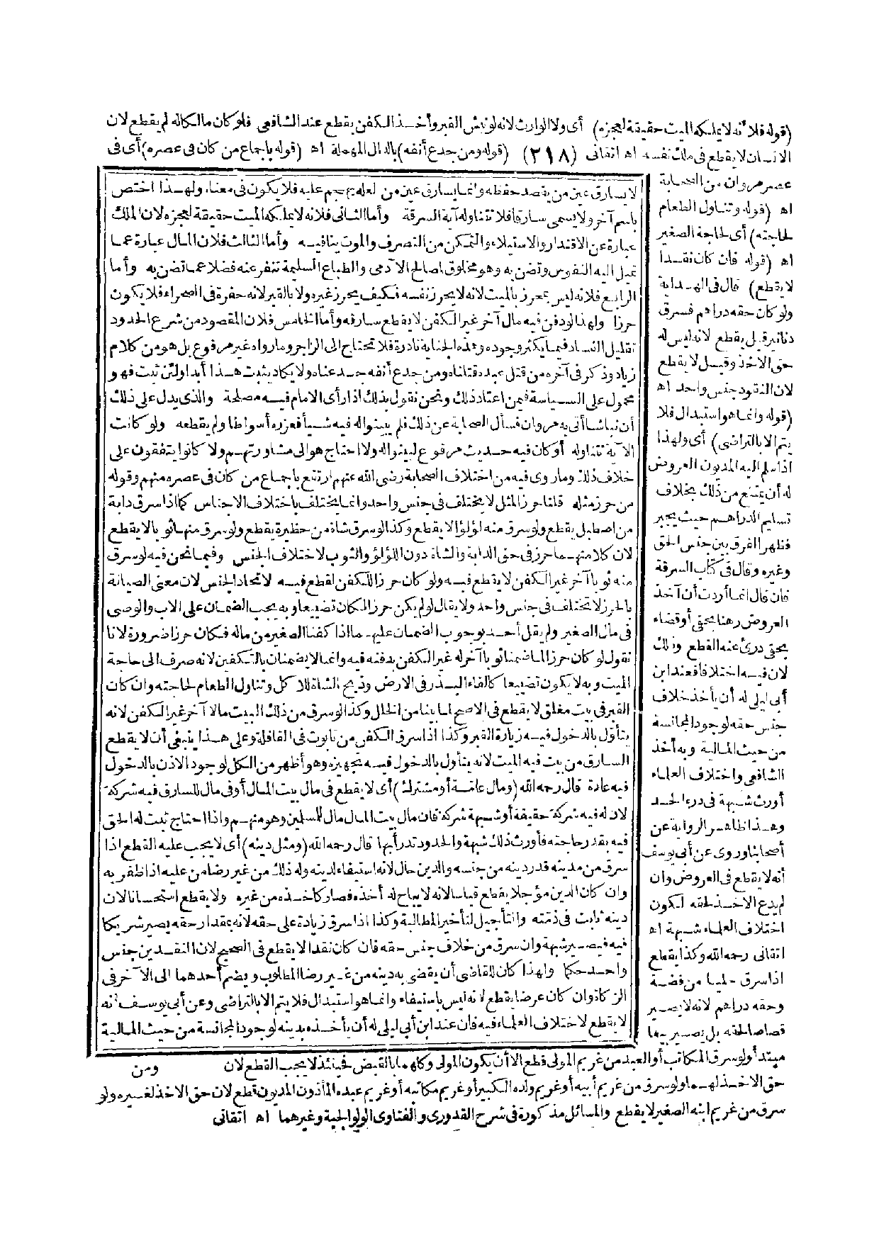 قَالَ - رَحِمَهُ اللَّهُ - (وَمَالُ عَامَّةٍ أَوْ مُشْتَرَكٍ) أَيْ لَا يُقْطَعُ فِي مَالِ بَيْتِ الْمَالِ أَوْ فِي مَالٍ لِلسَّارِقِ فِيهِ شَرِكَةً لِأَنَّ لَهُ فِيهِ شَرِكَةً حَقِيقَةً أَوْ شُبْهَةَ شَرِكَةٍ فَإِنَّ مَالَ بَيْتِ الْمَالِ مَالٌ لِلْمُسْلِمِينَ وَهُوَ مِنْهُمْ وَإِذَا احْتَاجَ ثَبَتَ لَهُ الْحَقُّ فِيهِ بِقَدْرِ حَاجَتِهِ فَأَوْرَثَ ذَلِكَ شُبْهَةً وَالْحُدُودُ تُدْرَأُ بِهَا.