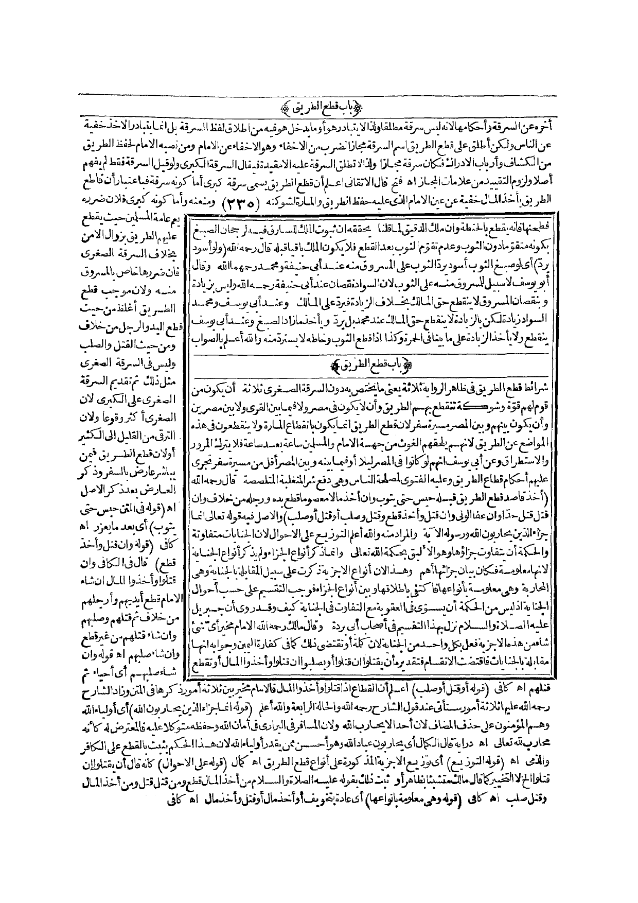 (بَابُ قَطْعِ الطَّرِيقِ) شَرَائِطُ قَطْعِ الطَّرِيقِ فِي ظَاهِرِ الرِّوَايَةِ ثَلَاثَةٌ يَعْنِي مَا يَخْتَصُّ بِهِ دُونَ السَّرِقَةِ الصُّغْرَى ثَلَاثَةٌ أَنْ يَكُونَ مِنْ قَوْمٍ لَهُمْ قُوَّةٌ وَشَوْكَةٌ تَنْقَطِعُ بِهِمْ الطَّرِيقُ، وَأَنْ لَا يَكُونَ فِي مِصْرٍ وَلَا فِيمَا بَيْنَ الْقُرَى وَلَا بَيْنَ مِصْرَيْنِ، وَأَنْ يَكُونَ بَيْنَهُمْ وَبَيْنَ الْمِصْرِ مَسِيرَةُ سَفَرٍ لِأَنَّ قَطْعَ الطَّرِيقِ إنَّمَا يَكُونُ بِانْقِطَاعِ الْمَارَّةِ وَلَا يَنْقَطِعُونَ فِي هَذِهِ الْمَوَاضِعِ عَنْ الطَّرِيقِ لِأَنَّهُمْ يَلْحَقُهُمْ الْغَوْثُ مِنْ جِهَةِ الْإِمَامِ وَالْمُسْلِمِينَ سَاعَةً بَعْدَ سَاعَةٍ فَلَا يُتْرَكُ الْمُرُورُ وَالِاسْتِطْرَاقُ وَعَنْ أَبِي يُوسُفَ أَنَّهُمْ لَوْ كَانُوا فِي الْمِصْرِ لَيْلًا أَوْ فِيمَا بَيْنَهُ وَبَيْنَ الْمِصْرِ أَقَلُّ مِنْ مَسِيرَةِ سَفَرٍ تَجْرِي عَلَيْهِمْ أَحْكَامُ قُطَّاعِ الطَّرِيقِ وَعَلَيْهِ الْفَتْوَى