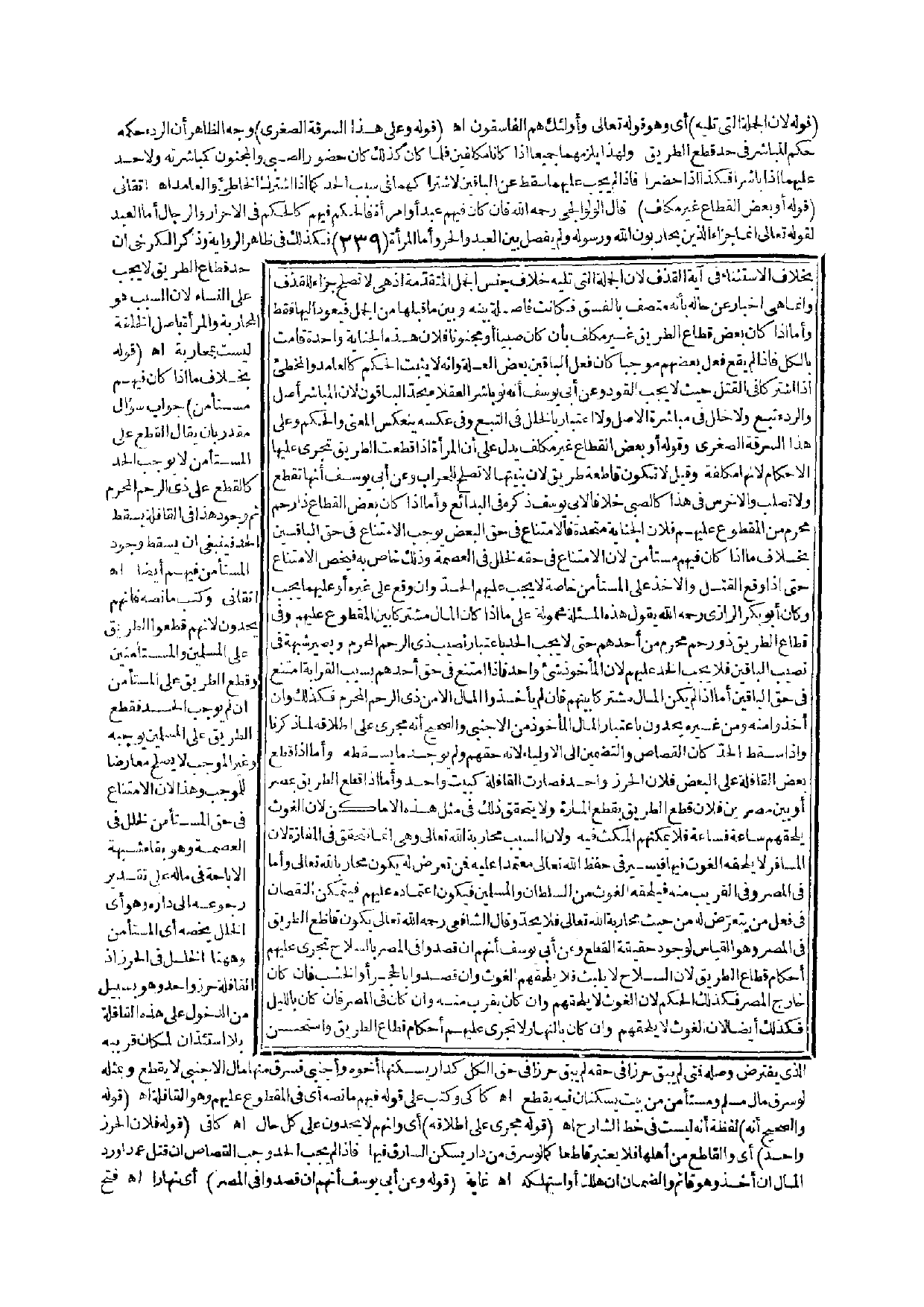 ـــــــــــــــــــــــــــــQقَوْلُهُ لِأَنَّ الْجُمْلَةَ الَّتِي تَلِيه) أَيْ وَهُوَ قَوْله تَعَالَى {وَأُولَئِكَ هُمُ الْفَاسِقُونَ} [النور: 4]. اهـ. (قَوْلُهُ وَعَلَى هَذَا السَّرِقَةُ الصُّغْرَى) وَجْهُ الظَّاهِرِ أَنَّ الرِّدْءَ حُكْمُهُ حُكْمُ الْمُبَاشِرِ فِي حَدِّ قَطْعِ الطَّرِيقِ وَلِهَذَا يَلْزَمُهُمَا جَمِيعًا إذَا كَانَا مُكَلَّفِينَ فَلَمَّا كَانَ كَذَلِكَ كَانَ حُضُورُ الصَّبِيِّ وَالْمَجْنُونِ كَمُبَاشَرَتِهِ وَلَا حَدَّ عَلَيْهِمَا إذَا بَاشَرَا فَكَذَا إذَا حَضَرَا فَإِذَا لَمْ يَجِبْ عَلَيْهِمَا سَقَطَ عَنْ الْبَاقِينَ لِاشْتِرَاكِهِمَا فِي سَبَبِ الْحَدِّ كَمَا إذَا اشْتَرَكَ الْخَاطِئُ وَالْعَامِدُ. اهـ. أَتْقَانِيٌّ (قَوْلُهُ أَوْ بَعْضُ الْقُطَّاعِ غَيْرُ مُكَلَّفٍ) قَالَ الْوَلْوَالِجِيُّ - رَحِمَهُ اللَّهُ - فَإِنْ كَانَ فِيهِمْ عَبْدٌ أَوْ امْرَأَةٌ فَالْحُكْمُ فِيهِمْ كَالْحُكْمِ فِي الْأَحْرَارِ وَالرِّجَالِ أَمَّا الْعَبْدُ لِقَوْلِهِ تَعَالَى {إِنَّمَا جَزَاءُ الَّذِينَ يُحَارِبُونَ اللَّهَ وَرَسُولَهُ} [المائدة: 33] وَلَمْ يَفْصِلْ بَيْنَ الْعَبْدِ وَالْحُرِّ وَأَمَّا الْمَرْأَةُ فَكَذَلِكَ فِي ظَاهِرِ الرِّوَايَةِ وَذَكَرَ الْكَرْخِيُّ إنَّ حَدَّ قُطَّاعِ الطَّرِيقِ لَا يَجِبُ عَلَى النِّسَاءِ لِأَنَّ السَّبَبَ هُوَ الْمُحَارَبَةُ وَالْمَرْأَةُ بِأَصْلِ الْخِلْقَةِ لَيْسَتْ بِمُحَارِبَةٍ اهـ.
