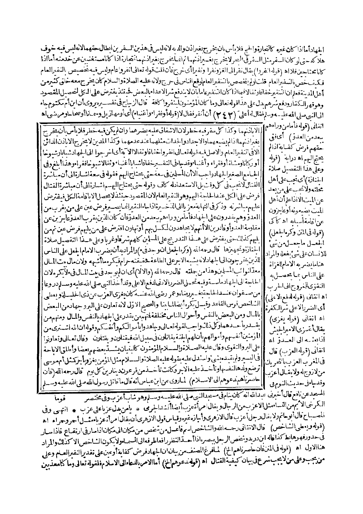 (قَوْلُهُ {انْفِرُوا} [النساء: 71] يُقَالُ نَفَرَ إلَى الْغَزْوِ نَفْرًا وَنَفِيرًا أَيْ خَرَجَ فَإِنْ قُلْت قَوْله تَعَالَى {انْفِرُوا} [النساء: 71] عَامٌّ وَلَيْسَ فِيهِ تَخْصِيصٌ بِالنَّفِيرِ الْعَامِّ فَكَيْفَ خَصَّ بِالتَّنْفِيرِ الْعَامِّ قُلْت لَوْ لَمْ يَتَخَصَّصَ بِالتَّنْفِيرِ الْعَامِّ لَوَقَعَ النَّاسُ فِي حَرَجٍ وَلِأَنَّهُ - عَلَيْهِ الصَّلَاةُ وَالسَّلَامُ - كَانَ يَخْرُجُ مَعَهُ خَلْقٌ كَثِيرٌ مِنْ أَهْلِ الْمَدِينَةِ فَعُلِمَ أَنَّ التَّنْفِيرَ خِفَافًا وَثِقَالًا فِيمَا إذَا كَانَ التَّنْفِيرُ عَامًّا بِأَنْ لَا يَنْدَفِعَ شَرُّ الْأَعْدَاءِ بِالْبَعْضِ فَحِينَئِذٍ يُفْتَرَضُ عَلَى الْكُلِّ لِتَحْصِيلِ الْمَقْصُودِ وَهُوَ قَهْرُ الْكُفَّارِ وَدَفْعُ شَرِّهِمْ يَدُلُّ عَلَى هَذَا قَوْله تَعَالَى {وَمَا كَانَ الْمُؤْمِنُونَ لِيَنْفِرُوا كَافَّةً} [التوبة: 122] قَالَ الزَّجَّاجُ فِي تَفْسِيرِهِ يُرْوَى أَنَّ «ابْنَ أُمِّ مَكْتُومٍ جَاءَ إلَى النَّبِيِّ - صَلَّى اللَّهُ عَلَيْهِ وَسَلَّمَ - فَقَالَ لَهُ أَعَلَيَّ أَنْ أَنْفِرَ فَقَالَ لَا» (قَوْلُهُ أَوْ فُقَرَاءَ وَأَغْنِيَاءَ) أَيْ أَوْ مَهَازِيلَ وَسِمَانًا أَوْ صِحَاحًا وَمَرْضَى. اهـ. أَتْقَانِيٌّ (قَوْلُهُ فَأَمَّا مَنْ وَرَاءَهُمْ بِبَعْدٍ مِنْ الْعَدُوِّ) أَيْ فَفِي حَقِّهِمْ فَرْضُ كِفَايَةٍ إذَا لَمْ يَحْتَجْ إلَيْهِمْ. اهـ. دِرَايَةٌ (قَوْلُهُ وَعَلَى هَذَا التَّفْصِيلِ صَلَاةُ الْجِنَازَةِ) أَيْ تَجِبُ عَلَى أَهْلِ مَحَلَّتِهِ وَلَا تَجِبُ عَلَى مَنْ بَعُدَ عَنْ الْمَيِّتِ إلَّا إذَا عَلِمَ أَنَّ أَهْلَ الْمَيِّتِ يُضَيِّعُونَهُ أَوْ عَاجِزُونَ عَنْ إقَامَةِ أَسْبَابِهِ. اهـ. كَاكِيٌّ