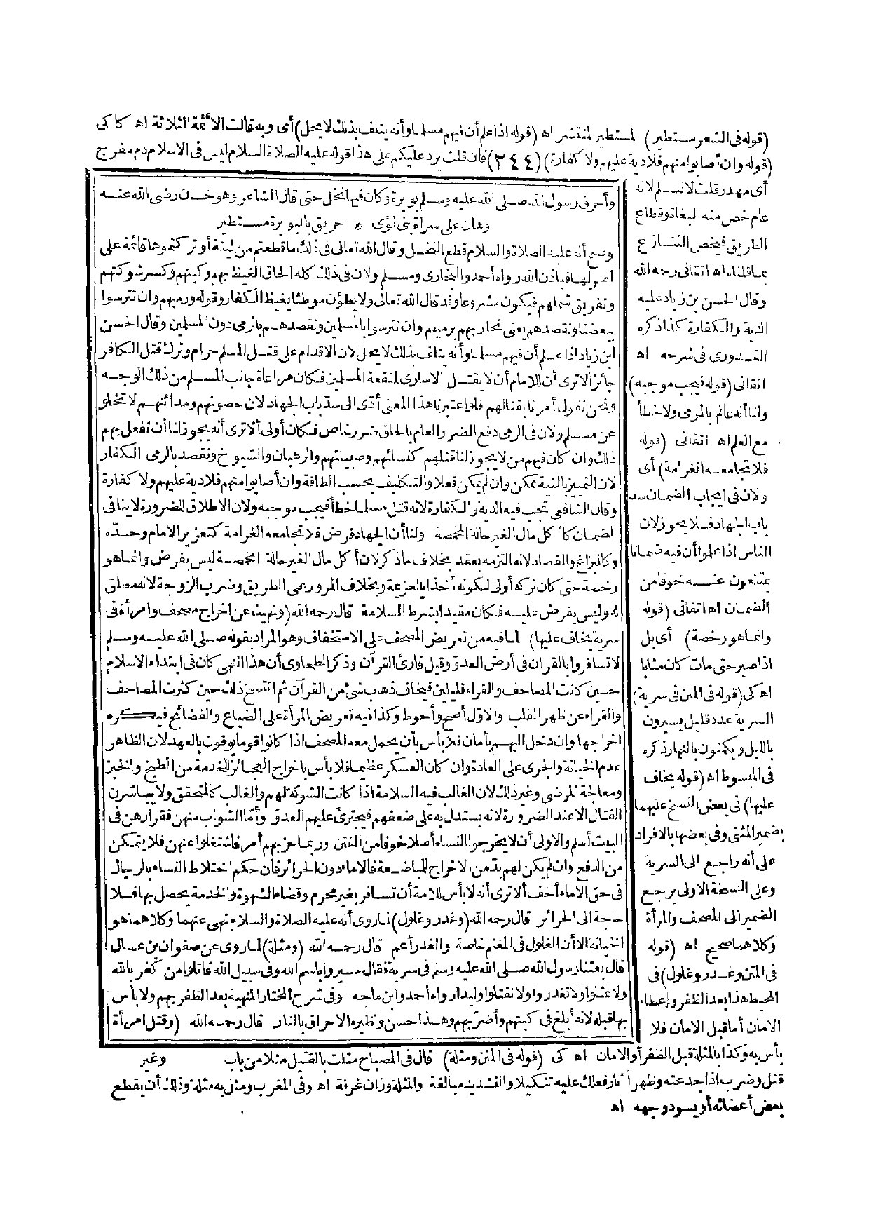 (قَوْلُهُ فِي الْمَتْنِ فِي سَرِيَّةٍ) السَّرِيَّةُ عَدَدٌ قَلِيلٌ يَسِيرُونَ بِاللَّيْلِ وَيَكْمُنُونَ بِالنَّهَارِ ذَكَرَهُ فِي الْمَبْسُوطِ. اهـ. (قَوْلُهُ يَخَافُ عَلَيْهَا) فِي بَعْضِ النُّسَخِ عَلَيْهِمَا بِضَمِيرِ الْمُثَنَّى وَفِي بَعْضِهَا بِالْإِفْرَادِ عَلَى أَنَّهُ رَاجِعٌ إلَى السَّرِيَّةِ وَعَلَى النُّسْخَةِ الْأُولَى يَرْجِعُ الضَّمِيرُ إلَى الْمُصْحَفِ وَالْمَرْأَةِ وَكِلَاهُمَا صَحِيحٌ. اهـ. (قَوْلُهُ فِي الْمَتْنِ وَغَدْرٍ وَغُلُولٍ) فِي الْمُحِيطِ هَذَا بَعْدَ الظُّفْرِ، وَإِعْطَاءِ الْأَمَانِ أَمَّا قَبْلَ الْأَمَانِ فَلَا بَأْسَ بِهِ وَكَذَا بِالْمُثْلَةِ قَبْلَ الظُّفْرِ، أَوْ الْأَمَانِ. اهـ. كَيْ (قَوْلُهُ فِي الْمَتْنِ وَمُثْلَةٍ) قَالَ فِي الْمِصْبَاحِ مَثَّلْت، بِالْقَتِيلِ مَثَلًا، مِنْ بَابِ قَتَلَ وَضَرَبَ إذَا جَدَعْته وَظَهَرَ آثَارُ فِعْلِك عَلَيْهِ تَنْكِيلًا، وَالتَّشْدِيدُ مُبَالَغَةً، وَالْمُثْلَةُ وِزَانُ غَرْفَةٍ، اهـ وَفِي الْمُغْرِبِ وَمَثَّلَ بِهِ مُثْلَةً وَذَلِكَ أَنْ يَقْطَعَ بَعْضَ أَعْضَائِهِ أَوْ يُسَوِّدَ وَجْهَهُ. اهـ.