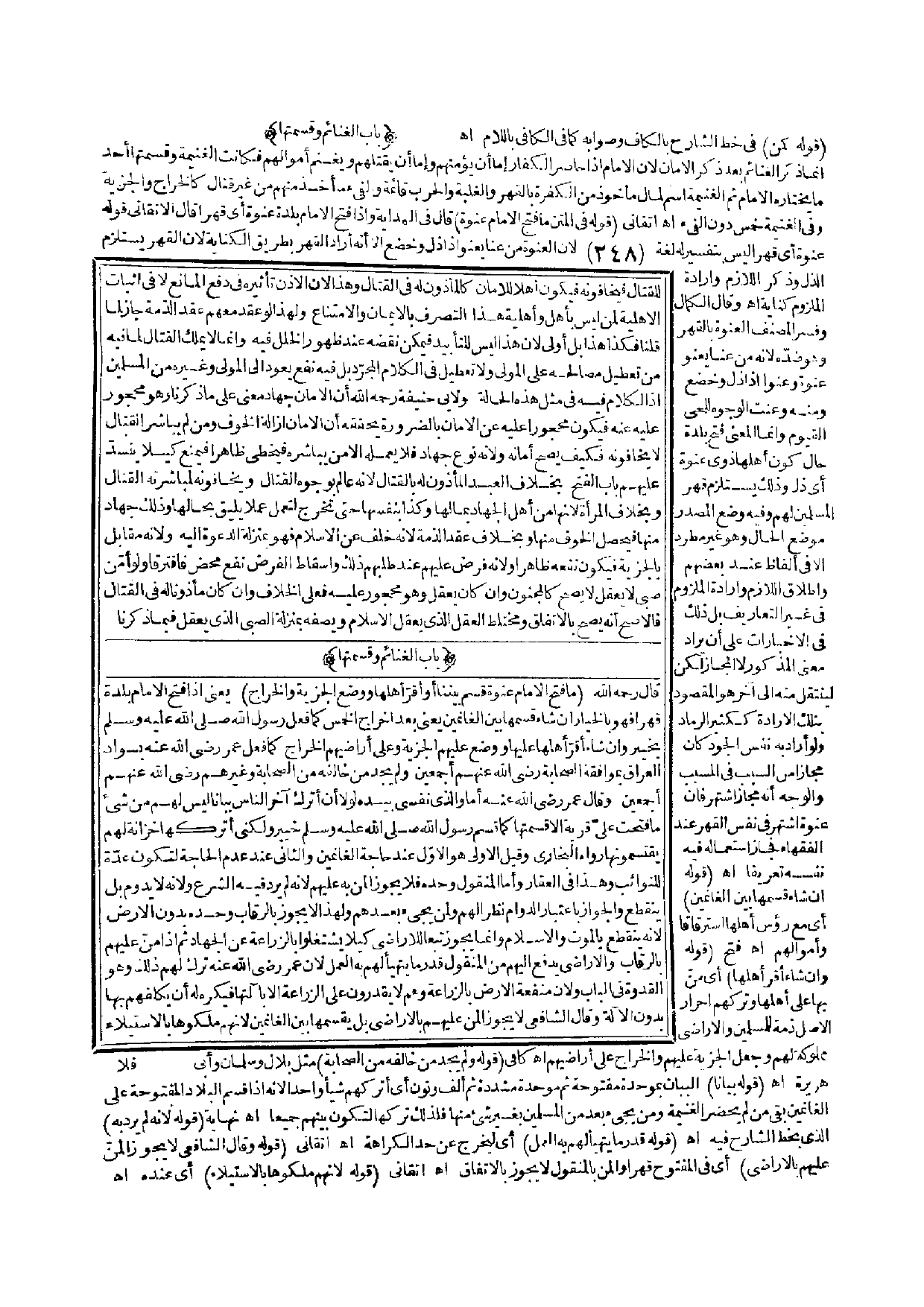 (بَابُ الْغَنَائِمِ وَقِسْمَتُهَا) إنَّمَا ذَكَرَ الْغَنَائِمَ بَعْدَ ذِكْرِ الْأَمَانِ لِأَنَّ الْإِمَامَ إذَا حَاصَرَ الْكُفَّارَ إمَّا أَنْ يُؤَمِّنَهُمْ وَإِمَّا أَنْ يَقْتُلَهُمْ وَيَغْنَمَ أَمْوَالَهُمْ فَكَانَتْ الْغَنِيمَةُ وَقِسْمَتُهَا أَحَدَ مَا يَخْتَارُهُ الْإِمَامُ ثُمَّ الْغَنِيمَةُ اسْمٌ لِمَالٍ مَأْخُوذٍ مِنْ الْكَفَرَةِ بِالْقَهْرِ وَالْغَلَبَةِ وَالْحَرْبُ قَائِمَةٌ وَالْفَيْءُ مَا أُخِذَ مِنْهُمْ مِنْ غَيْرِ قِتَالٍ كَالْخَرَاجِ وَالْجِزْيَةِ وَفِي الْغَنِيمَةِ خُمُسٌ دُونَ الْفَيْءِ. اهـ. أَتْقَانِيٌّ (قَوْلُهُ فِي الْمَتْنِ مَا فَتَحَ الْإِمَامُ عَنْوَةً) قَالَ فِي الْهِدَايَةِ وَإِذَا فَتَحَ الْإِمَامُ بَلْدَةً عَنْوَةً أَيْ قَهْرًا قَالَ الْأَتْقَانِيُّ قَوْلُهُ عَنْوَةً أَيْ قَهْرًا لَيْسَ بِتَفْسِيرٍ لَهُ لُغَةً لِأَنَّ الْعَنْوَةَ مِنْ عَنَا يَعْنُو إذَا ذُلَّ وَخَضَعَ إلَّا أَنَّهُ أَرَادَ الْقَهْرَ بِطَرِيقِ الْكِنَايَةِ لِأَنَّ الْقَهْرَ يَسْتَلْزِمُ الذُّلَّ وَذِكْرُ اللَّازِمِ وَإِرَادَةُ الْمَلْزُومِ كِنَايَةٌ اهـ وَقَالَ الْكَمَالُ وَفَسَّرَ الْمُصَنِّفُ الْعَنْوَةَ بِالْقَهْرِ وَهُوَ ضِدُّهُ لِأَنَّهُ مِنْ عَنَا يَعْنُو عَنْوَةً وَعِنْوًا إذَا ذَلَّ وَخَضَعَ وَمِنْهُ {وَعَنَتِ الْوُجُوهُ لِلْحَيِّ الْقَيُّومِ} [طه: 111] وَإِنَّمَا الْمَعْنَى فَتَحَ بَلْدَةً حَالَ كَوْنِ أَهْلِهَا ذَوِي عَنْوَةٍ أَيْ ذُلٍّ وَذَلِكَ يَسْتَلْزِمُ قَهَرَ الْمُسْلِمِينَ لَهُمْ وَفِيهِ وَضْعُ الْمَصْدَرِ مَوْضِعُ الْحَالِ وَهُوَ غَيْرُ مُطَّرِدٍ إلَّا فِي أَلْفَاظٍ عِنْدَ بَعْضِهِمْ وَإِطْلَاقُ اللَّازِمِ وَإِرَادَةُ الْمَلْزُومِ فِي غَيْرِ التَّعَارِيفِ بَلْ ذَلِكَ فِي الْإِخْبَارَاتِ عَلَى أَنْ يُرَادَ مَعْنَى الْمَذْكُورِ لَا الْمَجَازِ لَكِنْ لِيَنْتَقِلَ مِنْهُ إلَى آخَرَ هُوَ الْمَقْصُودُ بِتِلْكَ الْإِرَادَةِ كَكَثِيرِ الرَّمَادِ وَلَوْ أَرَادَ بِهِ نَفْسَ الْجُودِ كَانَ مَجَازًا مِنْ السَّبَبِ فِي الْمُسَبَّبِ وَالْوَجْهُ أَنَّهُ مَجَازٌ اشْتَهَرَ فَإِنَّ (عَنْوَةً) اُشْتُهِرَ فِي نَفْسِ الْقَهْرِ عِنْدَ الْفُقَهَاءِ فَجَازَ اسْتِعْمَالُهُ فِيهِ نَفْسُهُ تَعْرِيفًا اهـ.