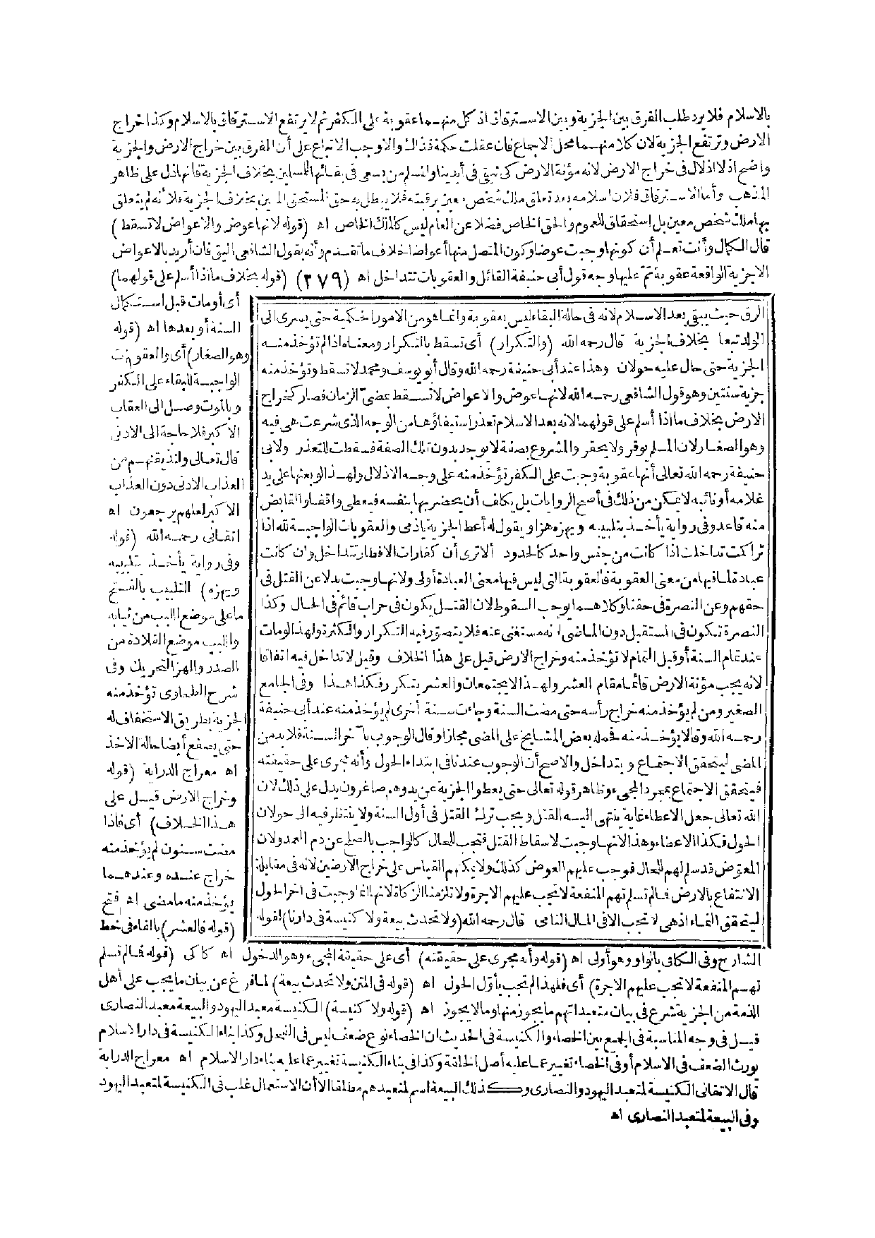 (قَوْلُهُ لِأَنَّهَا عِوَضٌ وَالْأَعْوَاضُ لَا تَسْقُطُ) قَالَ الْكَمَالُ وَأَنْتَ تَعْلَمُ أَنَّ كَوْنَهَا وَجَبَتْ عِوَضًا وَكَوْنَ الْمُتَّصِلِ مِنْهَا أَعْوَاضًا خِلَافُ مَا تَقَدَّمَ وَأَنَّهُ بِقَوْلِ الشَّافِعِيِّ أَلْيَقُ فَإِنْ أُرِيدَ بِالْأَعْوَاضِ الْأَجْزِيَةُ الْوَاقِعَةُ عُقُوبَةً تَمَّ عَلَيْهَا وَجْهُ قَوْلِ أَبِي حَنِيفَةَ الْقَائِلِ: وَالْعُقُوبَاتُ تَتَدَاخَلُ. اهـ. (قَوْلُهُ بِخِلَافِ مَا إذَا أَسْلَمَ عَلَى قَوْلِهِمَا) أَيْ أَوْ مَاتَ قَبْلَ اسْتِكْمَالِ السَّنَةِ أَوْ بَعْدَهَا. اهـ. (قَوْلُهُ وَهُوَ الصَّغَارُ) أَيْ وَالْعُقُوبَاتُ الْوَاجِبَةُ لِلْبَقَاءِ عَلَى الْكُفْرِ وَبِالْمَوْتِ وَصَلَ إلَى الْعِقَابِ الْأَكْبَرِ فَلَا حَاجَةَ إلَى الْأَدْنَى قَالَ تَعَالَى {وَلَنُذِيقَنَّهُمْ مِنَ الْعَذَابِ الأَدْنَى دُونَ الْعَذَابِ الأَكْبَرِ لَعَلَّهُمْ يَرْجِعُونَ} [السجدة: 21]. اهـ. أَتْقَانِيٌّ - رَحِمَهُ اللَّهُ - (قَوْلُهُ وَفِي رِوَايَةٍ يَأْخُذُ بِتَلْبِيبِهِ وَيَهُزُّهُ) التَّلْبِيبُ بِالْفَتْحِ مَا عَلَى مَوْضِعِ اللَّبَبِ مِنْ ثِيَابِهِ وَاللَّبَبُ مَوْضِعُ الْقِلَادَةِ مِنْ الصَّدْرِ وَالْهَزُّ التَّحْرِيكُ وَفِي شَرْحِ الطَّحَاوِيِّ تُؤْخَذُ مِنْهُ الْجِزْيَةُ بِطَرِيقِ الِاسْتِخْفَافِ لَهُ حَتَّى يُصْفَعَ أَيْضًا حَالَةَ الْأَخْذِ. اهـ. مِعْرَاجُ الدِّرَايَةِ (قَوْلُهُ وَخَرَاجُ الْأَرْضِ قِيلَ عَلَى هَذَا الْخِلَافِ) أَيْ فَإِذَا مَضَتْ سُنُونَ لَمْ يُؤْخَذْ مِنْهُ خَرَاجٌ عِنْدَهُ وَعِنْدَهُمَا يُؤْخَذُ مِنْهُ مَا مَضَى اهـ فَتْحٌ (قَوْلُهُ فَالْعُشْرُ) بِالْفَاءِ فِي خَطِّ الشَّارِحِ وَفِي الْكَافِي بِالْوَاوِ وَهُوَ أَوْلَى اهـ (قَوْلُهُ وَأَنَّهُ مُجْرًى عَلَى حَقِيقَتِهِ) أَيْ عَلَى حَقِيقَةِ الْمَجِيءِ وَهُوَ الدُّخُولُ. اهـ. كَاكِيٌّ (قَوْلُهُ فَمَا لَمْ تُسَلَّمْ لَهُمْ الْمَنْفَعَةُ لَا تَجِبُ عَلَيْهِمْ الْأُجْرَةُ) أَيْ فَلِهَذَا لَمْ تَجِبْ بِأَوَّلِ الْحَوْلِ. اهـ.