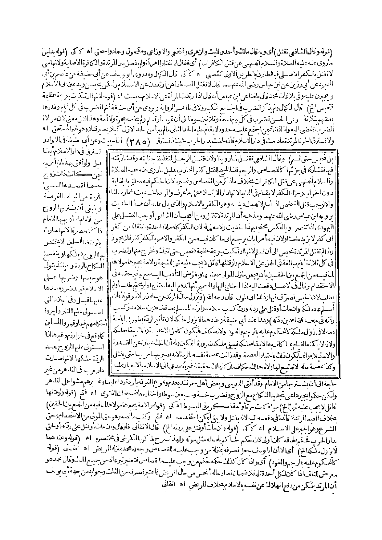 ـــــــــــــــــــــــــــــQقَوْلُهُ وَقَالَ الشَّافِعِيُّ تُقْتَلُ) أَيْ وَبِهِ قَالَ مَالِكٌ وَأَحْمَدُ وَاللَّيْثُ وَالزُّهْرِيُّ وَالنَّخَعِيُّ وَالْأَوْزَاعِيُّ وَمَكْحُولٌ وَحَمَّادٌ وَإِسْحَاقُ. اهـ. كَاكِيٌّ (قَوْلُهُ بِدَلِيلِ مَا رُوِيَ عَنْهُ - عَلَيْهِ الصَّلَاةُ وَالسَّلَامُ - أَنَّهُ «نَهَى عَنْ قَتْلِ الْكَافِرَاتِ») أَيْ فَقَالَ «لَا تَقْتُلُوا امْرَأَةً» وَلَمْ يَفْصِلْ بَيْنَ الْمُرْتَدَّةِ وَالْكَافِرَةِ الْأَصْلِيَّةِ وَلِأَنَّهَا مَتَى لَا تُقْتَلُ بِالْكُفْرِ الْأَصْلِيِّ فَبِالطَّارِئِ بِالطَّرِيقِ الْأَوْلَى كَالصَّبِيِّ. اهـ. كَاكِيٌّ قَالَ الْكَمَالُ وَقَدْ رَوَى أَبُو يُوسُفَ عَنْ أَبِي حَنِيفَةَ عَنْ عَاصِمِ بْنِ أَبِي النَّجُودِ عَنْ أَبِي رَزِينٍ عَنْ ابْنِ عَبَّاسٍ - رَضِيَ اللَّهُ عَنْهُمَا - قَالَ لَا تُقْتَلُ النِّسَاءُ إذَا هُنَّ ارْتَدَدْنَ عَنْ الْإِسْلَامِ وَلَكِنْ يُحْبَسْنَ وَيُدْعَيْنَ إلَى الْإِسْلَامِ وَيُجْبَرْنَ عَلَيْهِ وَفِي بَلَاغَاتِ مُحَمَّدٍ قَالَ بَلَغَنَا عَنْ ابْنِ عَبَّاسٍ أَنَّهُ قَالَ إذَا ارْتَدَّتْ الْمَرْأَةُ عَنْ الْإِسْلَامِ حُبِسَتْ اهـ.