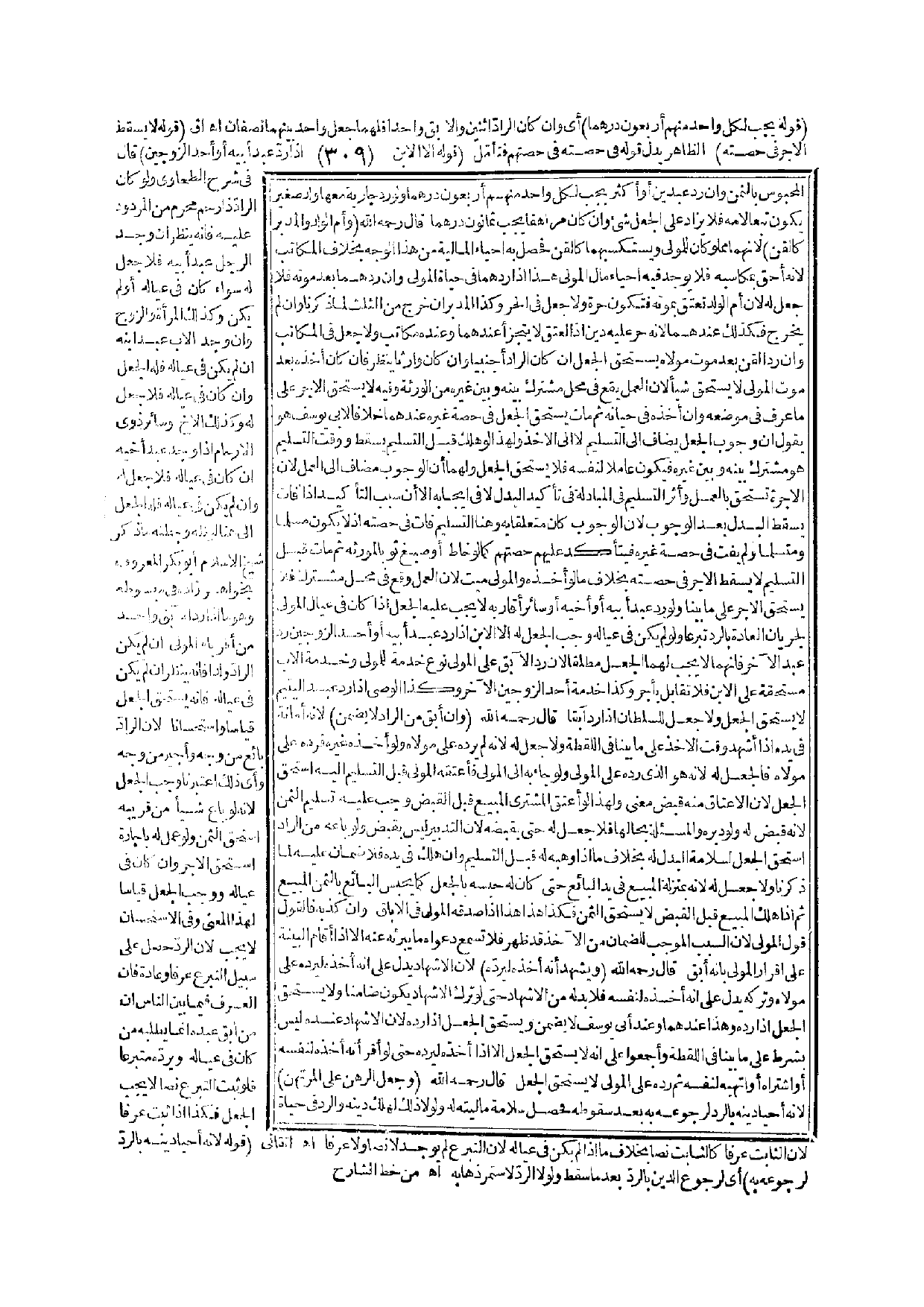 (قَوْلُهُ لَا يَسْقُطُ الْأَجْرُ فِي حِصَّتِهِ) الظَّاهِرُ يَدُلُّ قَوْلُهُ فِي حِصَّتِهِ فِي حِصَّتِهِمْ فَتَأَمَّلْ (قَوْلُهُ إلَّا الِابْنَ إذَا رَدَّ عَبْدَ أَبِيهِ أَوْ أَحَدَ الزَّوْجَيْنِ) قَالَ فِي شَرْحِ الطَّحَاوِيِّ وَلَوْ كَانَ الرَّادُّ ذَا رَحِمٍ مَحْرَمٍ مِنْ الْمَرْدُودِ عَلَيْهِ فَإِنَّهُ يَنْظُرُ إنْ وَجَدَ الرَّجُلُ عَبْدَ أَبِيهِ فَلَا جُعْلَ لَهُ سَوَاءٌ كَانَ فِي عِيَالِهِ أَوْ لَمْ يَكُنْ وَكَذَلِكَ الْمَرْأَةُ وَالزَّوْجُ وَإِنْ وَجَدَ الْأَبُ عَبْدَ ابْنِهِ إنْ لَمْ يَكُنْ فِي عِيَالِهِ فَلَهُ الْجُعْلُ وَإِنْ كَانَ فِي عِيَالِهِ فَلَا جُعْلَ لَهُ وَكَذَلِكَ الْأَخُ وَسَائِرُ ذَوِي الْأَرْحَامِ إذَا وَجَدَ عَبْدَ أَخِيهِ إنْ كَانَ فِي عِيَالِهِ فَلَا جُعْلَ لَهُ وَإِنْ لَمْ يَكُنْ فِي عِيَالِهِ فَلَهُ الْجُعْلُ إلَى هُنَا لَفْظُهُ وَجُمْلَتُهُ مَا ذَكَرَ شَيْخُ الْإِسْلَامِ أَبُو بَكْرٍ الْمَعْرُوفُ بِخُوَاهَرْ زَادَهْ فِي مَبْسُوطِهِ وَهُوَ مَا إذَا رَدَّ الْآبِقَ وَاحِدٌ مِنْ أَقْرِبَاءِ الْمَوْلَى إنْ لَمْ يَكُنْ الرَّادُّ وَلَدًا فَإِنَّهُ يُنْظَرُ إنْ لَمْ يَكُنْ فِي عِيَالِهِ فَإِنَّهُ يَسْتَحِقُّ الْجُعْلَ قِيَاسًا وَاسْتِحْسَانًا لِأَنَّ الرَّادَّ بَائِعٌ مِنْ وَجْهٍ وَأَجِيرٌ مِنْ وَجْهٍ وَأَيُّ ذَلِكَ اعْتَبَرْنَا وَجَبَ الْجُعْلُ لِأَنَّهُ لَوْ بَاعَ شَيْئًا مِنْ قَرِيبِهِ اسْتَحَقَّ الثَّمَنَ وَلَوْ عَمِلَ لَهُ بِإِجَارَةٍ اسْتَحَقَّ الْأَجْرَ وَإِنْ كَانَ فِي عِيَالِهِ وَوَجَبَ الْجُعْلُ قِيَاسًا لِهَذَا الْمَعْنَى وَفِي الِاسْتِحْسَانِ لَا يَجِبُ لِأَنَّ الرَّدَّ حَصَلَ عَلَى سَبِيلِ التَّبَرُّعِ عُرْفًا وَعَادَةً فَإِنَّ الْعُرْفَ فِيمَا بَيْنَ النَّاسِ أَنَّ مَنْ أَبَقَ عَبْدُهُ إنَّمَا يَطْلُبُهُ مَنْ كَانَ فِي عِيَالِهِ وَيَرُدُّهُ مُتَبَرِّعًا فَلَوْ ثَبَتَ التَّبَرُّعُ نَصًّا لَا يَجِبُ الْجُعْلُ فَكَذَا إذَا ثَبَتَ عُرْفًا لِأَنَّ الثَّابِتَ عُرْفًا كَالثَّابِتِ نَصًّا بِخِلَافِ مَا إذَا لَمْ يَكُنْ فِي عِيَالِهِ لِأَنَّ التَّبَرُّعَ لَمْ يُوجَدْ لَا نَصًّا وَلَا عُرْفًا. اهـ. أَتْقَانِيٌّ