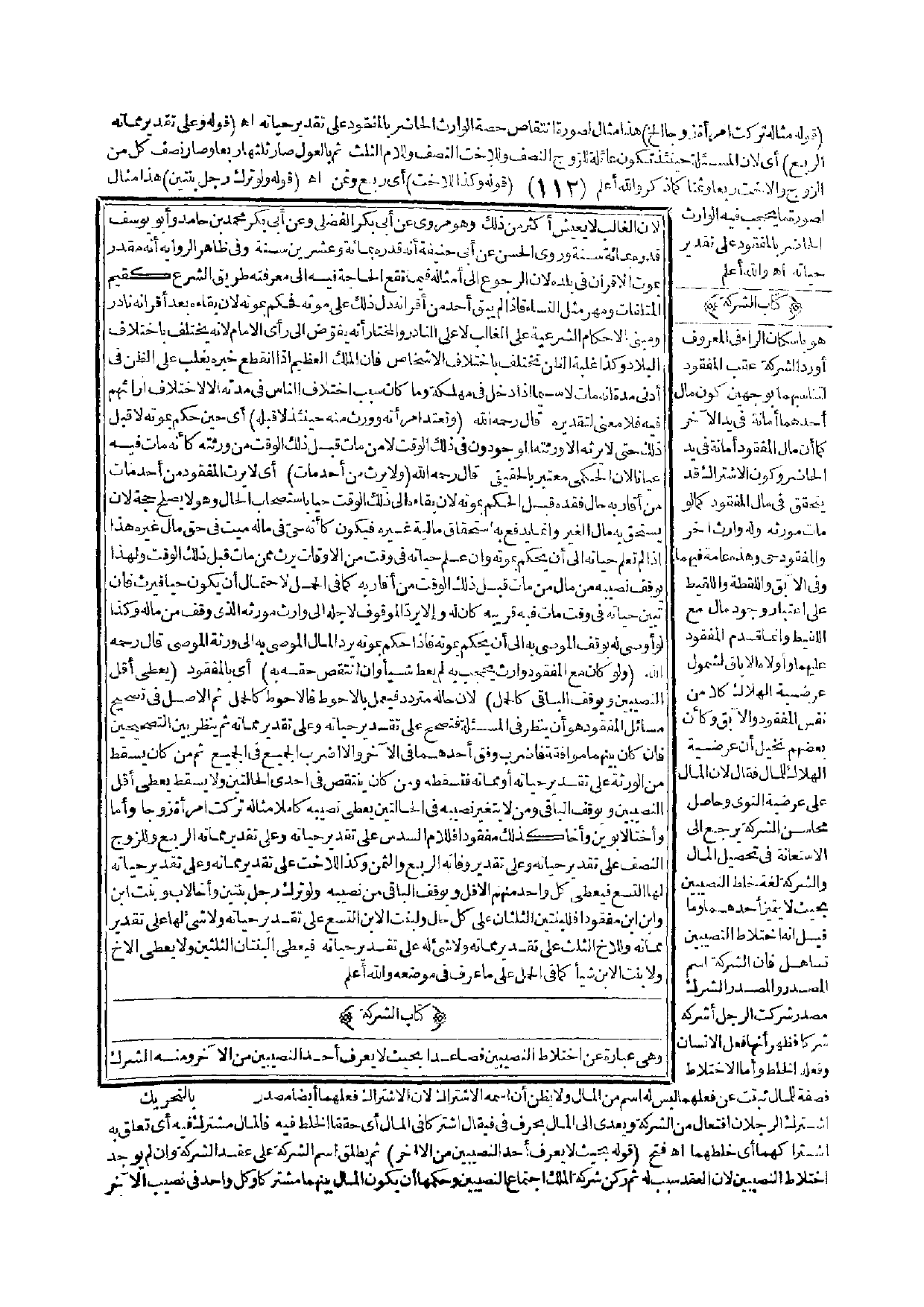 هُوَ بِإِسْكَانِ الرَّاءِ فِي الْمَعْرُوف أَوْ رَدِّ الشِّرْكَةِ عَقِبَ الْمَفْقُودِ لِتَنَاسُبِهِمَا بِوَجْهَيْنِ كَوْنُ مَالِ أَحَدِهِمَا أَمَانَةً فِي يَدِ الْآخَرِ كَمَا أَنَّ مَالَ الْمَفْقُودِ أَمَانَةٌ فِي يَدِ الْحَاضِرِ وَكَوْنُ الِاشْتِرَاكِ قَدْ يَتَحَقَّقُ فِي مَالِ الْمَفْقُودِ كَمَا لَوْ مَاتَ مُوَرِّثُهُ وَلَهُ وَارِثٌ آخَرُ وَالْمَفْقُودُ حَيٌّ وَهَذِهِ عَامَّةٌ فِيهِمَا وَفِي الْآبِقِ وَاللُّقَطَةُ وَاللَّقِيطُ عَلَى اعْتِبَارِ وُجُودِ مَالٍ مَعَ اللَّقِيطِ وَإِنَّمَا قَدَّمَ الْمَفْقُودَ عَلَيْهِمَا وَأَوْلَاهُ الْإِبَاقُ لِشُمُولِ عَرَضِيَّةِ الْهَلَاكِ كُلًّا مِنْ نَفْسِ الْمَفْقُودِ وَالْآبِقِ وَكَأَنَّ بَعْضَهُمْ تَخَيَّلَ أَنَّ عَرْضِيَّةَ الْهَلَاكِ لِلْمَالِ فَقَالَ لِأَنَّ الْمَالَ عَلَى عَرْضِيَّةِ التَّوَى وَحَاصِلُ مَحَاسِنِ الشَّرِكَةِ يَرْجِعُ إلَى الِاسْتِعَانَةِ فِي تَحْصِيلِ الْمَالِ وَالشِّرْكَةُ لُغَةً خَلْطُ النَّصِيبَيْنِ بِحَيْثُ لَا يَتَمَيَّزُ أَحَدُهُمَا وَمَا قِيلَ إنَّهُ اخْتِلَاطُ النَّصِيبَيْنِ تَسَاهُلٌ فَإِنَّ الشِّرْكَةَ اسْمُ الْمَصْدَرِ وَالْمَصْدَرُ الشِّرْكُ مَصْدَرُ شَرِكْت الرَّجُلَ أَشَرَكُهُ شِرْكًا فَظَهَرَ أَنَّهَا فِعْلُ الْإِنْسَانِ وَفِعْلُهُ الْخَلْطُ وَأَمَّا الِاخْتِلَاطُ فَصِفَةٌ لِلْمَالِ ثَبَتَتْ عَنْ فِعْلِهِمَا لَيْسَ لَهُ اسْمٌ مِنْ الْمَالِ وَلَا يُظَنُّ أَنَّ اسْمَهُ الِاشْتِرَاكُ لِأَنَّ الِاشْتِرَاكَ فِعْلُهُمَا أَيْضًا مَصْدَرُ اشْتَرَكَ الرَّجُلَانِ افْتِعَالٌ مِنْ الشِّرْكَةِ وَيُعَدَّى إلَى الْمَالِ بِحَرْفِ فِي فَيُقَالُ اشْتَرَكَا فِي الْمَالِ أَيْ حَقَّقَا الْخَلْطَ فِيهِ فَالْمَالُ مُشْتَرَكٌ فِيهِ أَيْ تَعَلَّقَ بِهِ اشْتِرَاكُهُمَا أَيْ خَلْطُهُمَا. اهـ. فَتْحٌ (قَوْلُهُ بِحَيْثُ لَا يُعْرَفُ أَحَدُ النَّصِيبَيْنِ مِنْ الْآخَرِ) ثُمَّ يُطْلَقُ اسْمُ الشِّرْكَةِ عَلَى عَقْدِ الشِّرْكَةِ وَإِنْ لَمْ يُوجَدْ اخْتِلَاطُ النَّصِيبَيْنِ لِأَنَّ الْعَقْدَ سَبَبٌ لَهُ ثُمَّ رُكْنُ شِرْكَةِ الْمِلْكِ اجْتِمَاعُ النَّصِيبَيْنِ وَحُكْمُهَا أَنْ يَكُونَ الْمَالُ بَيْنَهُمَا مُشْتَرَكًا وَكُلُّ وَاحِدٍ فِي نَصِيبِ الْآخَرِ
