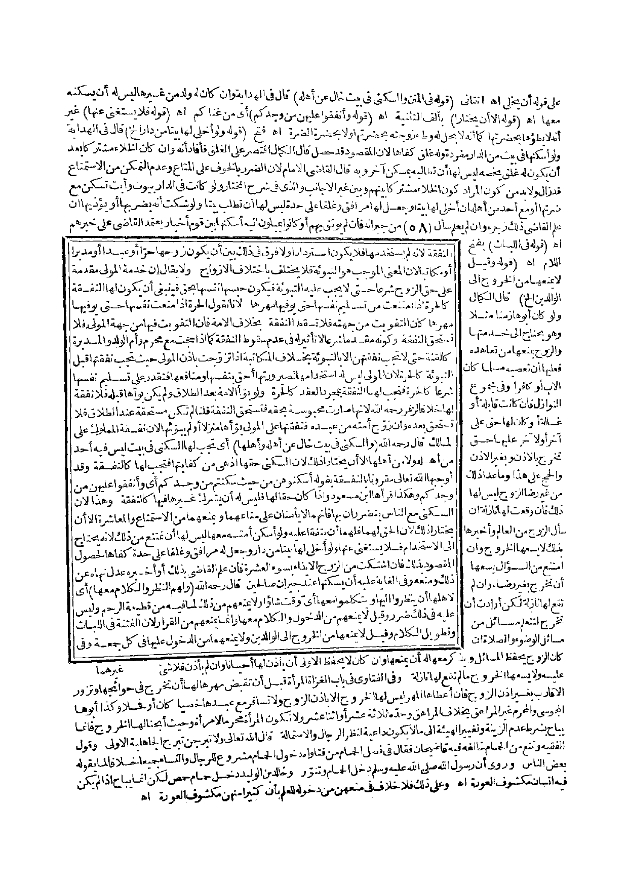 (قَوْلُهُ فِي الْمَتْنِ وَالسُّكْنَى فِي بَيْتٍ خَالٍ عَنْ أَهْلِهِ) قَالَ فِي الْهِدَايَةِ وَإِنْ كَانَ لَهُ وَلَدٌ مِنْ غَيْرِهَا لَيْسَ لَهُ أَنْ يُسْكِنَهُ مَعَهَا. اهـ. (قَوْلُهُ إلَّا أَنْ يَخْتَارَا) بِأَلِفِ التَّثْنِيَةِ. اهـ. (قَوْلُهُ {فَأَنْفِقُوا عَلَيْهِنَّ} [الطلاق: 6] {مِنْ وُجْدِكُمْ} [الطلاق: 6] أَيْ مِنْ غِنَاكُمْ اهـ (قَوْلُهُ فَلَا يَسْتَغْنِي عَنْهَا) غَيْرَ أَنَّهُ لَا يَطَؤُهَا بِحَضْرَتِهَا كَمَا أَنَّهُ لَا يَحِلُّ لَهُ وَطْءُ زَوْجَتِهِ بِحَضْرَتِهَا وَلَا بِحَضْرَةِ الضَّرَّةِ. اهـ. فَتْحٌ (قَوْلُهُ وَلَوْ أَخْلَى لَهَا بَيْتًا مِنْ دَارٍ إلَخْ) قَالَ فِي الْهِدَايَةِ، وَلَوْ أَسْكَنَهَا فِي بَيْتٍ مِنْ الدَّارِ مُفْرَدَةً، وَلَهُ غَلْقٌ كَفَاهَا لِأَنَّ الْمَقْصُودَ قَدْ حَصَلَ قَالَ الْكَمَالُ اقْتَصَرَ عَلَى الْغَلْقِ فَأَفَادَ أَنَّهُ، وَإِنْ كَانَ الْخَلَاءُ مُشْتَرَكًا بَعْدَ أَنْ يَكُونَ لَهُ غَلْقٌ يَخُصُّهُ لَيْسَ لَهَا أَنْ تُطَالِبَهُ بِمَسْكَنٍ آخَرَ، وَبِهِ قَالَ الْقَاضِي الْإِمَامُ لِأَنَّ الضَّرَرَ بِالْخَوْفِ عَلَى الْمَتَاعِ وَعَدَمِ التَّمَكُّنِ مِنْ الِاسْتِمْتَاعِ قَدْ زَالَ، وَلَا بُدَّ مِنْ كَوْنِ الْمُرَادِ كَوْنَ الْخَلَاءِ مُشْتَرَكًا بَيْنَهُمْ وَبَيْنَ غَيْرِ الْأَجَانِبِ، وَاَلَّذِي فِي شَرْحِ الْمُخْتَارِ، وَلَوْ كَانَتْ فِي الدَّارِ بُيُوتٌ وَأَبَتْ تَسْكُنُ مَعَ ضَرَّتِهَا أَوْ مَعَ أَحَدٍ مِنْ أَهْلِهِ إنْ أَخْلَى لَهَا بَيْتًا، وَجَعَلَ لَهَا مَرَافِقَ، وَغَلْقًا عَلَى حِدَةٍ لَيْسَ لَهَا أَنْ تَطْلُبَ بَيْتًا، وَلَوْ شَكَّتْ أَنَّهُ يَضْرِبُهَا أَوْ يُؤْذِيَهَا إنْ عَلِمَ الْقَاضِي ذَلِكَ زَجَرَهُ