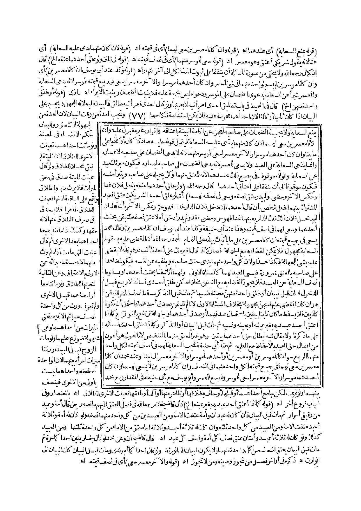 (قَوْلُهُ فِي الْمَتْنِ وَلَوْ عَلَّقَ أَحَدُهُمَا عِتْقَهُ إلَخْ) قَالَ الْكَمَالُ - رَحِمَهُ اللَّهُ - وَلَا يَخْفَى مِنْ صُورَةِ الْمَسْأَلَةِ أَنْ يَتَّفِقَا عَلَى ثُبُوتِ الْمِلْكِ لِكُلٍّ إلَى آخِرِ النَّهَارِ. اهـ. (قَوْلُهُ وَكَذَا عِنْدَ أَبِي يُوسُفَ إنْ كَانَا مُعْسِرَيْنِ) أَيْ، وَإِنْ كَانَا مُوسِرَيْنِ لَمْ يَسْعَ لِوَاحِدٍ مِنْهُمَا فِي شَيْءٍ لِمَا مَرَّ، وَإِنْ كَانَ أَحَدُهُمَا مُوسِرًا، وَالْآخَرُ مُعْسِرًا يَسْعَى فِي رُبْعِ قِيمَتِهِ لِلْمُوسِرِ لِأَنَّهُ يَدَّعِي السِّعَايَةَ، وَالْمُعْسِرُ يَتَبَرَّأُ عَنْ السِّعَايَةِ بِدَعْوَى الضَّمَانِ عَلَى الْمُوسِرِ، وَدَعْوَاهُ لَيْسَ بِحُجَّةٍ عَلَيْهِ فَلَا يَثْبُتُ الضَّمَانُ، وَيَثْبُتُ الْإِبْرَاءُ. اهـ. رَازِيٌّ (قَوْلُهُ أَوْ طَلَّقَ وَاحِدَةً مِنْهُنَّ إلَخْ) قَالَ فِي الْمُحِيطِ فِي بَابِ تَطْلِيقِ إحْدَى امْرَأَتَيْهِ لَا بِعَيْنِهَا، وَلَوْ قَالَ إحْدَى امْرَأَتَيْهِ طَالِقٌ فَالْبَيَانُ إلَيْهِ لِأَنَّهُ الْمُجْهِلُ، وَيُجْبَرُ عَلَى الْبَيَانِ إذَا كَانَ ثَانِيًا أَوْ ثَالِثًا لِأَنَّ إحْدَاهُمَا مُحَرَّمَةٌ عَلَيْهِ فَلَا يُمْكِنُ اسْتِدَامَةُ نِكَاحِهَا، وَتَجِبُ الْعِدَّةُ مِنْ وَقْتِ الْبَيَانِ لِأَنَّ الْعِدَّةَ مِنْ الْمَجْهُولَةِ لَا تُتَصَوَّرُ، وَلِلْبَيَانِ حُكْمُ الْإِنْشَاءِ فِي الْمُعَيَّنَةِ، وَلَوْ مَاتَتْ إحْدَاهُمَا تَعَيَّنَتْ الْأُخْرَى لِلطَّلَاقِ لِأَنَّ الْمَيِّتَةَ لَمْ تَبْقَ مَحَلًّا لِلطَّلَاقِ، وَلَوْ قَالَ عَيَّنْت الْمَيِّتَةَ صُدِّقَ فِي حَقِّ الْمِيرَاثِ فَلَا يَرِثُ مِنْهَا، وَالطَّلَاقُ وَاقِعٌ عَلَى الْبَاقِيَةِ لِأَنَّهَا تَعَيَّنَتْ لِلطَّلَاقِ ظَاهِرًا فَلَا يُصَدَّقُ فِي صَرْفِ الطَّلَاقِ عَنْهَا لِأَنَّهُ حَقُّهَا، وَكَذَلِكَ إذَا مَاتَتَا جَمِيعًا إحْدَاهُمَا بَعْدَ الْأُخْرَى ثُمَّ قَالَ عَيَّنَتْ الَّتِي مَاتَتْ أَوَّلًا لَمْ يَرِثْ مِنْهُمَا لِأَنَّهُ سَقَطَ مِيرَاثُهُ عَنْ الْأُولَى بِالِاعْتِرَافِ، وَعَنْ الثَّانِيَةِ لِتَعَيُّنِهَا لِلطَّلَاقِ، وَلَوْ مَاتَتَا مَعًا أَوْ إحْدَاهُمَا قَبْلَ الْأُخْرَى وَلَمْ تُعْرَفْ وَرِثَ مِنْ كُلِّ وَاحِدَةٍ نِصْفَ مِيرَاثِهَا لِأَنَّهُ يَسْتَحِقُّ الْمِيرَاثَ مِنْ إحْدَاهُمَا وَهِيَ مَجْهُولَةٌ فَيُوَزَّعُ عَلَيْهِمَا، وَلَوْ مَاتَ الزَّوْجُ قَبْلَ الْبَيَانِ وَرِثَتَا مِيرَاثَ امْرَأَةٍ بَيْنَهُمَا لِأَنَّ الْوَاحِدَةَ تَسْتَحِقُّهُ، وَإِحْدَاهُمَا لَيْسَتْ بِأَوْلَى مِنْ الْأُخْرَى فَيُنَصَّفُ بَيْنَهُمَا، وَلَوْ لَمْ يَمُتْ لَكِنْ جَامَعَ إحْدَاهُمَا أَوْ قَبَّلَهَا أَوْ حَلَفَ بِطَلَاقِهَا أَوْ ظَاهَرَ مِنْهَا أَوْ آلَى أَوْ طَلَّقَهَا تَعَيَّنَتْ الْأُخْرَى لِلطَّلَاقِ اهـ بِاخْتِصَارٍ، وَفِي الْبَابِ فُرُوعٌ أُخَرُ اهـ