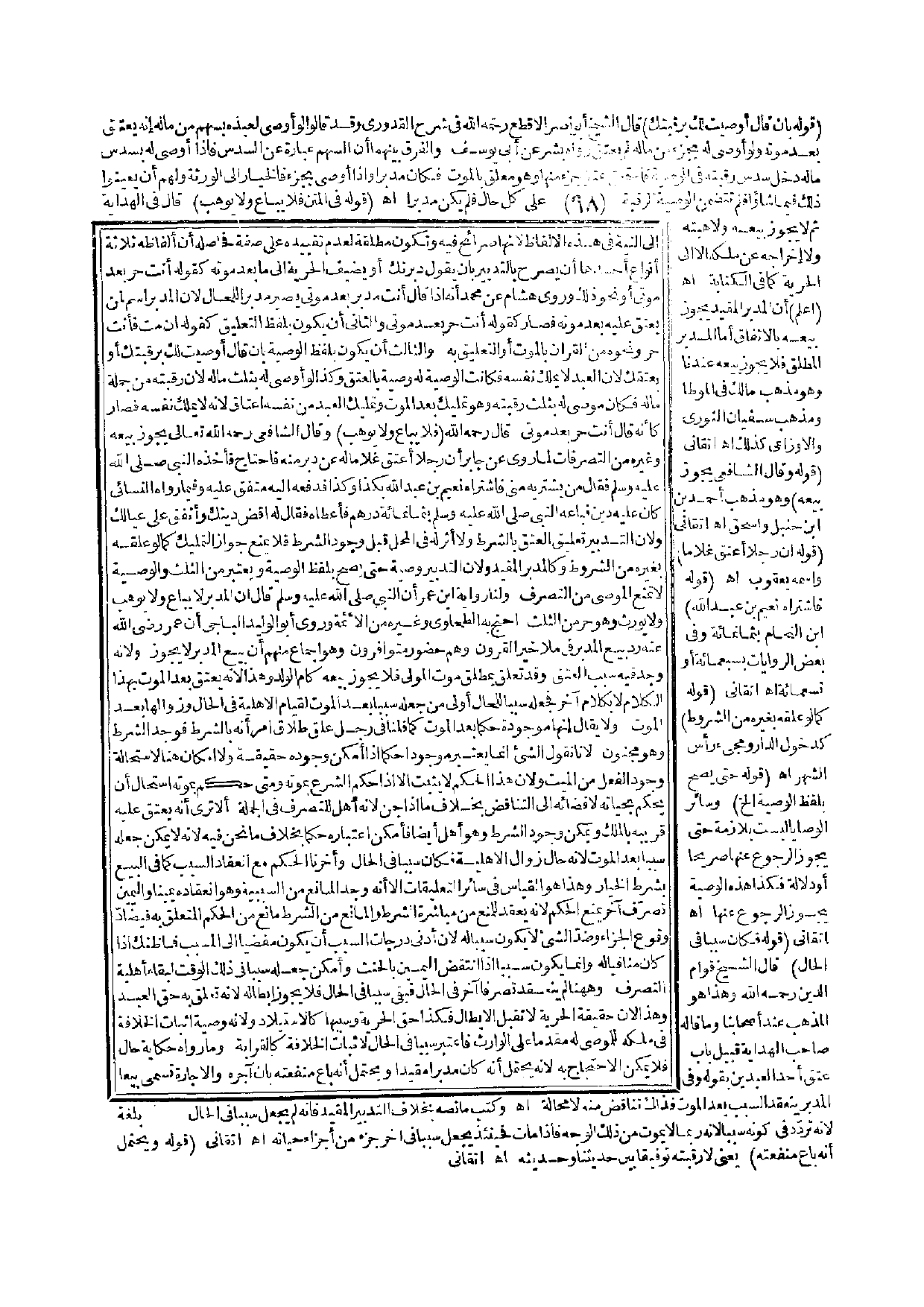 (قَوْلُهُ فِي الْمَتْنِ فَلَا يُبَاعُ وَلَا يُوهَبُ) قَالَ فِي الْهِدَايَةِ ثُمَّ لَا يَجُوزُ بَيْعُهُ وَلَا هِبَتُهُ وَلَا إخْرَاجُهُ عَنْ مِلْكِهِ إلَّا إلَى الْحُرِّيَّةِ كَمَا فِي الْكِتَابَةِ. اهـ. (اعْلَمْ) أَنَّ الْمُدَبَّرَ الْمُقَيَّدَ يَجُوزُ بَيْعُهُ بِالِاتِّفَاقِ أَمَّا الْمُدَبَّرُ الْمُطْلَقُ فَلَا يَجُوزُ بَيْعُهُ عِنْدَنَا وَهُوَ مَذْهَبُ مَالِكٍ فِي الْمُوَطَّإِ وَمَذْهَبُ سُفْيَانَ الثَّوْرِيِّ وَالْأَوْزَاعِيِّ كَذَلِكَ. اهـ. أَتْقَانِيٌّ (قَوْلُهُ وَقَالَ الشَّافِعِيُّ يَجُوزُ بَيْعُهُ) وَهُوَ مَذْهَبُ أَحْمَدَ بْنِ حَنْبَلٍ وَإِسْحَاقَ. اهـ. أَتْقَانِيٌّ (قَوْلُهُ إنَّ رَجُلًا أَعْتَقَ غُلَامًا) وَاسْمُهُ يَعْقُوبُ. اهـ. (قَوْلُهُ فَاشْتَرَاهُ نُعَيْمُ بْنُ عَبْدِ اللَّهِ) ابْنُ النَّحَّامِ بِثَمَانِمِائَةٍ وَفِي بَعْضِ الرِّوَايَاتِ بِسَبْعِمِائَةٍ أَوْ تِسْعِمِائَةٍ اهـ أَتْقَانِيٌّ (قَوْلُهُ كَمَا لَوْ عَلَّقَهُ بِغَيْرِهِ مِنْ الشُّرُوطِ) كَدُخُولِ الدَّارِ وَمَجِيءُ رَأْسِ الشَّهْرِ. اهـ. (قَوْلُهُ حَتَّى يَصِحَّ بِلَفْظِ الْوَصِيَّةِ إلَخْ) وَسَائِرُ الْوَصَايَا لَيْسَتْ بِلَازِمَةٍ حَتَّى يَجُوزَ الرُّجُوعُ عَنْهَا صَرِيحًا أَوْ دَلَالَةً فَكَذَا هَذِهِ الْوَصِيَّةُ يَجُوزُ الرُّجُوعُ عَنْهَا. اهـ. أَتْقَانِيٌّ