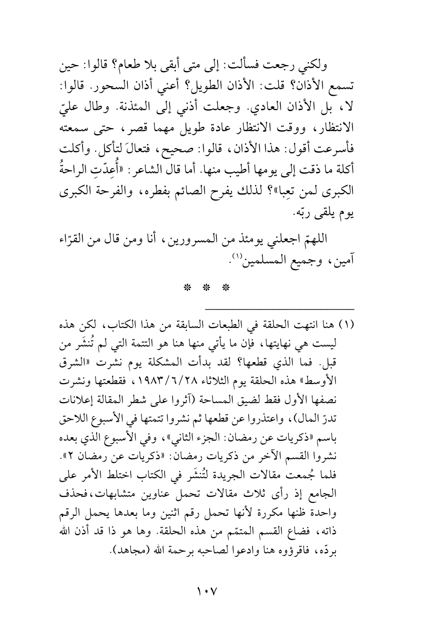 (¬1) هنا انتهت الحلقة في الطبعات السابقة من هذا الكتاب، لكن هذه ليست هي نهايتها، فإن ما يأتي منها هنا هو التتمة التي لمتُنشَرمن قبل. فما الذي قطعها؟ لقد بدأت المشكلة يوم نشرت «الشرق الأوسط» هذه الحلقة يوم الثلاثاء 28/ 6/1983، فقطعتها ونشرت نصفها الأول فقط لضيق المساحة (آثروا على شطر المقالة إعلانات تدرّ المال)، واعتذروا عن قطعها ثم نشروا تتمتها في الأسبوع اللاحق باسم «ذكريات عن رمضان: الجزء الثاني»، وفي الأسبوع الذي بعده نشروا القسم الآخر من ذكريات رمضان: «ذكريات عن رمضان 2». فلما جُمعت مقالات الجريدة لتُنشَر في الكتاب اختلط الأمر على الجامع إذ رأى ثلاث مقالات تحمل عناوين متشابهات، فحذف واحدة ظنها مكررة لأنها تحمل رقم اثنين وما بعدها يحمل الرقم ذاته، فضاع القسم المتمّم من هذه الحلقة. وها هو ذا قد أذن الله بردّه، فاقرؤوه هنا وادعوا لصاحبه برحمة الله (مجاهد).