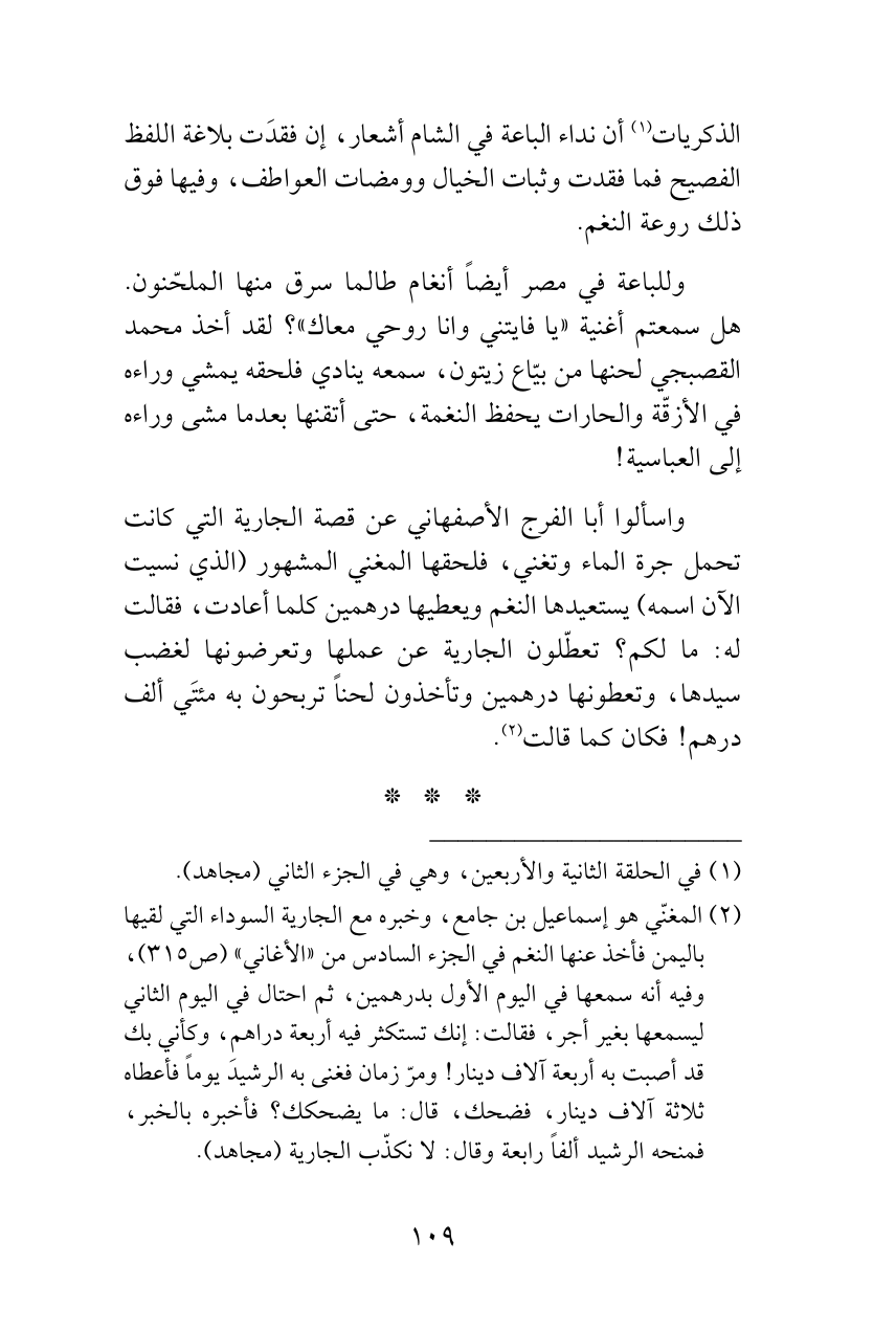 واسألوا أبا الفرج الأصفهاني عن قصة الجارية التي كانت تحمل جرة الماء وتغني، فلحقها المغني المشهور (الذي نسيت الآن اسمه) يستعيدها النغم ويعطيها درهمين كلما أعادت، فقالت له: ما لكم؟ تعطّلون الجارية عن عملها وتعرضونها لغضب سيدها، وتعطونها درهمين وتأخذون لحناً تربحون به مئتَي ألف درهم! فكان كما قالت (¬2).