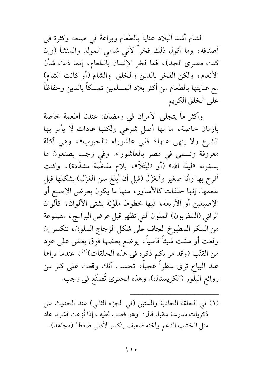 وأكثر ما يتجلى الأمران في رمضان: عندنا أطعمة خاصة بأزمان خاصة، ما لها أصل شرعي ولكنها عادات لا يأمر بها الشرع ولا ينهى عنها؛ ففي عاشوراء «الحبوب»، وهي أكلة معروفة وتسمى في مصر بالعاشوراء. وفي رجب يصنعون ما يسمّونه «ليلة الله» (أو «ليتَلاّ»، بلام مفخَّمة مشدَّدة)، وكنت أفرح بها وأنا صغير وأتغزّل (قبل أن أبلغ سن الغزَل) بشكلها قبل طعمها. إنها حلقات كالأساور، منها ما يكون بعرض الإصبع أو الإصبعين أو الأربعة، فيها خطوط ملوَّنة بشتى الألوان، كألوان الرائي (التلفزيون) الملون التي تظهر قبل عرض البرامج، مصنوعة من السكر المطبوخ الجاف على شكل الزجاج الملون، تنكسر إن وقعت أو مسّت شيئاً قاسياً، يوضع بعضها فوق بعض على عود من القنّب (وقد مر بكم ذكره في هذه الحلقات) (¬1)، عندما تراها عند البياع ترى منظراً عجباً، تحسب أنك وقعت على كنز من روائع البلّور (الكريستال). وهذه الحلوى تُصنَع في رجب.