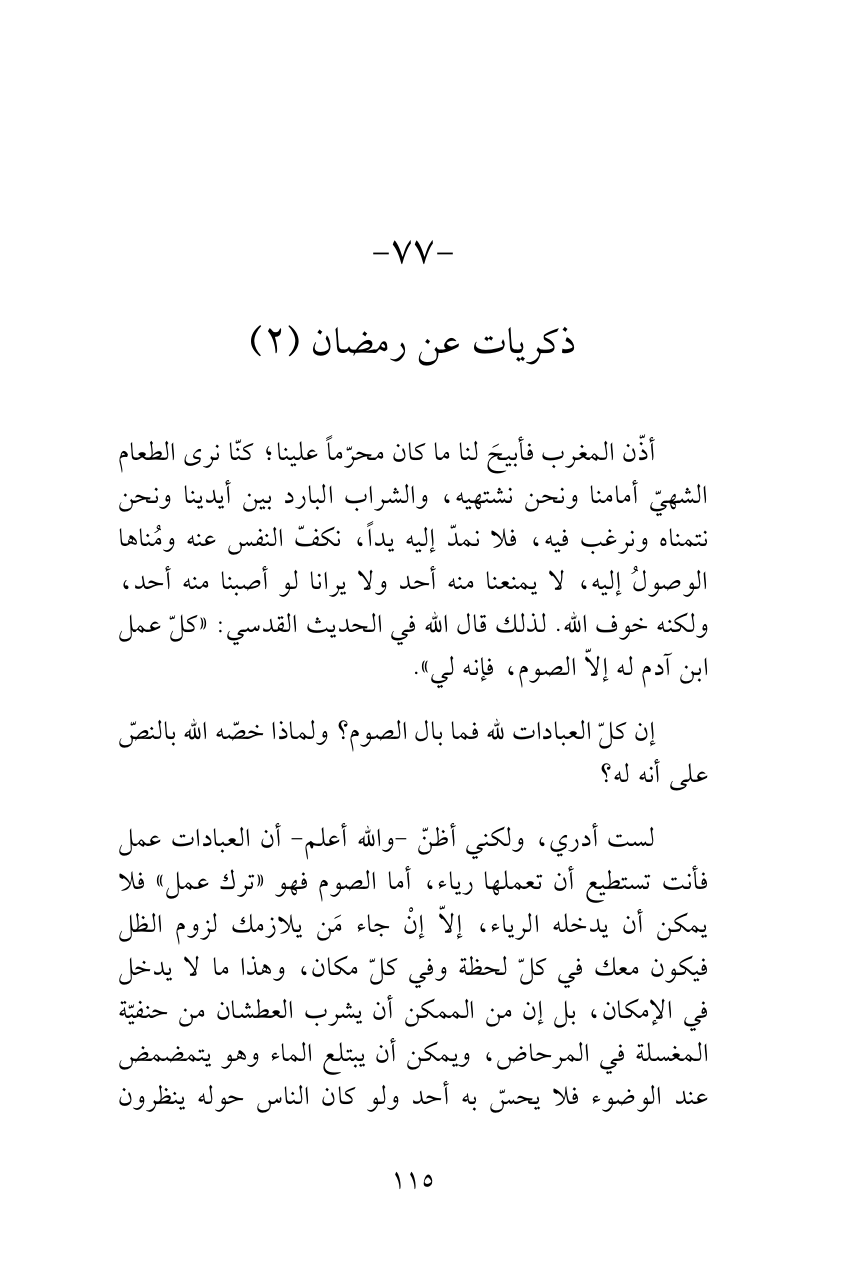 أذّن المغرب فأبيحَ لنا ما كان محرّماً علينا؛ كنّا نرى الطعام الشهيّ أمامنا ونحن نشتهيه، والشراب البارد بين أيدينا ونحن نتمناه ونرغب فيه، فلا نمدّ إليه يداً، نكفّ النفس عنه ومُناها الوصولُ إليه، لا يمنعنا منه أحد ولا يرانا لو أصبنا منه أحد، ولكنه خوف الله. لذلك قال الله في الحديث القدسي: «كلّ عمل ابن آدم له إلاّ الصوم، فإنه لي».