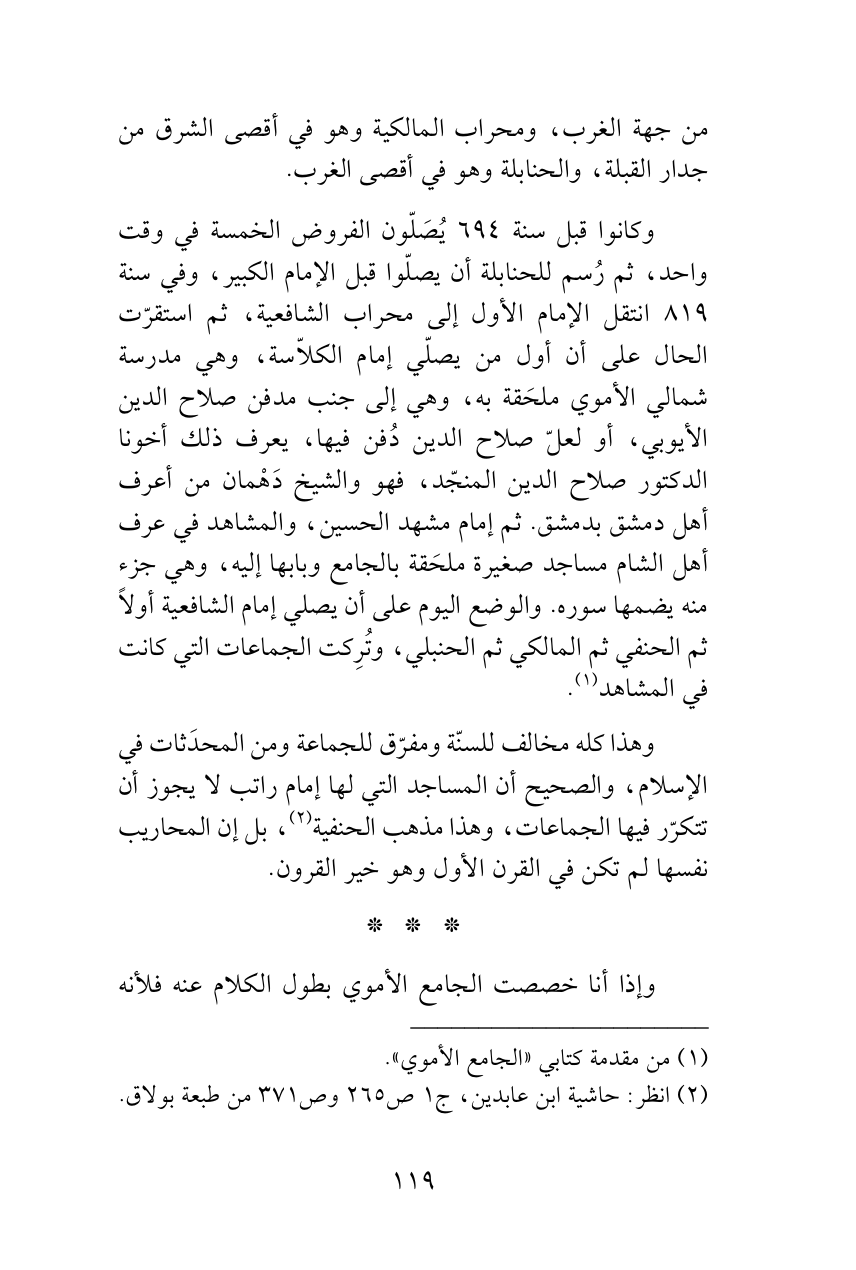 وكانوا قبل سنة 694 يُصَلّون الفروض الخمسة في وقت واحد، ثم رُسم للحنابلة أن يصلّوا قبل الإمام الكبير، وفي سنة 819 انتقل الإمام الأول إلى محراب الشافعية، ثم استقرّت الحال على أن أول من يصلّي إمام الكلاّسة، وهي مدرسة شمالي الأموي ملحَقة به، وهي إلى جنب مدفن صلاح الدين الأيوبي، أو لعلّ صلاح الدين دُفن فيها، يعرف ذلك أخونا الدكتور صلاح الدين المنجّد، فهو والشيخ دَهْمان من أعرف أهل دمشق بدمشق. ثم إمام مشهد الحسين، والمشاهد في عرف أهل الشام مساجد صغيرة ملحَقة بالجامع وبابها إليه، وهي جزء منه يضمها سوره. والوضع اليوم على أن يصلي إمام الشافعية أولاً ثم الحنفي ثم المالكي ثم الحنبلي، وتُرِكت الجماعات التي كانت في المشاهد (¬1).