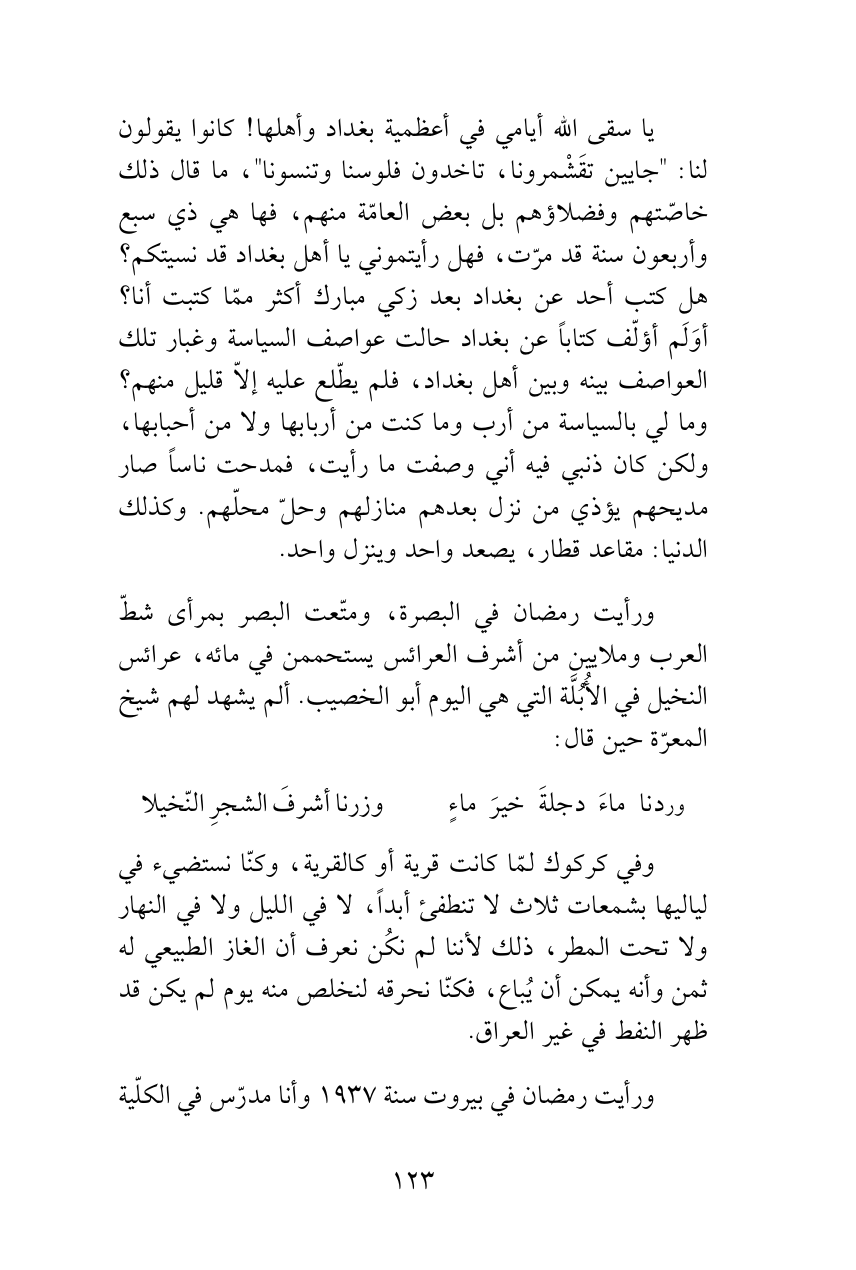 يا سقى الله أيامي في أعظمية بغداد وأهلها! كانوا يقولون لنا: "جايين تقَشْمرونا، تاخدون فلوسنا وتنسونا"، ما قال ذلك خاصّتهم وفضلاؤهم بل بعض العامّة منهم، فها هي ذي سبع وأربعون سنة قد مرّت، فهل رأيتموني يا أهل بغداد قد نسيتكم؟ هل كتب أحد عن بغداد بعد زكي مبارك أكثر ممّا كتبت أنا؟ أوَلَم أؤلّف كتاباً عن بغداد حالت عواصف السياسة وغبار تلك العواصف بينه وبين أهل بغداد، فلم يطّلع عليه إلاّ قليل منهم؟ وما لي بالسياسة من أرب وما كنت من أربابها ولا من أحبابها، ولكن كان ذنبي فيه أني وصفت ما رأيت، فمدحت ناساً صار مديحهم يؤذي من نزل بعدهم منازلهم وحلّ محلّهم. وكذلك الدنيا: مقاعد قطار، يصعد واحد وينزل واحد.