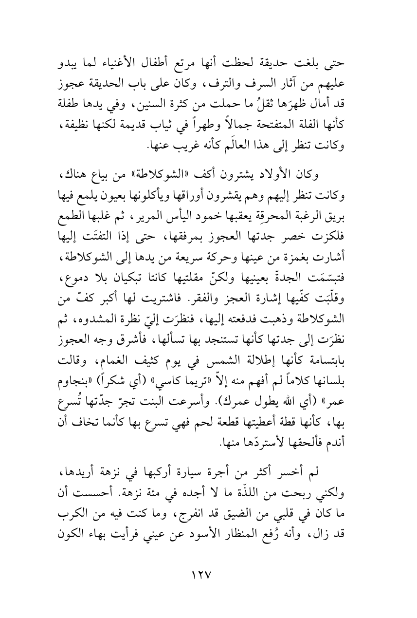 وكان الأولاد يشترون أكف «الشوكلاطة» من بياع هناك، وكانت تنظر إليهم وهم يقشرون أوراقها ويأكلونها بعيون يلمع فيها بريق الرغبة المحرقِة يعقبها خمود اليأس المرير، ثم غلبها الطمع فلكزت خصر جدتها العجوز بمرفقها، حتى إذا التفتَت إليها أشارت بغمزة من عينها وحركة سريعة من يدها إلى الشوكلاطة، فتبسّمَت الجدةّ بعينيها ولكنّ مقلتيها كانتا تبكيان بلا دموع، وقلّبَت كفّيها إشارة العجز والفقر. فاشتريت لها أكبر كفّ من الشوكلاطة وذهبت فدفعته إليها، فنظرَت إليّ نظرة المشدوه، ثم نظرَت إلى جدتها كأنها تستنجد بها تسألها، فأشرق وجه العجوز بابتسامة كأنها إطلالة الشمس في يوم كثيف الغمام، وقالت بلسانها كلاماً لم أفهم منه إلاّ «تريما كاسي» (أي شكراً) «بنجاوم عمر» (أي الله يطول عمرك). وأسرعت البنت تجرّ جدّتها تُسرع بها، كأنها قطة أعطيتها قطعة لحم فهي تسرع بها كأنما تخاف أن أندم فألحقها لأستردّها منها.