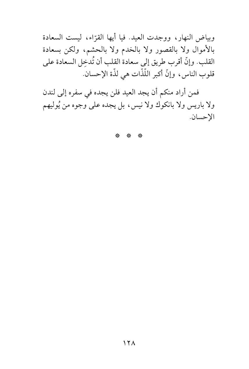 وبياض النهار، ووجدت العيد. فيا أيها القرّاء، ليست السعادة بالأموال ولا بالقصور ولا بالخدم ولا بالحشم، ولكن بسعادة القلب. وإنّ أقرب طريق إلى سعادة القلب أن تُدخِل السعادة على قلوب الناس، وإنّ أكبر اللّذّات هي لذّة الإحسان.
