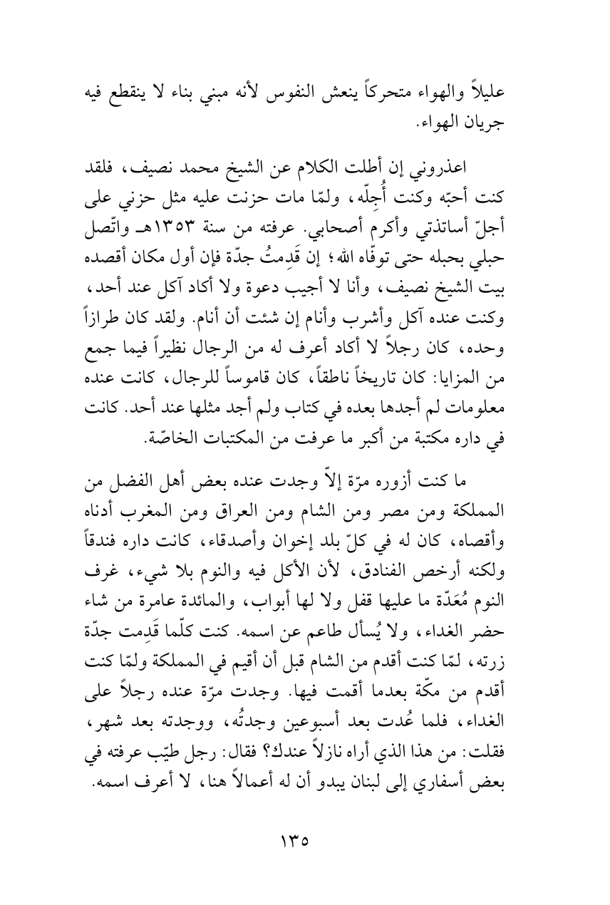 اعذروني إن أطلت الكلام عن الشيخ محمد نصيف، فلقد كنت أحبّه وكنت أُجِلّه، ولمّا مات حزنت عليه مثل حزني على أجلّ أساتذتي وأكرم أصحابي. عرفته من سنة 1353هـ واتّصل حبلي بحبله حتى توفّاه الله؛ إن قَدِمتُ جدّة فإن أول مكان أقصده بيت الشيخ نصيف، وأنا لا أجيب دعوة ولا أكاد آكل عند أحد، وكنت عنده آكل وأشرب وأنام إن شئت أن أنام. ولقد كان طرازاً وحده، كان رجلاً لا أكاد أعرف له من الرجال نظيراً فيما جمع من المزايا: كان تاريخاً ناطقاً، كان قاموساً للرجال، كانت عنده معلومات لم أجدها بعده في كتاب ولم أجد مثلها عند أحد. كانت في داره مكتبة من أكبر ما عرفت من المكتبات الخاصّة.