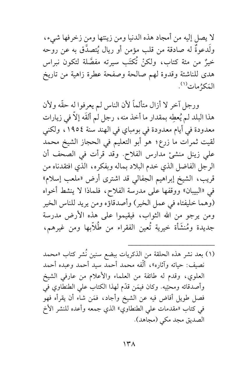 ورجل آخر لا أزال متألماً لأن الناس لم يعرفوا له حقّه ولأن هذا البلد لم يُعطِه بمقدار ما أخذ منه، رجل لم ألقَه إلاّ في زيارات معدودة في أيام معدودة في بومباي في الهند سنة 1954، ولكني لقيت ثمرات ما زرع؛ هو أبو التعليم في الحجاز الشيخ محمد علي زينل منشئ مدارس الفلاح. وقد قرأت في الصحف أن الرجل الفاضل الذي خدم البلاد بماله وبفكره، الذي افتقدناه من قريب، الشيخ إبراهيم الجفالي قد اشترى أرض «ملعب إسلام» في «البيبان» ووقفها على مدرسة الفلاح، فلماذا لا ينشط أخواه (وهما خليفتاه في عمل الخير) وأصدقاؤه ومن يريد للناس الخير ومن يرجو من الله الثواب، فيقيموا على هذه الأرض مدرسة جديدة ومُنشَأة خيرية تُعين الفقراء من طُلاّبها ومن غيرهم،